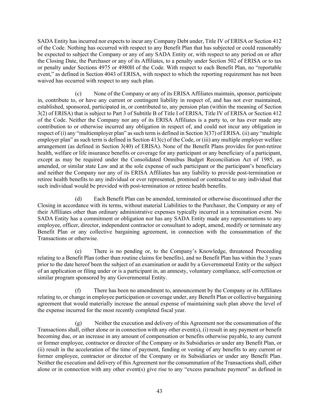 43 SADA Entity has incurred nor expects to incur any Company Debt under, Title IV of ERISA or Section 412 of the Code. Nothing has occurred with respect to any Benefit Plan that has subjected or could reasonably be expected to subject the Company or any of any SADA Entity or, with respect to any period on or after the Closing Date, the Purchaser or any of its Affiliates, to a penalty under Section 502 of ERISA or to tax or penalty under Sections 4975 or 4980H of the Code. With respect to each Benefit Plan, no “reportable event,” as defined in Section 4043 of ERISA, with respect to which the reporting requirement has not been waived has occurred with respect to any such plan. (c) None of the Company or any of its ERISA Affiliates maintain, sponsor, participate in, contribute to, or have any current or contingent liability in respect of, and has not ever maintained, established, sponsored, participated in, or contributed to, any pension plan (within the meaning of Section 3(2) of ERISA) that is subject to Part 3 of Subtitle B of Title I of ERISA, Title IV of ERISA or Section 412 of the Code. Neither the Company nor any of its ERISA Affiliates is a party to, or has ever made any contribution to or otherwise incurred any obligation in respect of, and could not incur any obligation in respect of (i) any “multiemployer plan” as such term is defined in Section 3(37) of ERISA. (ii) any “multiple employer plan” as such term is defined in Section 413(c) of the Code, or (iii) any multiple employer welfare arrangement (as defined in Section 3(40) of ERISA). None of the Benefit Plans provides for post-retiree health, welfare or life insurance benefits or coverage for any participant or any beneficiary of a participant, except as may be required under the Consolidated Omnibus Budget Reconciliation Act of 1985, as amended, or similar state Law and at the sole expense of such participant or the participant’s beneficiary and neither the Company nor any of its ERISA Affiliates has any liability to provide post-termination or retiree health benefits to any individual or ever represented, promised or contracted to any individual that such individual would be provided with post-termination or retiree health benefits. (d) Each Benefit Plan can be amended, terminated or otherwise discontinued after the Closing in accordance with its terms, without material Liabilities to the Purchaser, the Company or any of their Affiliates other than ordinary administrative expenses typically incurred in a termination event. No SADA Entity has a commitment or obligation nor has any SADA Entity made any representations to any employee, officer, director, independent contractor or consultant to adopt, amend, modify or terminate any Benefit Plan or any collective bargaining agreement, in connection with the consummation of the Transactions or otherwise. (e) There is no pending or, to the Company’s Knowledge, threatened Proceeding relating to a Benefit Plan (other than routine claims for benefits), and no Benefit Plan has within the 3 years prior to the date hereof been the subject of an examination or audit by a Governmental Entity or the subject of an application or filing under or is a participant in, an amnesty, voluntary compliance, self-correction or similar program sponsored by any Governmental Entity. (f) There has been no amendment to, announcement by the Company or its Affiliates relating to, or change in employee participation or coverage under, any Benefit Plan or collective bargaining agreement that would materially increase the annual expense of maintaining such plan above the level of the expense incurred for the most recently completed fiscal year. (g) Neither the execution and delivery of this Agreement nor the consummation of the Transactions shall, either alone or in connection with any other event(s), (i) result in any payment or benefit becoming due, or an increase in any amount of compensation or benefits otherwise payable, to any current or former employee, contractor or director of the Company or its Subsidiaries or under any Benefit Plan, or (ii) result in the acceleration of the time of payment, funding or vesting of any benefits to any current or former employee, contractor or director of the Company or its Subsidiaries or under any Benefit Plan. Neither the execution and delivery of this Agreement nor the consummation of the Transactions shall, either alone or in connection with any other event(s) give rise to any “excess parachute payment” as defined in