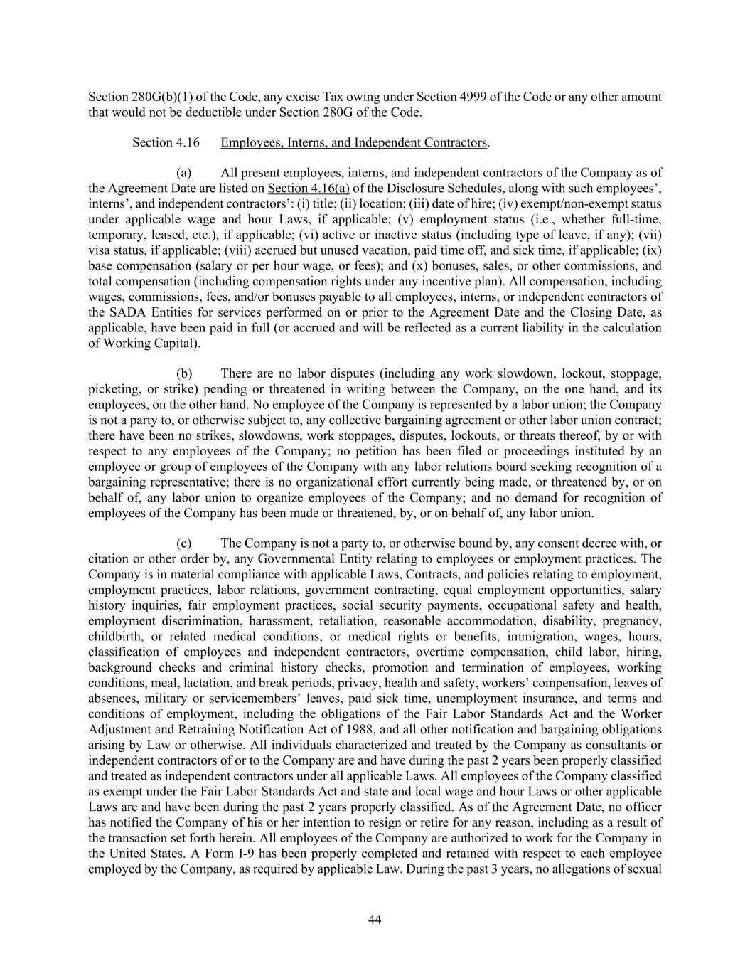 44 Section 280G(b)(1) of the Code, any excise Tax owing under Section 4999 of the Code or any other amount that would not be deductible under Section 280G of the Code. Section 4.16 Employees, Interns, and Independent Contractors. (a) All present employees, interns, and independent contractors of the Company as of the Agreement Date are listed on Section 4.16(a) of the Disclosure Schedules, along with such employees’, interns’, and independent contractors’: (i) title; (ii) location; (iii) date of hire; (iv) exempt/non-exempt status under applicable wage and hour Laws, if applicable; (v) employment status (i.e., whether full-time, temporary, leased, etc.), if applicable; (vi) active or inactive status (including type of leave, if any); (vii) visa status, if applicable; (viii) accrued but unused vacation, paid time off, and sick time, if applicable; (ix) base compensation (salary or per hour wage, or fees); and (x) bonuses, sales, or other commissions, and total compensation (including compensation rights under any incentive plan). All compensation, including wages, commissions, fees, and/or bonuses payable to all employees, interns, or independent contractors of the SADA Entities for services performed on or prior to the Agreement Date and the Closing Date, as applicable, have been paid in full (or accrued and will be reflected as a current liability in the calculation of Working Capital). (b) There are no labor disputes (including any work slowdown, lockout, stoppage, picketing, or strike) pending or threatened in writing between the Company, on the one hand, and its employees, on the other hand. No employee of the Company is represented by a labor union; the Company is not a party to, or otherwise subject to, any collective bargaining agreement or other labor union contract; there have been no strikes, slowdowns, work stoppages, disputes, lockouts, or threats thereof, by or with respect to any employees of the Company; no petition has been filed or proceedings instituted by an employee or group of employees of the Company with any labor relations board seeking recognition of a bargaining representative; there is no organizational effort currently being made, or threatened by, or on behalf of, any labor union to organize employees of the Company; and no demand for recognition of employees of the Company has been made or threatened, by, or on behalf of, any labor union. (c) The Company is not a party to, or otherwise bound by, any consent decree with, or citation or other order by, any Governmental Entity relating to employees or employment practices. The Company is in material compliance with applicable Laws, Contracts, and policies relating to employment, employment practices, labor relations, government contracting, equal employment opportunities, salary history inquiries, fair employment practices, social security payments, occupational safety and health, employment discrimination, harassment, retaliation, reasonable accommodation, disability, pregnancy, childbirth, or related medical conditions, or medical rights or benefits, immigration, wages, hours, classification of employees and independent contractors, overtime compensation, child labor, hiring, background checks and criminal history checks, promotion and termination of employees, working conditions, meal, lactation, and break periods, privacy, health and safety, workers’ compensation, leaves of absences, military or servicemembers’ leaves, paid sick time, unemployment insurance, and terms and conditions of employment, including the obligations of the Fair Labor Standards Act and the Worker Adjustment and Retraining Notification Act of 1988, and all other notification and bargaining obligations arising by Law or otherwise. All individuals characterized and treated by the Company as consultants or independent contractors of or to the Company are and have during the past 2 years been properly classified and treated as independent contractors under all applicable Laws. All employees of the Company classified as exempt under the Fair Labor Standards Act and state and local wage and hour Laws or other applicable Laws are and have been during the past 2 years properly classified. As of the Agreement Date, no officer has notified the Company of his or her intention to resign or retire for any reason, including as a result of the transaction set forth herein. All employees of the Company are authorized to work for the Company in the United States. A Form I-9 has been properly completed and retained with respect to each employee employed by the Company, as required by applicable Law. During the past 3 years, no allegations of sexual