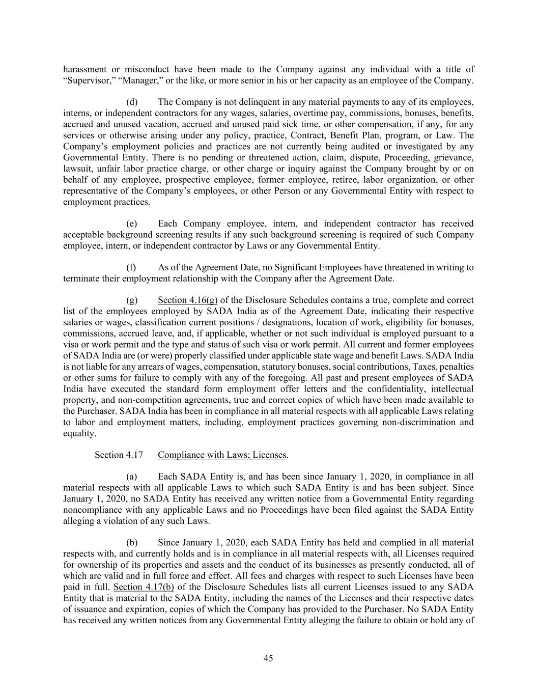 45 harassment or misconduct have been made to the Company against any individual with a title of “Supervisor,” “Manager,” or the like, or more senior in his or her capacity as an employee of the Company. (d) The Company is not delinquent in any material payments to any of its employees, interns, or independent contractors for any wages, salaries, overtime pay, commissions, bonuses, benefits, accrued and unused vacation, accrued and unused paid sick time, or other compensation, if any, for any services or otherwise arising under any policy, practice, Contract, Benefit Plan, program, or Law. The Company’s employment policies and practices are not currently being audited or investigated by any Governmental Entity. There is no pending or threatened action, claim, dispute, Proceeding, grievance, lawsuit, unfair labor practice charge, or other charge or inquiry against the Company brought by or on behalf of any employee, prospective employee, former employee, retiree, labor organization, or other representative of the Company’s employees, or other Person or any Governmental Entity with respect to employment practices. (e) Each Company employee, intern, and independent contractor has received acceptable background screening results if any such background screening is required of such Company employee, intern, or independent contractor by Laws or any Governmental Entity. (f) As of the Agreement Date, no Significant Employees have threatened in writing to terminate their employment relationship with the Company after the Agreement Date. (g) Section 4.16(g) of the Disclosure Schedules contains a true, complete and correct list of the employees employed by SADA India as of the Agreement Date, indicating their respective salaries or wages, classification current positions / designations, location of work, eligibility for bonuses, commissions, accrued leave, and, if applicable, whether or not such individual is employed pursuant to a visa or work permit and the type and status of such visa or work permit. All current and former employees of SADA India are (or were) properly classified under applicable state wage and benefit Laws. SADA India is not liable for any arrears of wages, compensation, statutory bonuses, social contributions, Taxes, penalties or other sums for failure to comply with any of the foregoing. All past and present employees of SADA India have executed the standard form employment offer letters and the confidentiality, intellectual property, and non-competition agreements, true and correct copies of which have been made available to the Purchaser. SADA India has been in compliance in all material respects with all applicable Laws relating to labor and employment matters, including, employment practices governing non-discrimination and equality. Section 4.17 Compliance with Laws; Licenses. (a) Each SADA Entity is, and has been since January 1, 2020, in compliance in all material respects with all applicable Laws to which such SADA Entity is and has been subject. Since January 1, 2020, no SADA Entity has received any written notice from a Governmental Entity regarding noncompliance with any applicable Laws and no Proceedings have been filed against the SADA Entity alleging a violation of any such Laws. (b) Since January 1, 2020, each SADA Entity has held and complied in all material respects with, and currently holds and is in compliance in all material respects with, all Licenses required for ownership of its properties and assets and the conduct of its businesses as presently conducted, all of which are valid and in full force and effect. All fees and charges with respect to such Licenses have been paid in full. Section 4.17(b) of the Disclosure Schedules lists all current Licenses issued to any SADA Entity that is material to the SADA Entity, including the names of the Licenses and their respective dates of issuance and expiration, copies of which the Company has provided to the Purchaser. No SADA Entity has received any written notices from any Governmental Entity alleging the failure to obtain or hold any of