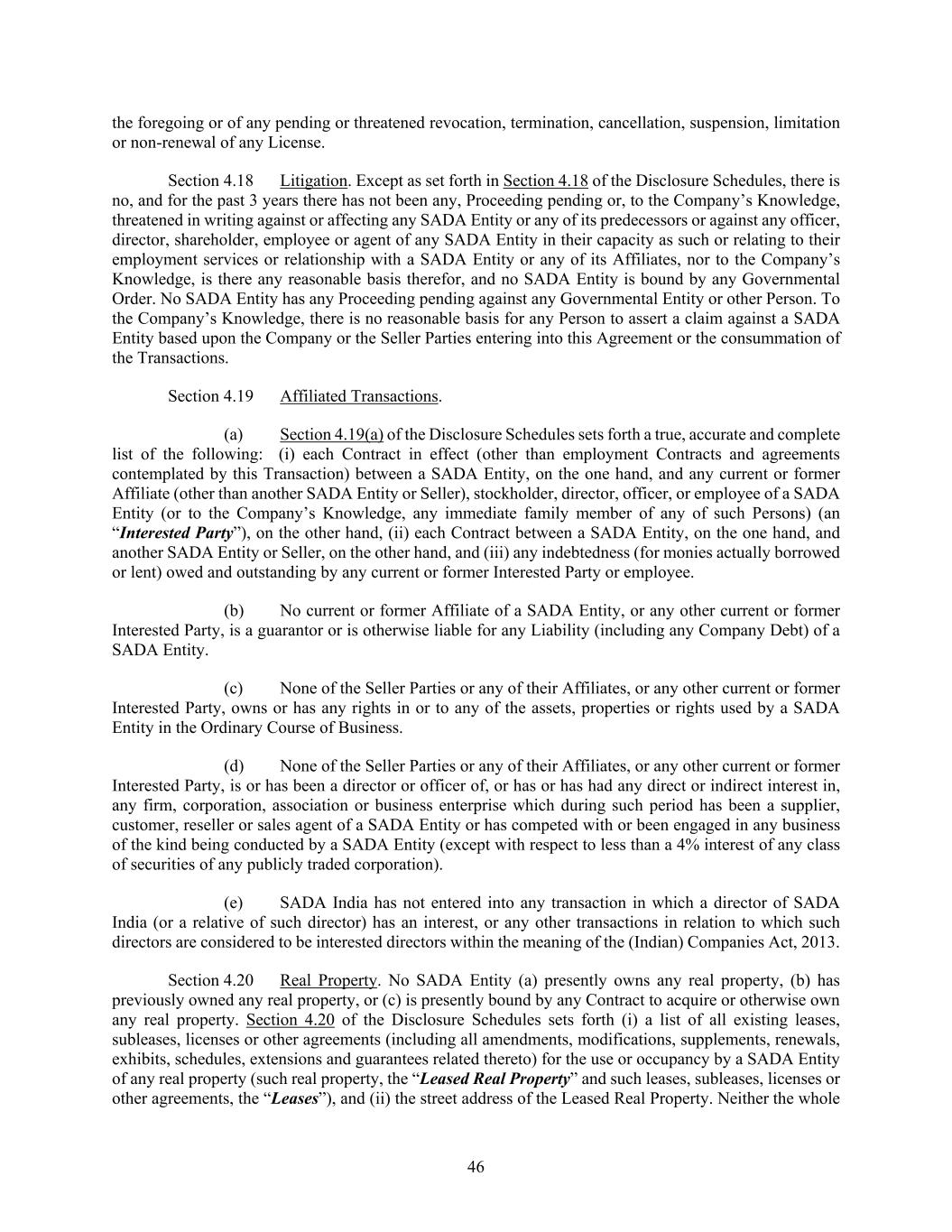 46 the foregoing or of any pending or threatened revocation, termination, cancellation, suspension, limitation or non-renewal of any License. Section 4.18 Litigation. Except as set forth in Section 4.18 of the Disclosure Schedules, there is no, and for the past 3 years there has not been any, Proceeding pending or, to the Company’s Knowledge, threatened in writing against or affecting any SADA Entity or any of its predecessors or against any officer, director, shareholder, employee or agent of any SADA Entity in their capacity as such or relating to their employment services or relationship with a SADA Entity or any of its Affiliates, nor to the Company’s Knowledge, is there any reasonable basis therefor, and no SADA Entity is bound by any Governmental Order. No SADA Entity has any Proceeding pending against any Governmental Entity or other Person. To the Company’s Knowledge, there is no reasonable basis for any Person to assert a claim against a SADA Entity based upon the Company or the Seller Parties entering into this Agreement or the consummation of the Transactions. Section 4.19 Affiliated Transactions. (a) Section 4.19(a) of the Disclosure Schedules sets forth a true, accurate and complete list of the following: (i) each Contract in effect (other than employment Contracts and agreements contemplated by this Transaction) between a SADA Entity, on the one hand, and any current or former Affiliate (other than another SADA Entity or Seller), stockholder, director, officer, or employee of a SADA Entity (or to the Company’s Knowledge, any immediate family member of any of such Persons) (an “Interested Party”), on the other hand, (ii) each Contract between a SADA Entity, on the one hand, and another SADA Entity or Seller, on the other hand, and (iii) any indebtedness (for monies actually borrowed or lent) owed and outstanding by any current or former Interested Party or employee. (b) No current or former Affiliate of a SADA Entity, or any other current or former Interested Party, is a guarantor or is otherwise liable for any Liability (including any Company Debt) of a SADA Entity. (c) None of the Seller Parties or any of their Affiliates, or any other current or former Interested Party, owns or has any rights in or to any of the assets, properties or rights used by a SADA Entity in the Ordinary Course of Business. (d) None of the Seller Parties or any of their Affiliates, or any other current or former Interested Party, is or has been a director or officer of, or has or has had any direct or indirect interest in, any firm, corporation, association or business enterprise which during such period has been a supplier, customer, reseller or sales agent of a SADA Entity or has competed with or been engaged in any business of the kind being conducted by a SADA Entity (except with respect to less than a 4% interest of any class of securities of any publicly traded corporation). (e) SADA India has not entered into any transaction in which a director of SADA India (or a relative of such director) has an interest, or any other transactions in relation to which such directors are considered to be interested directors within the meaning of the (Indian) Companies Act, 2013. Section 4.20 Real Property. No SADA Entity (a) presently owns any real property, (b) has previously owned any real property, or (c) is presently bound by any Contract to acquire or otherwise own any real property. Section 4.20 of the Disclosure Schedules sets forth (i) a list of all existing leases, subleases, licenses or other agreements (including all amendments, modifications, supplements, renewals, exhibits, schedules, extensions and guarantees related thereto) for the use or occupancy by a SADA Entity of any real property (such real property, the “Leased Real Property” and such leases, subleases, licenses or other agreements, the “Leases”), and (ii) the street address of the Leased Real Property. Neither the whole