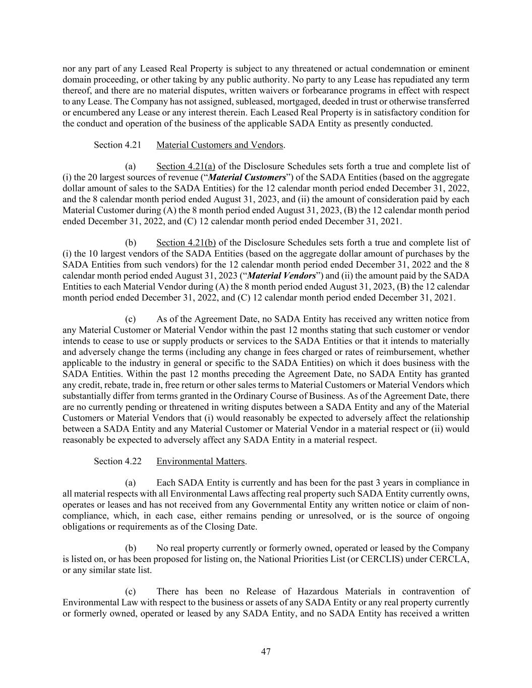 47 nor any part of any Leased Real Property is subject to any threatened or actual condemnation or eminent domain proceeding, or other taking by any public authority. No party to any Lease has repudiated any term thereof, and there are no material disputes, written waivers or forbearance programs in effect with respect to any Lease. The Company has not assigned, subleased, mortgaged, deeded in trust or otherwise transferred or encumbered any Lease or any interest therein. Each Leased Real Property is in satisfactory condition for the conduct and operation of the business of the applicable SADA Entity as presently conducted. Section 4.21 Material Customers and Vendors. (a) Section 4.21(a) of the Disclosure Schedules sets forth a true and complete list of (i) the 20 largest sources of revenue (“Material Customers”) of the SADA Entities (based on the aggregate dollar amount of sales to the SADA Entities) for the 12 calendar month period ended December 31, 2022, and the 8 calendar month period ended August 31, 2023, and (ii) the amount of consideration paid by each Material Customer during (A) the 8 month period ended August 31, 2023, (B) the 12 calendar month period ended December 31, 2022, and (C) 12 calendar month period ended December 31, 2021. (b) Section 4.21(b) of the Disclosure Schedules sets forth a true and complete list of (i) the 10 largest vendors of the SADA Entities (based on the aggregate dollar amount of purchases by the SADA Entities from such vendors) for the 12 calendar month period ended December 31, 2022 and the 8 calendar month period ended August 31, 2023 (“Material Vendors”) and (ii) the amount paid by the SADA Entities to each Material Vendor during (A) the 8 month period ended August 31, 2023, (B) the 12 calendar month period ended December 31, 2022, and (C) 12 calendar month period ended December 31, 2021. (c) As of the Agreement Date, no SADA Entity has received any written notice from any Material Customer or Material Vendor within the past 12 months stating that such customer or vendor intends to cease to use or supply products or services to the SADA Entities or that it intends to materially and adversely change the terms (including any change in fees charged or rates of reimbursement, whether applicable to the industry in general or specific to the SADA Entities) on which it does business with the SADA Entities. Within the past 12 months preceding the Agreement Date, no SADA Entity has granted any credit, rebate, trade in, free return or other sales terms to Material Customers or Material Vendors which substantially differ from terms granted in the Ordinary Course of Business. As of the Agreement Date, there are no currently pending or threatened in writing disputes between a SADA Entity and any of the Material Customers or Material Vendors that (i) would reasonably be expected to adversely affect the relationship between a SADA Entity and any Material Customer or Material Vendor in a material respect or (ii) would reasonably be expected to adversely affect any SADA Entity in a material respect. Section 4.22 Environmental Matters. (a) Each SADA Entity is currently and has been for the past 3 years in compliance in all material respects with all Environmental Laws affecting real property such SADA Entity currently owns, operates or leases and has not received from any Governmental Entity any written notice or claim of non- compliance, which, in each case, either remains pending or unresolved, or is the source of ongoing obligations or requirements as of the Closing Date. (b) No real property currently or formerly owned, operated or leased by the Company is listed on, or has been proposed for listing on, the National Priorities List (or CERCLIS) under CERCLA, or any similar state list. (c) There has been no Release of Hazardous Materials in contravention of Environmental Law with respect to the business or assets of any SADA Entity or any real property currently or formerly owned, operated or leased by any SADA Entity, and no SADA Entity has received a written