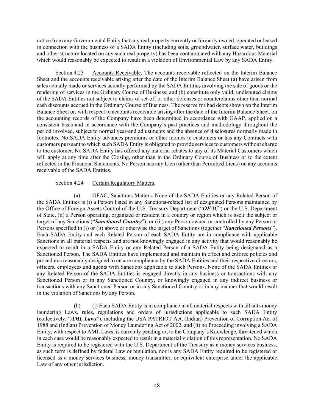 48 notice from any Governmental Entity that any real property currently or formerly owned, operated or leased in connection with the business of a SADA Entity (including soils, groundwater, surface water, buildings and other structure located on any such real property) has been contaminated with any Hazardous Material which would reasonably be expected to result in a violation of Environmental Law by any SADA Entity. Section 4.23 Accounts Receivable. The accounts receivable reflected on the Interim Balance Sheet and the accounts receivable arising after the date of the Interim Balance Sheet (a) have arisen from sales actually made or services actually performed by the SADA Entities involving the sale of goods or the rendering of services in the Ordinary Course of Business; and (b) constitute only valid, undisputed claims of the SADA Entities not subject to claims of set-off or other defenses or counterclaims other than normal cash discounts accrued in the Ordinary Course of Business. The reserve for bad debts shown on the Interim Balance Sheet or, with respect to accounts receivable arising after the date of the Interim Balance Sheet, on the accounting records of the Company have been determined in accordance with GAAP, applied on a consistent basis and in accordance with the Company’s past practices and methodology throughout the period involved, subject to normal year-end adjustments and the absence of disclosures normally made in footnotes. No SADA Entity advances premiums or other monies to customers or has any Contracts with customers pursuant to which such SADA Entity is obligated to provide services to customers without charge to the customer. No SADA Entity has offered any material rebates to any of its Material Customers which will apply at any time after the Closing, other than in the Ordinary Course of Business or to the extent reflected in the Financial Statements. No Person has any Lien (other than Permitted Liens) on any accounts receivable of the SADA Entities. Section 4.24 Certain Regulatory Matters. (a) OFAC; Sanctions Matters. None of the SADA Entities or any Related Person of the SADA Entities is (i) a Person listed in any Sanctions-related list of designated Persons maintained by the Office of Foreign Assets Control of the U.S. Treasury Department (“OFAC”) or the U.S. Department of State, (ii) a Person operating, organized or resident in a country or region which is itself the subject or target of any Sanctions (“Sanctioned Country”), or (iii) any Person owned or controlled by any Person or Persons specified in (i) or (ii) above or otherwise the target of Sanctions (together “Sanctioned Persons”). Each SADA Entity and each Related Person of each SADA Entity are in compliance with applicable Sanctions in all material respects and are not knowingly engaged in any activity that would reasonably be expected to result in a SADA Entity or any Related Person of a SADA Entity being designated as a Sanctioned Person. The SADA Entities have implemented and maintain in effect and enforce policies and procedures reasonably designed to ensure compliance by the SADA Entities and their respective directors, officers, employees and agents with Sanctions applicable to such Persons. None of the SADA Entities or any Related Person of the SADA Entities is engaged directly in any business or transactions with any Sanctioned Person or in any Sanctioned Country, or knowingly engaged in any indirect business or transactions with any Sanctioned Person or in any Sanctioned Country or in any manner that would result in the violation of Sanctions by any Person. (b) (i) Each SADA Entity is in compliance in all material respects with all anti-money laundering Laws, rules, regulations and orders of jurisdictions applicable to such SADA Entity (collectively, “AML Laws”), including the USA PATRIOT Act, (Indian) Prevention of Corruption Act of 1988 and (Indian) Prevention of Money Laundering Act of 2002, and (ii) no Proceeding involving a SADA Entity, with respect to AML Laws, is currently pending or, to the Company’s Knowledge, threatened which in each case would be reasonably expected to result in a material violation of this representation. No SADA Entity is required to be registered with the U.S. Department of the Treasury as a money services business, as such term is defined by federal Law or regulation, nor is any SADA Entity required to be registered or licensed as a money services business, money transmitter, or equivalent enterprise under the applicable Law of any other jurisdiction.