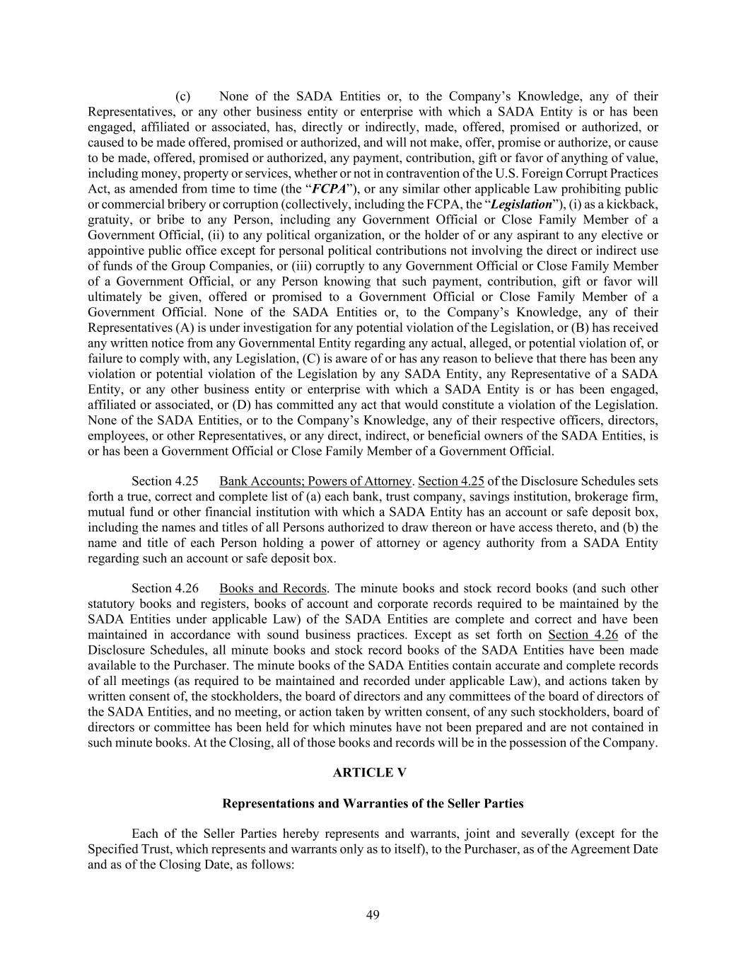 49 (c) None of the SADA Entities or, to the Company’s Knowledge, any of their Representatives, or any other business entity or enterprise with which a SADA Entity is or has been engaged, affiliated or associated, has, directly or indirectly, made, offered, promised or authorized, or caused to be made offered, promised or authorized, and will not make, offer, promise or authorize, or cause to be made, offered, promised or authorized, any payment, contribution, gift or favor of anything of value, including money, property or services, whether or not in contravention of the U.S. Foreign Corrupt Practices Act, as amended from time to time (the “FCPA”), or any similar other applicable Law prohibiting public or commercial bribery or corruption (collectively, including the FCPA, the “Legislation”), (i) as a kickback, gratuity, or bribe to any Person, including any Government Official or Close Family Member of a Government Official, (ii) to any political organization, or the holder of or any aspirant to any elective or appointive public office except for personal political contributions not involving the direct or indirect use of funds of the Group Companies, or (iii) corruptly to any Government Official or Close Family Member of a Government Official, or any Person knowing that such payment, contribution, gift or favor will ultimately be given, offered or promised to a Government Official or Close Family Member of a Government Official. None of the SADA Entities or, to the Company’s Knowledge, any of their Representatives (A) is under investigation for any potential violation of the Legislation, or (B) has received any written notice from any Governmental Entity regarding any actual, alleged, or potential violation of, or failure to comply with, any Legislation, (C) is aware of or has any reason to believe that there has been any violation or potential violation of the Legislation by any SADA Entity, any Representative of a SADA Entity, or any other business entity or enterprise with which a SADA Entity is or has been engaged, affiliated or associated, or (D) has committed any act that would constitute a violation of the Legislation. None of the SADA Entities, or to the Company’s Knowledge, any of their respective officers, directors, employees, or other Representatives, or any direct, indirect, or beneficial owners of the SADA Entities, is or has been a Government Official or Close Family Member of a Government Official. Section 4.25 Bank Accounts; Powers of Attorney. Section 4.25 of the Disclosure Schedules sets forth a true, correct and complete list of (a) each bank, trust company, savings institution, brokerage firm, mutual fund or other financial institution with which a SADA Entity has an account or safe deposit box, including the names and titles of all Persons authorized to draw thereon or have access thereto, and (b) the name and title of each Person holding a power of attorney or agency authority from a SADA Entity regarding such an account or safe deposit box. Section 4.26 Books and Records. The minute books and stock record books (and such other statutory books and registers, books of account and corporate records required to be maintained by the SADA Entities under applicable Law) of the SADA Entities are complete and correct and have been maintained in accordance with sound business practices. Except as set forth on Section 4.26 of the Disclosure Schedules, all minute books and stock record books of the SADA Entities have been made available to the Purchaser. The minute books of the SADA Entities contain accurate and complete records of all meetings (as required to be maintained and recorded under applicable Law), and actions taken by written consent of, the stockholders, the board of directors and any committees of the board of directors of the SADA Entities, and no meeting, or action taken by written consent, of any such stockholders, board of directors or committee has been held for which minutes have not been prepared and are not contained in such minute books. At the Closing, all of those books and records will be in the possession of the Company. ARTICLE V Representations and Warranties of the Seller Parties Each of the Seller Parties hereby represents and warrants, joint and severally (except for the Specified Trust, which represents and warrants only as to itself), to the Purchaser, as of the Agreement Date and as of the Closing Date, as follows: