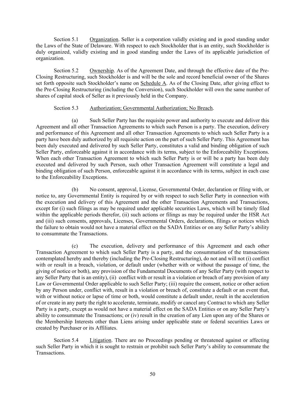 50 Section 5.1 Organization. Seller is a corporation validly existing and in good standing under the Laws of the State of Delaware. With respect to each Stockholder that is an entity, such Stockholder is duly organized, validly existing and in good standing under the Laws of its applicable jurisdiction of organization. Section 5.2 Ownership. As of the Agreement Date, and through the effective date of the Pre- Closing Restructuring, such Stockholder is and will be the sole and record beneficial owner of the Shares set forth opposite such Stockholder’s name on Schedule A. As of the Closing Date, after giving effect to the Pre-Closing Restructuring (including the Conversion), such Stockholder will own the same number of shares of capital stock of Seller as it previously held in the Company. Section 5.3 Authorization; Governmental Authorization; No Breach. (a) Such Seller Party has the requisite power and authority to execute and deliver this Agreement and all other Transaction Agreements to which such Person is a party. The execution, delivery and performance of this Agreement and all other Transaction Agreements to which such Seller Party is a party have been duly authorized by all requisite action on the part of such Seller Party. This Agreement has been duly executed and delivered by such Seller Party, constitutes a valid and binding obligation of such Seller Party, enforceable against it in accordance with its terms, subject to the Enforceability Exceptions. When each other Transaction Agreement to which such Seller Party is or will be a party has been duly executed and delivered by such Person, such other Transaction Agreement will constitute a legal and binding obligation of such Person, enforceable against it in accordance with its terms, subject in each case to the Enforceability Exceptions. (b) No consent, approval, License, Governmental Order, declaration or filing with, or notice to, any Governmental Entity is required by or with respect to such Seller Party in connection with the execution and delivery of this Agreement and the other Transaction Agreements and Transactions, except for (i) such filings as may be required under applicable securities Laws, which will be timely filed within the applicable periods therefor, (ii) such actions or filings as may be required under the HSR Act and (iii) such consents, approvals, Licenses, Governmental Orders, declarations, filings or notices which the failure to obtain would not have a material effect on the SADA Entities or on any Seller Party’s ability to consummate the Transactions. (c) The execution, delivery and performance of this Agreement and each other Transaction Agreement to which such Seller Party is a party, and the consummation of the transactions contemplated hereby and thereby (including the Pre-Closing Restructuring), do not and will not (i) conflict with or result in a breach, violation, or default under (whether with or without the passage of time, the giving of notice or both), any provision of the Fundamental Documents of any Seller Party (with respect to any Seller Party that is an entity), (ii) conflict with or result in a violation or breach of any provision of any Law or Governmental Order applicable to such Seller Party; (iii) require the consent, notice or other action by any Person under, conflict with, result in a violation or breach of, constitute a default or an event that, with or without notice or lapse of time or both, would constitute a default under, result in the acceleration of or create in any party the right to accelerate, terminate, modify or cancel any Contract to which any Seller Party is a party, except as would not have a material effect on the SADA Entities or on any Seller Party’s ability to consummate the Transactions; or (iv) result in the creation of any Lien upon any of the Shares or the Membership Interests other than Liens arising under applicable state or federal securities Laws or created by Purchaser or its Affiliates. Section 5.4 Litigation. There are no Proceedings pending or threatened against or affecting such Seller Party in which it is sought to restrain or prohibit such Seller Party’s ability to consummate the Transactions.