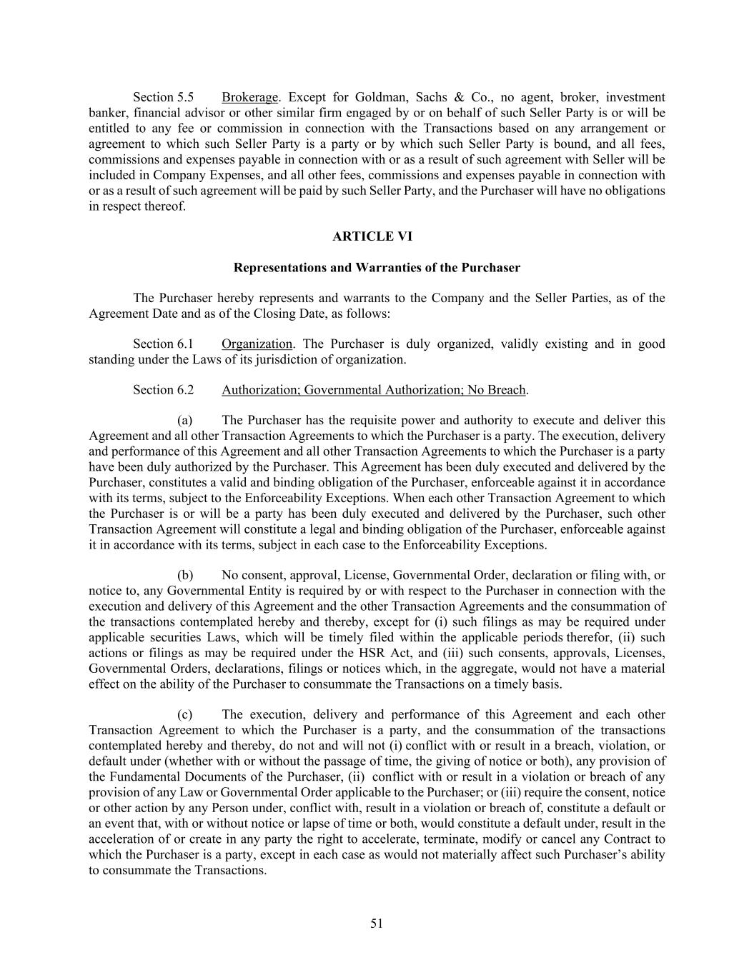 51 Section 5.5 Brokerage. Except for Goldman, Sachs & Co., no agent, broker, investment banker, financial advisor or other similar firm engaged by or on behalf of such Seller Party is or will be entitled to any fee or commission in connection with the Transactions based on any arrangement or agreement to which such Seller Party is a party or by which such Seller Party is bound, and all fees, commissions and expenses payable in connection with or as a result of such agreement with Seller will be included in Company Expenses, and all other fees, commissions and expenses payable in connection with or as a result of such agreement will be paid by such Seller Party, and the Purchaser will have no obligations in respect thereof. ARTICLE VI Representations and Warranties of the Purchaser The Purchaser hereby represents and warrants to the Company and the Seller Parties, as of the Agreement Date and as of the Closing Date, as follows: Section 6.1 Organization. The Purchaser is duly organized, validly existing and in good standing under the Laws of its jurisdiction of organization. Section 6.2 Authorization; Governmental Authorization; No Breach. (a) The Purchaser has the requisite power and authority to execute and deliver this Agreement and all other Transaction Agreements to which the Purchaser is a party. The execution, delivery and performance of this Agreement and all other Transaction Agreements to which the Purchaser is a party have been duly authorized by the Purchaser. This Agreement has been duly executed and delivered by the Purchaser, constitutes a valid and binding obligation of the Purchaser, enforceable against it in accordance with its terms, subject to the Enforceability Exceptions. When each other Transaction Agreement to which the Purchaser is or will be a party has been duly executed and delivered by the Purchaser, such other Transaction Agreement will constitute a legal and binding obligation of the Purchaser, enforceable against it in accordance with its terms, subject in each case to the Enforceability Exceptions. (b) No consent, approval, License, Governmental Order, declaration or filing with, or notice to, any Governmental Entity is required by or with respect to the Purchaser in connection with the execution and delivery of this Agreement and the other Transaction Agreements and the consummation of the transactions contemplated hereby and thereby, except for (i) such filings as may be required under applicable securities Laws, which will be timely filed within the applicable periods therefor, (ii) such actions or filings as may be required under the HSR Act, and (iii) such consents, approvals, Licenses, Governmental Orders, declarations, filings or notices which, in the aggregate, would not have a material effect on the ability of the Purchaser to consummate the Transactions on a timely basis. (c) The execution, delivery and performance of this Agreement and each other Transaction Agreement to which the Purchaser is a party, and the consummation of the transactions contemplated hereby and thereby, do not and will not (i) conflict with or result in a breach, violation, or default under (whether with or without the passage of time, the giving of notice or both), any provision of the Fundamental Documents of the Purchaser, (ii) conflict with or result in a violation or breach of any provision of any Law or Governmental Order applicable to the Purchaser; or (iii) require the consent, notice or other action by any Person under, conflict with, result in a violation or breach of, constitute a default or an event that, with or without notice or lapse of time or both, would constitute a default under, result in the acceleration of or create in any party the right to accelerate, terminate, modify or cancel any Contract to which the Purchaser is a party, except in each case as would not materially affect such Purchaser’s ability to consummate the Transactions.