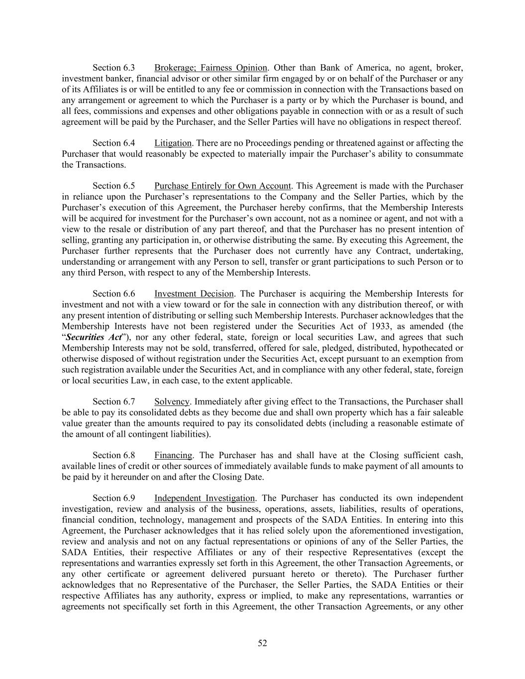 52 Section 6.3 Brokerage; Fairness Opinion. Other than Bank of America, no agent, broker, investment banker, financial advisor or other similar firm engaged by or on behalf of the Purchaser or any of its Affiliates is or will be entitled to any fee or commission in connection with the Transactions based on any arrangement or agreement to which the Purchaser is a party or by which the Purchaser is bound, and all fees, commissions and expenses and other obligations payable in connection with or as a result of such agreement will be paid by the Purchaser, and the Seller Parties will have no obligations in respect thereof. Section 6.4 Litigation. There are no Proceedings pending or threatened against or affecting the Purchaser that would reasonably be expected to materially impair the Purchaser’s ability to consummate the Transactions. Section 6.5 Purchase Entirely for Own Account. This Agreement is made with the Purchaser in reliance upon the Purchaser’s representations to the Company and the Seller Parties, which by the Purchaser’s execution of this Agreement, the Purchaser hereby confirms, that the Membership Interests will be acquired for investment for the Purchaser’s own account, not as a nominee or agent, and not with a view to the resale or distribution of any part thereof, and that the Purchaser has no present intention of selling, granting any participation in, or otherwise distributing the same. By executing this Agreement, the Purchaser further represents that the Purchaser does not currently have any Contract, undertaking, understanding or arrangement with any Person to sell, transfer or grant participations to such Person or to any third Person, with respect to any of the Membership Interests. Section 6.6 Investment Decision. The Purchaser is acquiring the Membership Interests for investment and not with a view toward or for the sale in connection with any distribution thereof, or with any present intention of distributing or selling such Membership Interests. Purchaser acknowledges that the Membership Interests have not been registered under the Securities Act of 1933, as amended (the “Securities Act”), nor any other federal, state, foreign or local securities Law, and agrees that such Membership Interests may not be sold, transferred, offered for sale, pledged, distributed, hypothecated or otherwise disposed of without registration under the Securities Act, except pursuant to an exemption from such registration available under the Securities Act, and in compliance with any other federal, state, foreign or local securities Law, in each case, to the extent applicable. Section 6.7 Solvency. Immediately after giving effect to the Transactions, the Purchaser shall be able to pay its consolidated debts as they become due and shall own property which has a fair saleable value greater than the amounts required to pay its consolidated debts (including a reasonable estimate of the amount of all contingent liabilities). Section 6.8 Financing. The Purchaser has and shall have at the Closing sufficient cash, available lines of credit or other sources of immediately available funds to make payment of all amounts to be paid by it hereunder on and after the Closing Date. Section 6.9 Independent Investigation. The Purchaser has conducted its own independent investigation, review and analysis of the business, operations, assets, liabilities, results of operations, financial condition, technology, management and prospects of the SADA Entities. In entering into this Agreement, the Purchaser acknowledges that it has relied solely upon the aforementioned investigation, review and analysis and not on any factual representations or opinions of any of the Seller Parties, the SADA Entities, their respective Affiliates or any of their respective Representatives (except the representations and warranties expressly set forth in this Agreement, the other Transaction Agreements, or any other certificate or agreement delivered pursuant hereto or thereto). The Purchaser further acknowledges that no Representative of the Purchaser, the Seller Parties, the SADA Entities or their respective Affiliates has any authority, express or implied, to make any representations, warranties or agreements not specifically set forth in this Agreement, the other Transaction Agreements, or any other