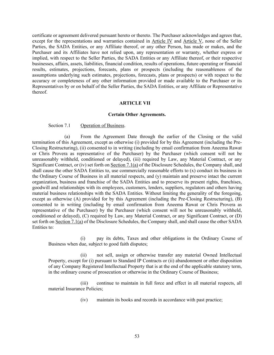 53 certificate or agreement delivered pursuant hereto or thereto. The Purchaser acknowledges and agrees that, except for the representations and warranties contained in Article IV and Article V, none of the Seller Parties, the SADA Entities, or any Affiliate thereof, or any other Person, has made or makes, and the Purchaser and its Affiliates have not relied upon, any representation or warranty, whether express or implied, with respect to the Seller Parties, the SADA Entities or any Affiliate thereof, or their respective businesses, affairs, assets, liabilities, financial condition, results of operations, future operating or financial results, estimates, projections, forecasts, plans or prospects (including the reasonableness of the assumptions underlying such estimates, projections, forecasts, plans or prospects) or with respect to the accuracy or completeness of any other information provided or made available to the Purchaser or its Representatives by or on behalf of the Seller Parties, the SADA Entities, or any Affiliate or Representative thereof. ARTICLE VII Certain Other Agreements. Section 7.1 Operation of Business. (a) From the Agreement Date through the earlier of the Closing or the valid termination of this Agreement, except as otherwise (i) provided for by this Agreement (including the Pre- Closing Restructuring), (ii) consented to in writing (including by email confirmation from Aneema Rawat or Chris Provera as representative of the Purchaser) by the Purchaser (which consent will not be unreasonably withheld, conditioned or delayed), (iii) required by Law, any Material Contract, or any Significant Contract, or (iv) set forth on Section 7.1(a) of the Disclosure Schedules, the Company shall, and shall cause the other SADA Entities to, use commercially reasonable efforts to (x) conduct its business in the Ordinary Course of Business in all material respects, and (y) maintain and preserve intact the current organization, business and franchise of the SADA Entities and to preserve its present rights, franchises, goodwill and relationships with its employees, customers, lenders, suppliers, regulators and others having material business relationships with the SADA Entities. Without limiting the generality of the foregoing, except as otherwise (A) provided for by this Agreement (including the Pre-Closing Restructuring), (B) consented to in writing (including by email confirmation from Aneema Rawat or Chris Provera as representative of the Purchaser) by the Purchaser (which consent will not be unreasonably withheld, conditioned or delayed), (C) required by Law, any Material Contract, or any Significant Contract, or (D) set forth on Section 7.1(a) of the Disclosure Schedules, the Company shall, and shall cause the other SADA Entities to: (i) pay its debts, Taxes and other obligations in the Ordinary Course of Business when due, subject to good faith disputes; (ii) not sell, assign or otherwise transfer any material Owned Intellectual Property, except for (i) pursuant to Standard IP Contracts or (ii) abandonment or other disposition of any Company Registered Intellectual Property that is at the end of the applicable statutory term, in the ordinary course of prosecution or otherwise in the Ordinary Course of Business; (iii) continue to maintain in full force and effect in all material respects, all material Insurance Policies; (iv) maintain its books and records in accordance with past practice;