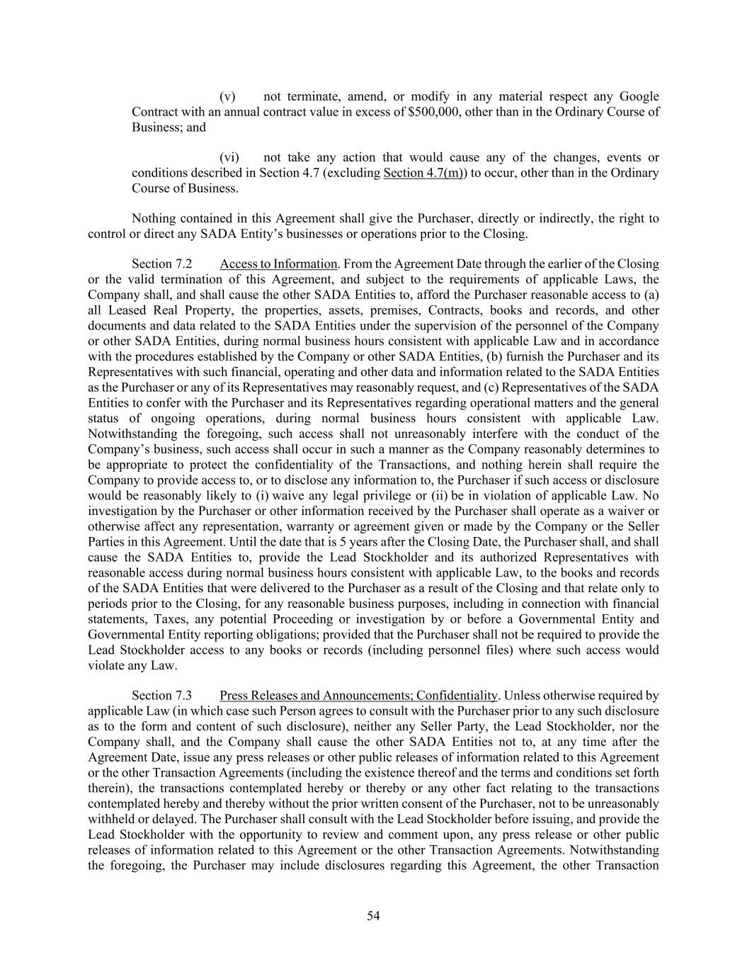 54 (v) not terminate, amend, or modify in any material respect any Google Contract with an annual contract value in excess of $500,000, other than in the Ordinary Course of Business; and (vi) not take any action that would cause any of the changes, events or conditions described in Section 4.7 (excluding Section 4.7(m)) to occur, other than in the Ordinary Course of Business. Nothing contained in this Agreement shall give the Purchaser, directly or indirectly, the right to control or direct any SADA Entity’s businesses or operations prior to the Closing. Section 7.2 Access to Information. From the Agreement Date through the earlier of the Closing or the valid termination of this Agreement, and subject to the requirements of applicable Laws, the Company shall, and shall cause the other SADA Entities to, afford the Purchaser reasonable access to (a) all Leased Real Property, the properties, assets, premises, Contracts, books and records, and other documents and data related to the SADA Entities under the supervision of the personnel of the Company or other SADA Entities, during normal business hours consistent with applicable Law and in accordance with the procedures established by the Company or other SADA Entities, (b) furnish the Purchaser and its Representatives with such financial, operating and other data and information related to the SADA Entities as the Purchaser or any of its Representatives may reasonably request, and (c) Representatives of the SADA Entities to confer with the Purchaser and its Representatives regarding operational matters and the general status of ongoing operations, during normal business hours consistent with applicable Law. Notwithstanding the foregoing, such access shall not unreasonably interfere with the conduct of the Company’s business, such access shall occur in such a manner as the Company reasonably determines to be appropriate to protect the confidentiality of the Transactions, and nothing herein shall require the Company to provide access to, or to disclose any information to, the Purchaser if such access or disclosure would be reasonably likely to (i) waive any legal privilege or (ii) be in violation of applicable Law. No investigation by the Purchaser or other information received by the Purchaser shall operate as a waiver or otherwise affect any representation, warranty or agreement given or made by the Company or the Seller Parties in this Agreement. Until the date that is 5 years after the Closing Date, the Purchaser shall, and shall cause the SADA Entities to, provide the Lead Stockholder and its authorized Representatives with reasonable access during normal business hours consistent with applicable Law, to the books and records of the SADA Entities that were delivered to the Purchaser as a result of the Closing and that relate only to periods prior to the Closing, for any reasonable business purposes, including in connection with financial statements, Taxes, any potential Proceeding or investigation by or before a Governmental Entity and Governmental Entity reporting obligations; provided that the Purchaser shall not be required to provide the Lead Stockholder access to any books or records (including personnel files) where such access would violate any Law. Section 7.3 Press Releases and Announcements; Confidentiality. Unless otherwise required by applicable Law (in which case such Person agrees to consult with the Purchaser prior to any such disclosure as to the form and content of such disclosure), neither any Seller Party, the Lead Stockholder, nor the Company shall, and the Company shall cause the other SADA Entities not to, at any time after the Agreement Date, issue any press releases or other public releases of information related to this Agreement or the other Transaction Agreements (including the existence thereof and the terms and conditions set forth therein), the transactions contemplated hereby or thereby or any other fact relating to the transactions contemplated hereby and thereby without the prior written consent of the Purchaser, not to be unreasonably withheld or delayed. The Purchaser shall consult with the Lead Stockholder before issuing, and provide the Lead Stockholder with the opportunity to review and comment upon, any press release or other public releases of information related to this Agreement or the other Transaction Agreements. Notwithstanding the foregoing, the Purchaser may include disclosures regarding this Agreement, the other Transaction