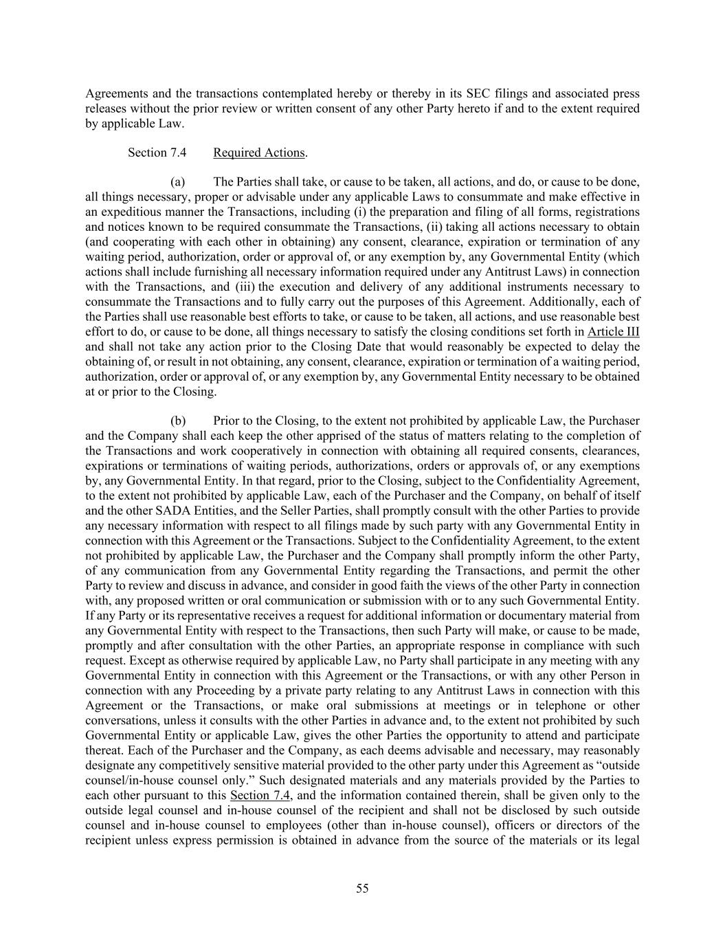 55 Agreements and the transactions contemplated hereby or thereby in its SEC filings and associated press releases without the prior review or written consent of any other Party hereto if and to the extent required by applicable Law. Section 7.4 Required Actions. (a) The Parties shall take, or cause to be taken, all actions, and do, or cause to be done, all things necessary, proper or advisable under any applicable Laws to consummate and make effective in an expeditious manner the Transactions, including (i) the preparation and filing of all forms, registrations and notices known to be required consummate the Transactions, (ii) taking all actions necessary to obtain (and cooperating with each other in obtaining) any consent, clearance, expiration or termination of any waiting period, authorization, order or approval of, or any exemption by, any Governmental Entity (which actions shall include furnishing all necessary information required under any Antitrust Laws) in connection with the Transactions, and (iii) the execution and delivery of any additional instruments necessary to consummate the Transactions and to fully carry out the purposes of this Agreement. Additionally, each of the Parties shall use reasonable best efforts to take, or cause to be taken, all actions, and use reasonable best effort to do, or cause to be done, all things necessary to satisfy the closing conditions set forth in Article III and shall not take any action prior to the Closing Date that would reasonably be expected to delay the obtaining of, or result in not obtaining, any consent, clearance, expiration or termination of a waiting period, authorization, order or approval of, or any exemption by, any Governmental Entity necessary to be obtained at or prior to the Closing. (b) Prior to the Closing, to the extent not prohibited by applicable Law, the Purchaser and the Company shall each keep the other apprised of the status of matters relating to the completion of the Transactions and work cooperatively in connection with obtaining all required consents, clearances, expirations or terminations of waiting periods, authorizations, orders or approvals of, or any exemptions by, any Governmental Entity. In that regard, prior to the Closing, subject to the Confidentiality Agreement, to the extent not prohibited by applicable Law, each of the Purchaser and the Company, on behalf of itself and the other SADA Entities, and the Seller Parties, shall promptly consult with the other Parties to provide any necessary information with respect to all filings made by such party with any Governmental Entity in connection with this Agreement or the Transactions. Subject to the Confidentiality Agreement, to the extent not prohibited by applicable Law, the Purchaser and the Company shall promptly inform the other Party, of any communication from any Governmental Entity regarding the Transactions, and permit the other Party to review and discuss in advance, and consider in good faith the views of the other Party in connection with, any proposed written or oral communication or submission with or to any such Governmental Entity. If any Party or its representative receives a request for additional information or documentary material from any Governmental Entity with respect to the Transactions, then such Party will make, or cause to be made, promptly and after consultation with the other Parties, an appropriate response in compliance with such request. Except as otherwise required by applicable Law, no Party shall participate in any meeting with any Governmental Entity in connection with this Agreement or the Transactions, or with any other Person in connection with any Proceeding by a private party relating to any Antitrust Laws in connection with this Agreement or the Transactions, or make oral submissions at meetings or in telephone or other conversations, unless it consults with the other Parties in advance and, to the extent not prohibited by such Governmental Entity or applicable Law, gives the other Parties the opportunity to attend and participate thereat. Each of the Purchaser and the Company, as each deems advisable and necessary, may reasonably designate any competitively sensitive material provided to the other party under this Agreement as “outside counsel/in-house counsel only.” Such designated materials and any materials provided by the Parties to each other pursuant to this Section 7.4, and the information contained therein, shall be given only to the outside legal counsel and in-house counsel of the recipient and shall not be disclosed by such outside counsel and in-house counsel to employees (other than in-house counsel), officers or directors of the recipient unless express permission is obtained in advance from the source of the materials or its legal