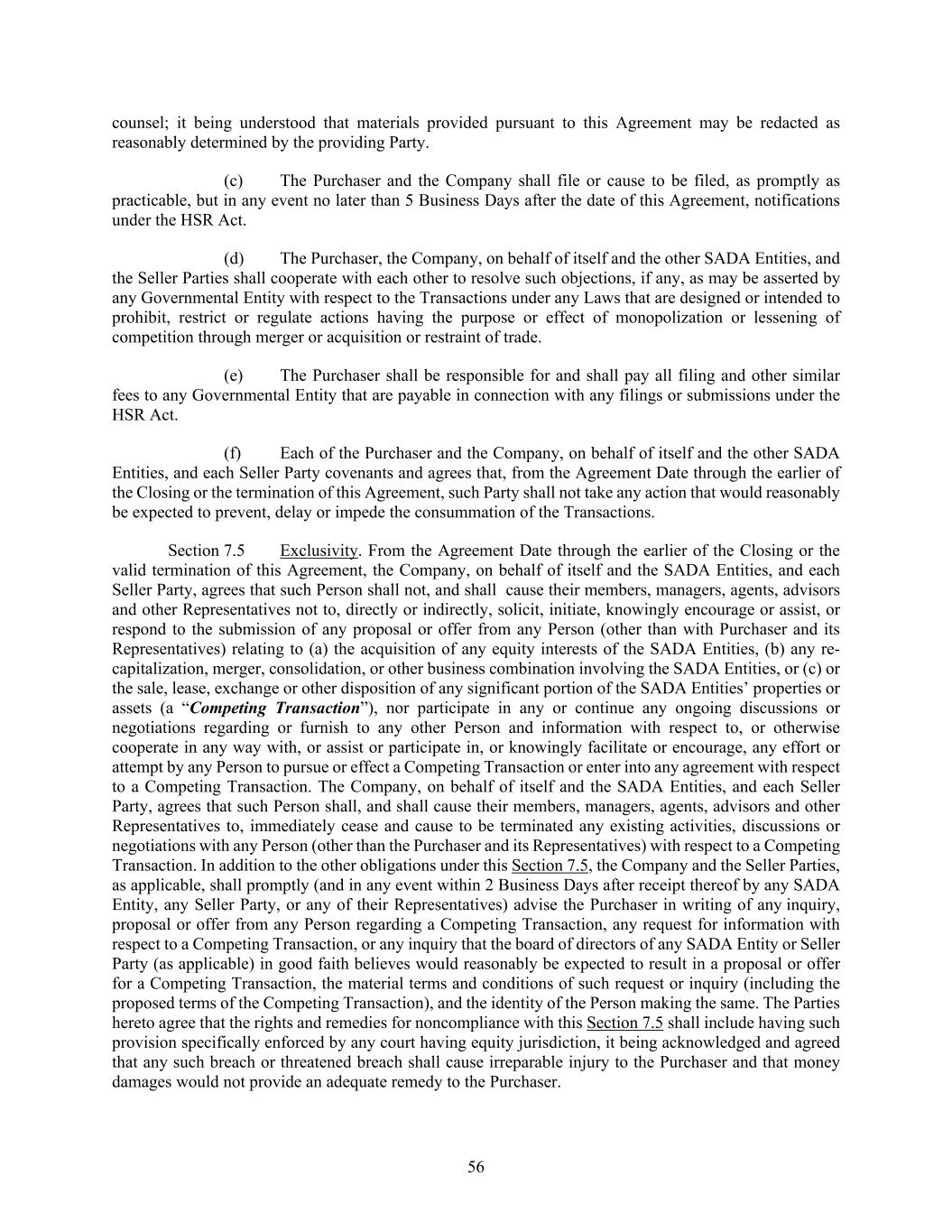 56 counsel; it being understood that materials provided pursuant to this Agreement may be redacted as reasonably determined by the providing Party. (c) The Purchaser and the Company shall file or cause to be filed, as promptly as practicable, but in any event no later than 5 Business Days after the date of this Agreement, notifications under the HSR Act. (d) The Purchaser, the Company, on behalf of itself and the other SADA Entities, and the Seller Parties shall cooperate with each other to resolve such objections, if any, as may be asserted by any Governmental Entity with respect to the Transactions under any Laws that are designed or intended to prohibit, restrict or regulate actions having the purpose or effect of monopolization or lessening of competition through merger or acquisition or restraint of trade. (e) The Purchaser shall be responsible for and shall pay all filing and other similar fees to any Governmental Entity that are payable in connection with any filings or submissions under the HSR Act. (f) Each of the Purchaser and the Company, on behalf of itself and the other SADA Entities, and each Seller Party covenants and agrees that, from the Agreement Date through the earlier of the Closing or the termination of this Agreement, such Party shall not take any action that would reasonably be expected to prevent, delay or impede the consummation of the Transactions. Section 7.5 Exclusivity. From the Agreement Date through the earlier of the Closing or the valid termination of this Agreement, the Company, on behalf of itself and the SADA Entities, and each Seller Party, agrees that such Person shall not, and shall cause their members, managers, agents, advisors and other Representatives not to, directly or indirectly, solicit, initiate, knowingly encourage or assist, or respond to the submission of any proposal or offer from any Person (other than with Purchaser and its Representatives) relating to (a) the acquisition of any equity interests of the SADA Entities, (b) any re- capitalization, merger, consolidation, or other business combination involving the SADA Entities, or (c) or the sale, lease, exchange or other disposition of any significant portion of the SADA Entities’ properties or assets (a “Competing Transaction”), nor participate in any or continue any ongoing discussions or negotiations regarding or furnish to any other Person and information with respect to, or otherwise cooperate in any way with, or assist or participate in, or knowingly facilitate or encourage, any effort or attempt by any Person to pursue or effect a Competing Transaction or enter into any agreement with respect to a Competing Transaction. The Company, on behalf of itself and the SADA Entities, and each Seller Party, agrees that such Person shall, and shall cause their members, managers, agents, advisors and other Representatives to, immediately cease and cause to be terminated any existing activities, discussions or negotiations with any Person (other than the Purchaser and its Representatives) with respect to a Competing Transaction. In addition to the other obligations under this Section 7.5, the Company and the Seller Parties, as applicable, shall promptly (and in any event within 2 Business Days after receipt thereof by any SADA Entity, any Seller Party, or any of their Representatives) advise the Purchaser in writing of any inquiry, proposal or offer from any Person regarding a Competing Transaction, any request for information with respect to a Competing Transaction, or any inquiry that the board of directors of any SADA Entity or Seller Party (as applicable) in good faith believes would reasonably be expected to result in a proposal or offer for a Competing Transaction, the material terms and conditions of such request or inquiry (including the proposed terms of the Competing Transaction), and the identity of the Person making the same. The Parties hereto agree that the rights and remedies for noncompliance with this Section 7.5 shall include having such provision specifically enforced by any court having equity jurisdiction, it being acknowledged and agreed that any such breach or threatened breach shall cause irreparable injury to the Purchaser and that money damages would not provide an adequate remedy to the Purchaser.
