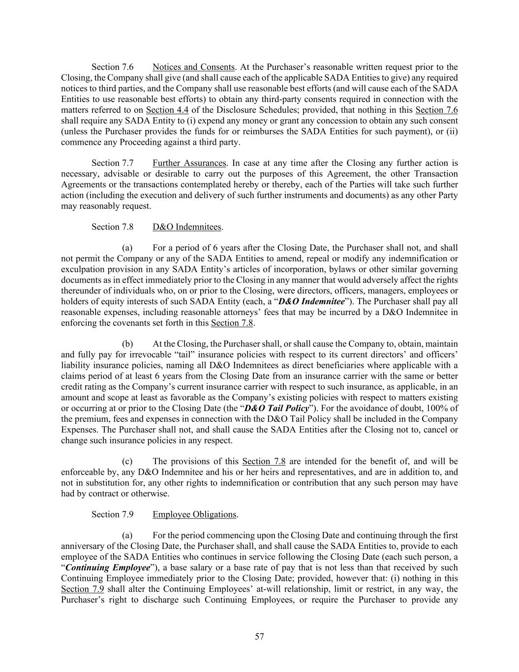 57 Section 7.6 Notices and Consents. At the Purchaser’s reasonable written request prior to the Closing, the Company shall give (and shall cause each of the applicable SADA Entities to give) any required notices to third parties, and the Company shall use reasonable best efforts (and will cause each of the SADA Entities to use reasonable best efforts) to obtain any third-party consents required in connection with the matters referred to on Section 4.4 of the Disclosure Schedules; provided, that nothing in this Section 7.6 shall require any SADA Entity to (i) expend any money or grant any concession to obtain any such consent (unless the Purchaser provides the funds for or reimburses the SADA Entities for such payment), or (ii) commence any Proceeding against a third party. Section 7.7 Further Assurances. In case at any time after the Closing any further action is necessary, advisable or desirable to carry out the purposes of this Agreement, the other Transaction Agreements or the transactions contemplated hereby or thereby, each of the Parties will take such further action (including the execution and delivery of such further instruments and documents) as any other Party may reasonably request. Section 7.8 D&O Indemnitees. (a) For a period of 6 years after the Closing Date, the Purchaser shall not, and shall not permit the Company or any of the SADA Entities to amend, repeal or modify any indemnification or exculpation provision in any SADA Entity’s articles of incorporation, bylaws or other similar governing documents as in effect immediately prior to the Closing in any manner that would adversely affect the rights thereunder of individuals who, on or prior to the Closing, were directors, officers, managers, employees or holders of equity interests of such SADA Entity (each, a “D&O Indemnitee”). The Purchaser shall pay all reasonable expenses, including reasonable attorneys’ fees that may be incurred by a D&O Indemnitee in enforcing the covenants set forth in this Section 7.8. (b) At the Closing, the Purchaser shall, or shall cause the Company to, obtain, maintain and fully pay for irrevocable “tail” insurance policies with respect to its current directors’ and officers’ liability insurance policies, naming all D&O Indemnitees as direct beneficiaries where applicable with a claims period of at least 6 years from the Closing Date from an insurance carrier with the same or better credit rating as the Company’s current insurance carrier with respect to such insurance, as applicable, in an amount and scope at least as favorable as the Company’s existing policies with respect to matters existing or occurring at or prior to the Closing Date (the “D&O Tail Policy”). For the avoidance of doubt, 100% of the premium, fees and expenses in connection with the D&O Tail Policy shall be included in the Company Expenses. The Purchaser shall not, and shall cause the SADA Entities after the Closing not to, cancel or change such insurance policies in any respect. (c) The provisions of this Section 7.8 are intended for the benefit of, and will be enforceable by, any D&O Indemnitee and his or her heirs and representatives, and are in addition to, and not in substitution for, any other rights to indemnification or contribution that any such person may have had by contract or otherwise. Section 7.9 Employee Obligations. (a) For the period commencing upon the Closing Date and continuing through the first anniversary of the Closing Date, the Purchaser shall, and shall cause the SADA Entities to, provide to each employee of the SADA Entities who continues in service following the Closing Date (each such person, a “Continuing Employee”), a base salary or a base rate of pay that is not less than that received by such Continuing Employee immediately prior to the Closing Date; provided, however that: (i) nothing in this Section 7.9 shall alter the Continuing Employees’ at-will relationship, limit or restrict, in any way, the Purchaser’s right to discharge such Continuing Employees, or require the Purchaser to provide any