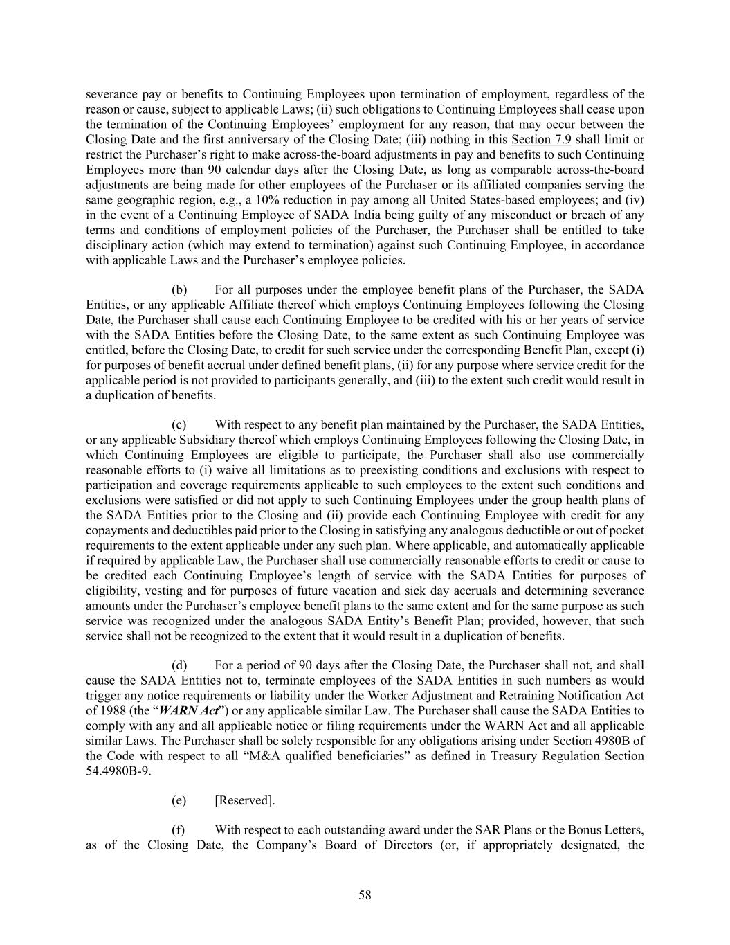 58 severance pay or benefits to Continuing Employees upon termination of employment, regardless of the reason or cause, subject to applicable Laws; (ii) such obligations to Continuing Employees shall cease upon the termination of the Continuing Employees’ employment for any reason, that may occur between the Closing Date and the first anniversary of the Closing Date; (iii) nothing in this Section 7.9 shall limit or restrict the Purchaser’s right to make across-the-board adjustments in pay and benefits to such Continuing Employees more than 90 calendar days after the Closing Date, as long as comparable across-the-board adjustments are being made for other employees of the Purchaser or its affiliated companies serving the same geographic region, e.g., a 10% reduction in pay among all United States-based employees; and (iv) in the event of a Continuing Employee of SADA India being guilty of any misconduct or breach of any terms and conditions of employment policies of the Purchaser, the Purchaser shall be entitled to take disciplinary action (which may extend to termination) against such Continuing Employee, in accordance with applicable Laws and the Purchaser’s employee policies. (b) For all purposes under the employee benefit plans of the Purchaser, the SADA Entities, or any applicable Affiliate thereof which employs Continuing Employees following the Closing Date, the Purchaser shall cause each Continuing Employee to be credited with his or her years of service with the SADA Entities before the Closing Date, to the same extent as such Continuing Employee was entitled, before the Closing Date, to credit for such service under the corresponding Benefit Plan, except (i) for purposes of benefit accrual under defined benefit plans, (ii) for any purpose where service credit for the applicable period is not provided to participants generally, and (iii) to the extent such credit would result in a duplication of benefits. (c) With respect to any benefit plan maintained by the Purchaser, the SADA Entities, or any applicable Subsidiary thereof which employs Continuing Employees following the Closing Date, in which Continuing Employees are eligible to participate, the Purchaser shall also use commercially reasonable efforts to (i) waive all limitations as to preexisting conditions and exclusions with respect to participation and coverage requirements applicable to such employees to the extent such conditions and exclusions were satisfied or did not apply to such Continuing Employees under the group health plans of the SADA Entities prior to the Closing and (ii) provide each Continuing Employee with credit for any copayments and deductibles paid prior to the Closing in satisfying any analogous deductible or out of pocket requirements to the extent applicable under any such plan. Where applicable, and automatically applicable if required by applicable Law, the Purchaser shall use commercially reasonable efforts to credit or cause to be credited each Continuing Employee’s length of service with the SADA Entities for purposes of eligibility, vesting and for purposes of future vacation and sick day accruals and determining severance amounts under the Purchaser’s employee benefit plans to the same extent and for the same purpose as such service was recognized under the analogous SADA Entity’s Benefit Plan; provided, however, that such service shall not be recognized to the extent that it would result in a duplication of benefits. (d) For a period of 90 days after the Closing Date, the Purchaser shall not, and shall cause the SADA Entities not to, terminate employees of the SADA Entities in such numbers as would trigger any notice requirements or liability under the Worker Adjustment and Retraining Notification Act of 1988 (the “WARN Act”) or any applicable similar Law. The Purchaser shall cause the SADA Entities to comply with any and all applicable notice or filing requirements under the WARN Act and all applicable similar Laws. The Purchaser shall be solely responsible for any obligations arising under Section 4980B of the Code with respect to all “M&A qualified beneficiaries” as defined in Treasury Regulation Section 54.4980B-9. (e) [Reserved]. (f) With respect to each outstanding award under the SAR Plans or the Bonus Letters, as of the Closing Date, the Company’s Board of Directors (or, if appropriately designated, the
