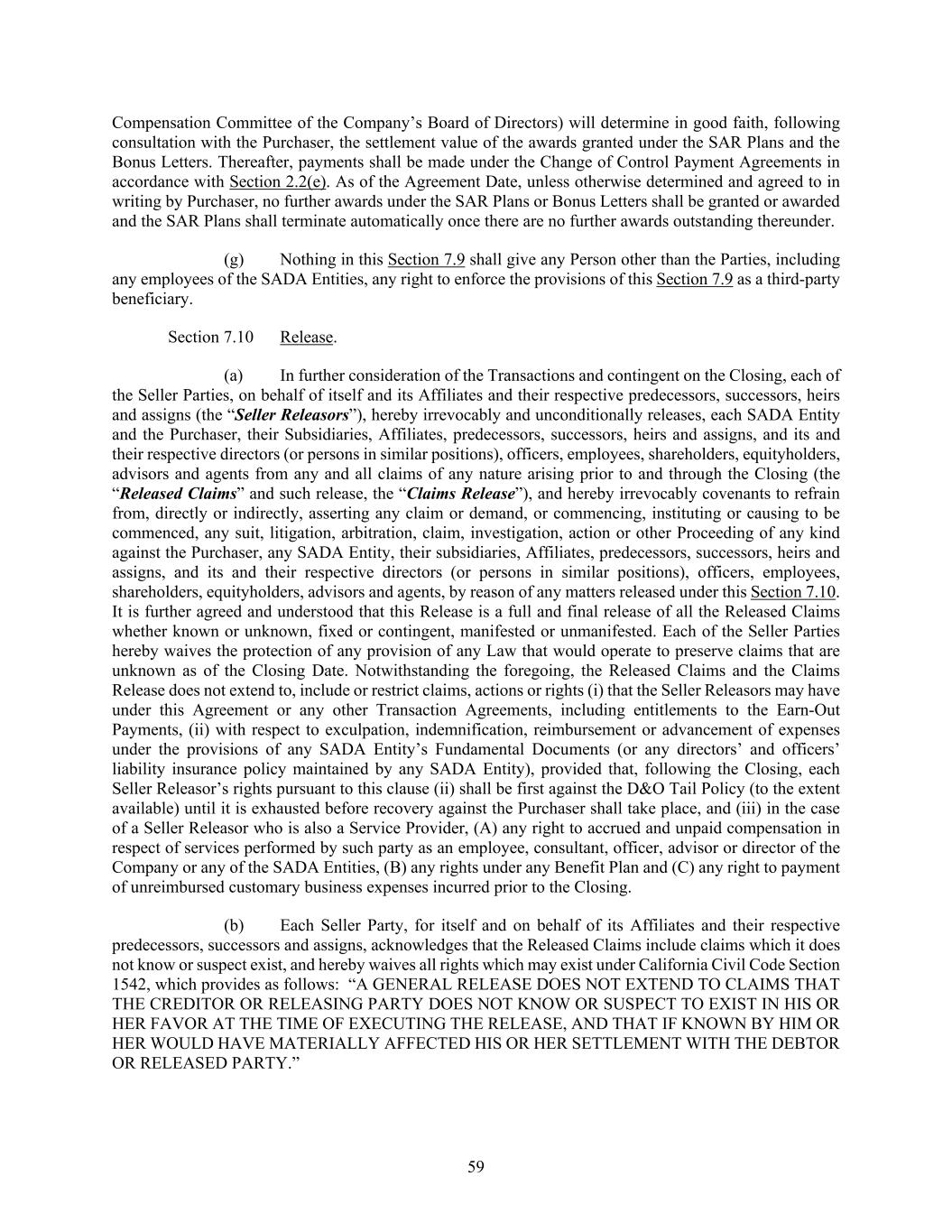 59 Compensation Committee of the Company’s Board of Directors) will determine in good faith, following consultation with the Purchaser, the settlement value of the awards granted under the SAR Plans and the Bonus Letters. Thereafter, payments shall be made under the Change of Control Payment Agreements in accordance with Section 2.2(e). As of the Agreement Date, unless otherwise determined and agreed to in writing by Purchaser, no further awards under the SAR Plans or Bonus Letters shall be granted or awarded and the SAR Plans shall terminate automatically once there are no further awards outstanding thereunder. (g) Nothing in this Section 7.9 shall give any Person other than the Parties, including any employees of the SADA Entities, any right to enforce the provisions of this Section 7.9 as a third-party beneficiary. Section 7.10 Release. (a) In further consideration of the Transactions and contingent on the Closing, each of the Seller Parties, on behalf of itself and its Affiliates and their respective predecessors, successors, heirs and assigns (the “Seller Releasors”), hereby irrevocably and unconditionally releases, each SADA Entity and the Purchaser, their Subsidiaries, Affiliates, predecessors, successors, heirs and assigns, and its and their respective directors (or persons in similar positions), officers, employees, shareholders, equityholders, advisors and agents from any and all claims of any nature arising prior to and through the Closing (the “Released Claims” and such release, the “Claims Release”), and hereby irrevocably covenants to refrain from, directly or indirectly, asserting any claim or demand, or commencing, instituting or causing to be commenced, any suit, litigation, arbitration, claim, investigation, action or other Proceeding of any kind against the Purchaser, any SADA Entity, their subsidiaries, Affiliates, predecessors, successors, heirs and assigns, and its and their respective directors (or persons in similar positions), officers, employees, shareholders, equityholders, advisors and agents, by reason of any matters released under this Section 7.10. It is further agreed and understood that this Release is a full and final release of all the Released Claims whether known or unknown, fixed or contingent, manifested or unmanifested. Each of the Seller Parties hereby waives the protection of any provision of any Law that would operate to preserve claims that are unknown as of the Closing Date. Notwithstanding the foregoing, the Released Claims and the Claims Release does not extend to, include or restrict claims, actions or rights (i) that the Seller Releasors may have under this Agreement or any other Transaction Agreements, including entitlements to the Earn-Out Payments, (ii) with respect to exculpation, indemnification, reimbursement or advancement of expenses under the provisions of any SADA Entity’s Fundamental Documents (or any directors’ and officers’ liability insurance policy maintained by any SADA Entity), provided that, following the Closing, each Seller Releasor’s rights pursuant to this clause (ii) shall be first against the D&O Tail Policy (to the extent available) until it is exhausted before recovery against the Purchaser shall take place, and (iii) in the case of a Seller Releasor who is also a Service Provider, (A) any right to accrued and unpaid compensation in respect of services performed by such party as an employee, consultant, officer, advisor or director of the Company or any of the SADA Entities, (B) any rights under any Benefit Plan and (C) any right to payment of unreimbursed customary business expenses incurred prior to the Closing. (b) Each Seller Party, for itself and on behalf of its Affiliates and their respective predecessors, successors and assigns, acknowledges that the Released Claims include claims which it does not know or suspect exist, and hereby waives all rights which may exist under California Civil Code Section 1542, which provides as follows: “A GENERAL RELEASE DOES NOT EXTEND TO CLAIMS THAT THE CREDITOR OR RELEASING PARTY DOES NOT KNOW OR SUSPECT TO EXIST IN HIS OR HER FAVOR AT THE TIME OF EXECUTING THE RELEASE, AND THAT IF KNOWN BY HIM OR HER WOULD HAVE MATERIALLY AFFECTED HIS OR HER SETTLEMENT WITH THE DEBTOR OR RELEASED PARTY.”