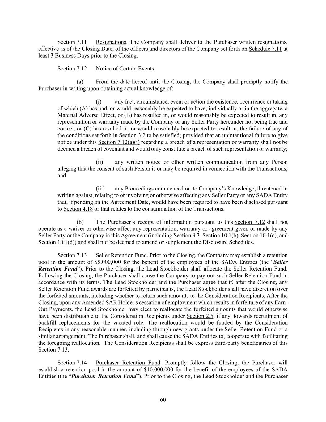 60 Section 7.11 Resignations. The Company shall deliver to the Purchaser written resignations, effective as of the Closing Date, of the officers and directors of the Company set forth on Schedule 7.11 at least 3 Business Days prior to the Closing. Section 7.12 Notice of Certain Events. (a) From the date hereof until the Closing, the Company shall promptly notify the Purchaser in writing upon obtaining actual knowledge of: (i) any fact, circumstance, event or action the existence, occurrence or taking of which (A) has had, or would reasonably be expected to have, individually or in the aggregate, a Material Adverse Effect, or (B) has resulted in, or would reasonably be expected to result in, any representation or warranty made by the Company or any Seller Party hereunder not being true and correct, or (C) has resulted in, or would reasonably be expected to result in, the failure of any of the conditions set forth in Section 3.2 to be satisfied; provided that an unintentional failure to give notice under this Section 7.12(a)(i) regarding a breach of a representation or warranty shall not be deemed a breach of covenant and would only constitute a breach of such representation or warranty; (ii) any written notice or other written communication from any Person alleging that the consent of such Person is or may be required in connection with the Transactions; and (iii) any Proceedings commenced or, to Company’s Knowledge, threatened in writing against, relating to or involving or otherwise affecting any Seller Party or any SADA Entity that, if pending on the Agreement Date, would have been required to have been disclosed pursuant to Section 4.18 or that relates to the consummation of the Transactions. (b) The Purchaser’s receipt of information pursuant to this Section 7.12 shall not operate as a waiver or otherwise affect any representation, warranty or agreement given or made by any Seller Party or the Company in this Agreement (including Section 9.3, Section 10.1(b), Section 10.1(c), and Section 10.1(d)) and shall not be deemed to amend or supplement the Disclosure Schedules. Section 7.13 Seller Retention Fund. Prior to the Closing, the Company may establish a retention pool in the amount of $5,000,000 for the benefit of the employees of the SADA Entities (the “Seller Retention Fund”). Prior to the Closing, the Lead Stockholder shall allocate the Seller Retention Fund. Following the Closing, the Purchaser shall cause the Company to pay out such Seller Retention Fund in accordance with its terms. The Lead Stockholder and the Purchaser agree that if, after the Closing, any Seller Retention Fund awards are forfeited by participants, the Lead Stockholder shall have discretion over the forfeited amounts, including whether to return such amounts to the Consideration Recipients. After the Closing, upon any Amended SAR Holder's cessation of employment which results in forfeiture of any Earn- Out Payments, the Lead Stockholder may elect to reallocate the forfeited amounts that would otherwise have been distributable to the Consideration Recipients under Section 2.5, if any, towards recruitment of backfill replacements for the vacated role. The reallocation would be funded by the Consideration Recipients in any reasonable manner, including through new grants under the Seller Retention Fund or a similar arrangement. The Purchaser shall, and shall cause the SADA Entities to, cooperate with facilitating the foregoing reallocation. The Consideration Recipients shall be express third-party beneficiaries of this Section 7.13. Section 7.14 Purchaser Retention Fund. Promptly follow the Closing, the Purchaser will establish a retention pool in the amount of $10,000,000 for the benefit of the employees of the SADA Entities (the “Purchaser Retention Fund”). Prior to the Closing, the Lead Stockholder and the Purchaser