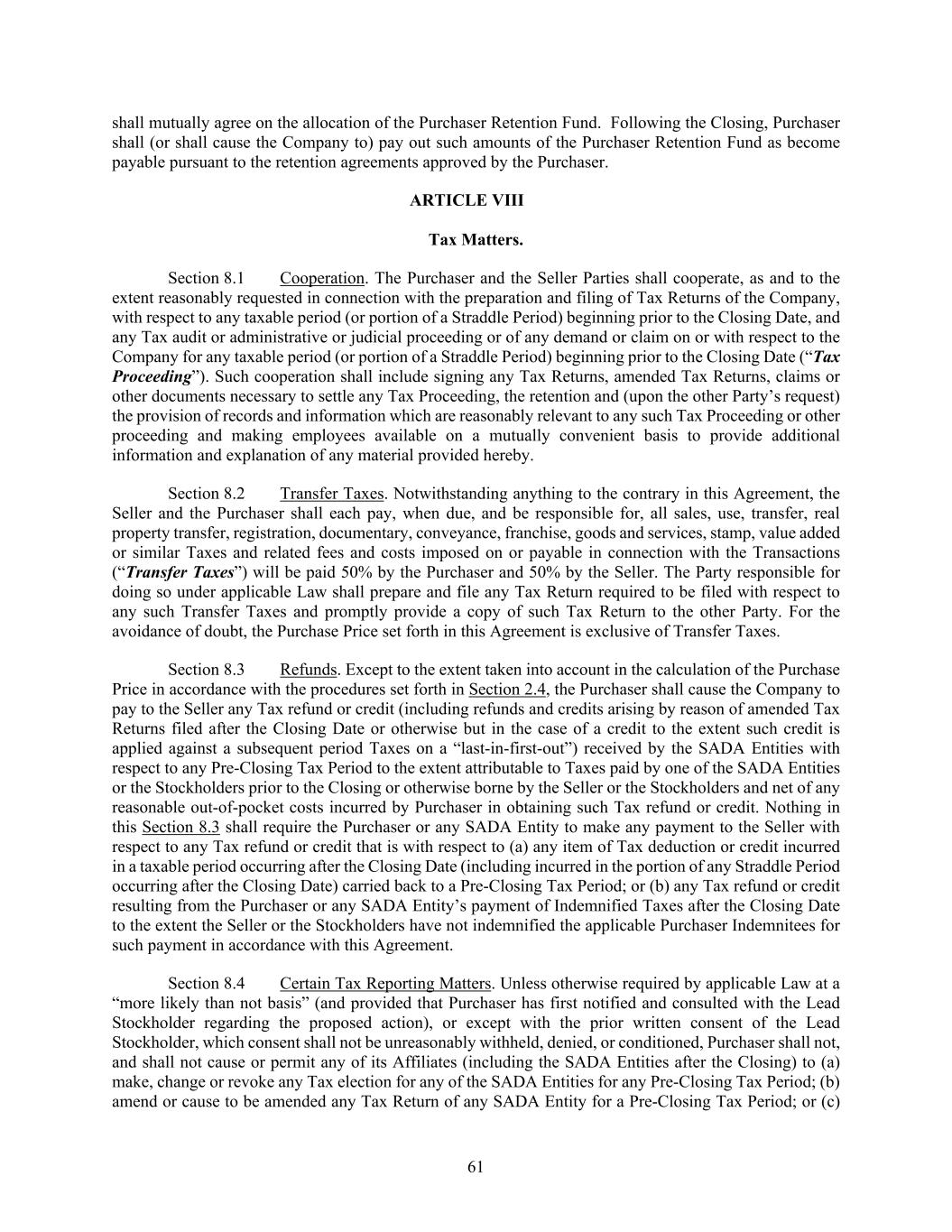 61 shall mutually agree on the allocation of the Purchaser Retention Fund. Following the Closing, Purchaser shall (or shall cause the Company to) pay out such amounts of the Purchaser Retention Fund as become payable pursuant to the retention agreements approved by the Purchaser. ARTICLE VIII Tax Matters. Section 8.1 Cooperation. The Purchaser and the Seller Parties shall cooperate, as and to the extent reasonably requested in connection with the preparation and filing of Tax Returns of the Company, with respect to any taxable period (or portion of a Straddle Period) beginning prior to the Closing Date, and any Tax audit or administrative or judicial proceeding or of any demand or claim on or with respect to the Company for any taxable period (or portion of a Straddle Period) beginning prior to the Closing Date (“Tax Proceeding”). Such cooperation shall include signing any Tax Returns, amended Tax Returns, claims or other documents necessary to settle any Tax Proceeding, the retention and (upon the other Party’s request) the provision of records and information which are reasonably relevant to any such Tax Proceeding or other proceeding and making employees available on a mutually convenient basis to provide additional information and explanation of any material provided hereby. Section 8.2 Transfer Taxes. Notwithstanding anything to the contrary in this Agreement, the Seller and the Purchaser shall each pay, when due, and be responsible for, all sales, use, transfer, real property transfer, registration, documentary, conveyance, franchise, goods and services, stamp, value added or similar Taxes and related fees and costs imposed on or payable in connection with the Transactions (“Transfer Taxes”) will be paid 50% by the Purchaser and 50% by the Seller. The Party responsible for doing so under applicable Law shall prepare and file any Tax Return required to be filed with respect to any such Transfer Taxes and promptly provide a copy of such Tax Return to the other Party. For the avoidance of doubt, the Purchase Price set forth in this Agreement is exclusive of Transfer Taxes. Section 8.3 Refunds. Except to the extent taken into account in the calculation of the Purchase Price in accordance with the procedures set forth in Section 2.4, the Purchaser shall cause the Company to pay to the Seller any Tax refund or credit (including refunds and credits arising by reason of amended Tax Returns filed after the Closing Date or otherwise but in the case of a credit to the extent such credit is applied against a subsequent period Taxes on a “last-in-first-out”) received by the SADA Entities with respect to any Pre-Closing Tax Period to the extent attributable to Taxes paid by one of the SADA Entities or the Stockholders prior to the Closing or otherwise borne by the Seller or the Stockholders and net of any reasonable out-of-pocket costs incurred by Purchaser in obtaining such Tax refund or credit. Nothing in this Section 8.3 shall require the Purchaser or any SADA Entity to make any payment to the Seller with respect to any Tax refund or credit that is with respect to (a) any item of Tax deduction or credit incurred in a taxable period occurring after the Closing Date (including incurred in the portion of any Straddle Period occurring after the Closing Date) carried back to a Pre-Closing Tax Period; or (b) any Tax refund or credit resulting from the Purchaser or any SADA Entity’s payment of Indemnified Taxes after the Closing Date to the extent the Seller or the Stockholders have not indemnified the applicable Purchaser Indemnitees for such payment in accordance with this Agreement. Section 8.4 Certain Tax Reporting Matters. Unless otherwise required by applicable Law at a “more likely than not basis” (and provided that Purchaser has first notified and consulted with the Lead Stockholder regarding the proposed action), or except with the prior written consent of the Lead Stockholder, which consent shall not be unreasonably withheld, denied, or conditioned, Purchaser shall not, and shall not cause or permit any of its Affiliates (including the SADA Entities after the Closing) to (a) make, change or revoke any Tax election for any of the SADA Entities for any Pre-Closing Tax Period; (b) amend or cause to be amended any Tax Return of any SADA Entity for a Pre-Closing Tax Period; or (c)