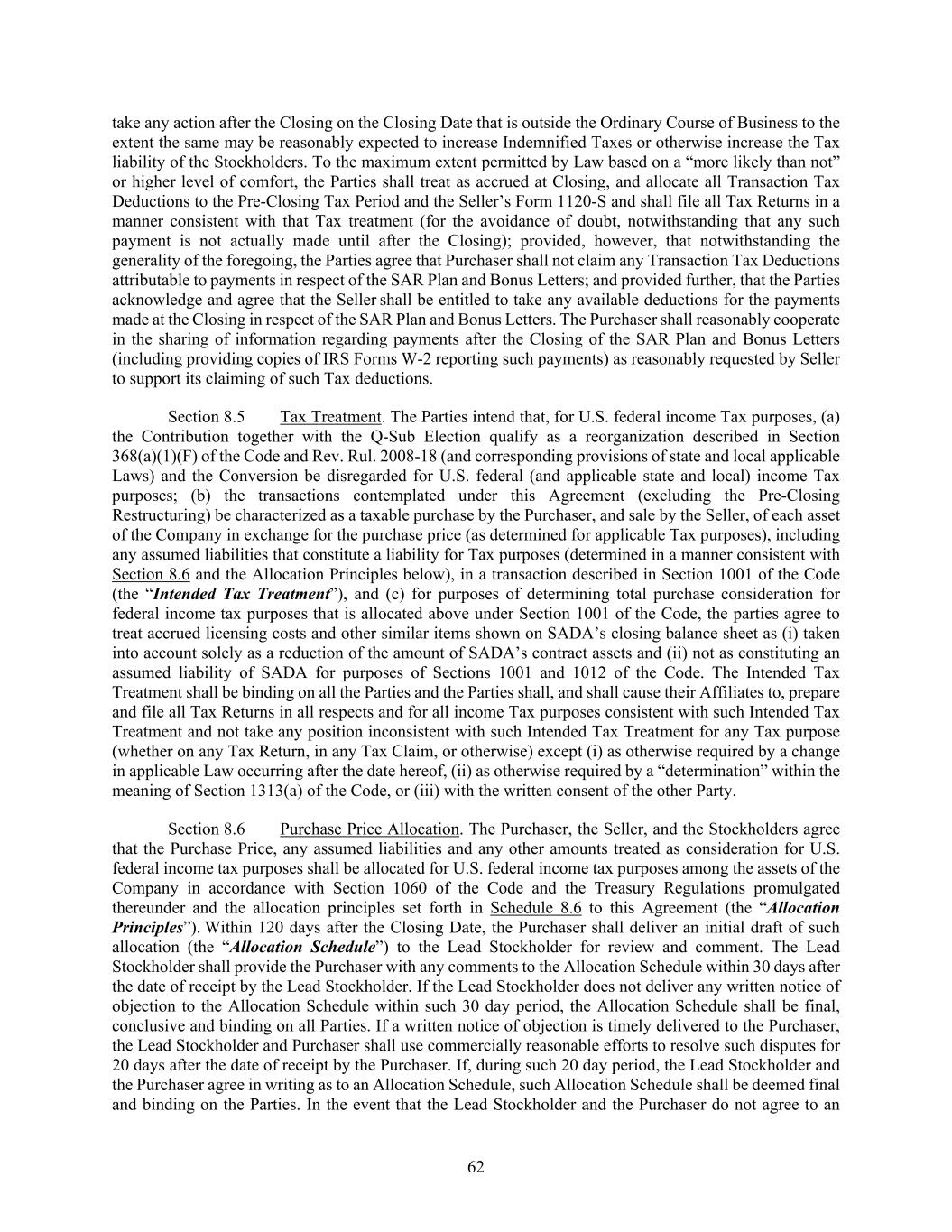 62 take any action after the Closing on the Closing Date that is outside the Ordinary Course of Business to the extent the same may be reasonably expected to increase Indemnified Taxes or otherwise increase the Tax liability of the Stockholders. To the maximum extent permitted by Law based on a “more likely than not” or higher level of comfort, the Parties shall treat as accrued at Closing, and allocate all Transaction Tax Deductions to the Pre-Closing Tax Period and the Seller’s Form 1120-S and shall file all Tax Returns in a manner consistent with that Tax treatment (for the avoidance of doubt, notwithstanding that any such payment is not actually made until after the Closing); provided, however, that notwithstanding the generality of the foregoing, the Parties agree that Purchaser shall not claim any Transaction Tax Deductions attributable to payments in respect of the SAR Plan and Bonus Letters; and provided further, that the Parties acknowledge and agree that the Seller shall be entitled to take any available deductions for the payments made at the Closing in respect of the SAR Plan and Bonus Letters. The Purchaser shall reasonably cooperate in the sharing of information regarding payments after the Closing of the SAR Plan and Bonus Letters (including providing copies of IRS Forms W-2 reporting such payments) as reasonably requested by Seller to support its claiming of such Tax deductions. Section 8.5 Tax Treatment. The Parties intend that, for U.S. federal income Tax purposes, (a) the Contribution together with the Q-Sub Election qualify as a reorganization described in Section 368(a)(1)(F) of the Code and Rev. Rul. 2008-18 (and corresponding provisions of state and local applicable Laws) and the Conversion be disregarded for U.S. federal (and applicable state and local) income Tax purposes; (b) the transactions contemplated under this Agreement (excluding the Pre-Closing Restructuring) be characterized as a taxable purchase by the Purchaser, and sale by the Seller, of each asset of the Company in exchange for the purchase price (as determined for applicable Tax purposes), including any assumed liabilities that constitute a liability for Tax purposes (determined in a manner consistent with Section 8.6 and the Allocation Principles below), in a transaction described in Section 1001 of the Code (the “Intended Tax Treatment”), and (c) for purposes of determining total purchase consideration for federal income tax purposes that is allocated above under Section 1001 of the Code, the parties agree to treat accrued licensing costs and other similar items shown on SADA’s closing balance sheet as (i) taken into account solely as a reduction of the amount of SADA’s contract assets and (ii) not as constituting an assumed liability of SADA for purposes of Sections 1001 and 1012 of the Code. The Intended Tax Treatment shall be binding on all the Parties and the Parties shall, and shall cause their Affiliates to, prepare and file all Tax Returns in all respects and for all income Tax purposes consistent with such Intended Tax Treatment and not take any position inconsistent with such Intended Tax Treatment for any Tax purpose (whether on any Tax Return, in any Tax Claim, or otherwise) except (i) as otherwise required by a change in applicable Law occurring after the date hereof, (ii) as otherwise required by a “determination” within the meaning of Section 1313(a) of the Code, or (iii) with the written consent of the other Party. Section 8.6 Purchase Price Allocation. The Purchaser, the Seller, and the Stockholders agree that the Purchase Price, any assumed liabilities and any other amounts treated as consideration for U.S. federal income tax purposes shall be allocated for U.S. federal income tax purposes among the assets of the Company in accordance with Section 1060 of the Code and the Treasury Regulations promulgated thereunder and the allocation principles set forth in Schedule 8.6 to this Agreement (the “Allocation Principles”). Within 120 days after the Closing Date, the Purchaser shall deliver an initial draft of such allocation (the “Allocation Schedule”) to the Lead Stockholder for review and comment. The Lead Stockholder shall provide the Purchaser with any comments to the Allocation Schedule within 30 days after the date of receipt by the Lead Stockholder. If the Lead Stockholder does not deliver any written notice of objection to the Allocation Schedule within such 30 day period, the Allocation Schedule shall be final, conclusive and binding on all Parties. If a written notice of objection is timely delivered to the Purchaser, the Lead Stockholder and Purchaser shall use commercially reasonable efforts to resolve such disputes for 20 days after the date of receipt by the Purchaser. If, during such 20 day period, the Lead Stockholder and the Purchaser agree in writing as to an Allocation Schedule, such Allocation Schedule shall be deemed final and binding on the Parties. In the event that the Lead Stockholder and the Purchaser do not agree to an