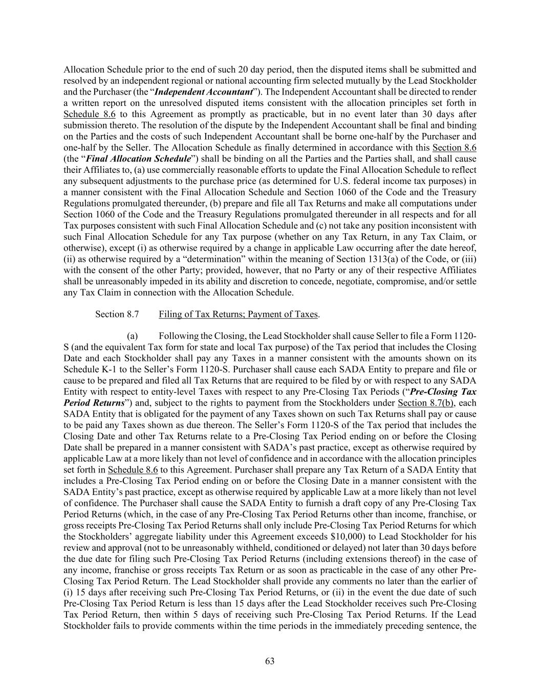 63 Allocation Schedule prior to the end of such 20 day period, then the disputed items shall be submitted and resolved by an independent regional or national accounting firm selected mutually by the Lead Stockholder and the Purchaser (the “Independent Accountant”). The Independent Accountant shall be directed to render a written report on the unresolved disputed items consistent with the allocation principles set forth in Schedule 8.6 to this Agreement as promptly as practicable, but in no event later than 30 days after submission thereto. The resolution of the dispute by the Independent Accountant shall be final and binding on the Parties and the costs of such Independent Accountant shall be borne one-half by the Purchaser and one-half by the Seller. The Allocation Schedule as finally determined in accordance with this Section 8.6 (the “Final Allocation Schedule”) shall be binding on all the Parties and the Parties shall, and shall cause their Affiliates to, (a) use commercially reasonable efforts to update the Final Allocation Schedule to reflect any subsequent adjustments to the purchase price (as determined for U.S. federal income tax purposes) in a manner consistent with the Final Allocation Schedule and Section 1060 of the Code and the Treasury Regulations promulgated thereunder, (b) prepare and file all Tax Returns and make all computations under Section 1060 of the Code and the Treasury Regulations promulgated thereunder in all respects and for all Tax purposes consistent with such Final Allocation Schedule and (c) not take any position inconsistent with such Final Allocation Schedule for any Tax purpose (whether on any Tax Return, in any Tax Claim, or otherwise), except (i) as otherwise required by a change in applicable Law occurring after the date hereof, (ii) as otherwise required by a “determination” within the meaning of Section 1313(a) of the Code, or (iii) with the consent of the other Party; provided, however, that no Party or any of their respective Affiliates shall be unreasonably impeded in its ability and discretion to concede, negotiate, compromise, and/or settle any Tax Claim in connection with the Allocation Schedule. Section 8.7 Filing of Tax Returns; Payment of Taxes. (a) Following the Closing, the Lead Stockholder shall cause Seller to file a Form 1120- S (and the equivalent Tax form for state and local Tax purpose) of the Tax period that includes the Closing Date and each Stockholder shall pay any Taxes in a manner consistent with the amounts shown on its Schedule K-1 to the Seller’s Form 1120-S. Purchaser shall cause each SADA Entity to prepare and file or cause to be prepared and filed all Tax Returns that are required to be filed by or with respect to any SADA Entity with respect to entity-level Taxes with respect to any Pre-Closing Tax Periods (“Pre-Closing Tax Period Returns”) and, subject to the rights to payment from the Stockholders under Section 8.7(b), each SADA Entity that is obligated for the payment of any Taxes shown on such Tax Returns shall pay or cause to be paid any Taxes shown as due thereon. The Seller’s Form 1120-S of the Tax period that includes the Closing Date and other Tax Returns relate to a Pre-Closing Tax Period ending on or before the Closing Date shall be prepared in a manner consistent with SADA’s past practice, except as otherwise required by applicable Law at a more likely than not level of confidence and in accordance with the allocation principles set forth in Schedule 8.6 to this Agreement. Purchaser shall prepare any Tax Return of a SADA Entity that includes a Pre-Closing Tax Period ending on or before the Closing Date in a manner consistent with the SADA Entity’s past practice, except as otherwise required by applicable Law at a more likely than not level of confidence. The Purchaser shall cause the SADA Entity to furnish a draft copy of any Pre-Closing Tax Period Returns (which, in the case of any Pre-Closing Tax Period Returns other than income, franchise, or gross receipts Pre-Closing Tax Period Returns shall only include Pre-Closing Tax Period Returns for which the Stockholders’ aggregate liability under this Agreement exceeds $10,000) to Lead Stockholder for his review and approval (not to be unreasonably withheld, conditioned or delayed) not later than 30 days before the due date for filing such Pre-Closing Tax Period Returns (including extensions thereof) in the case of any income, franchise or gross receipts Tax Return or as soon as practicable in the case of any other Pre- Closing Tax Period Return. The Lead Stockholder shall provide any comments no later than the earlier of (i) 15 days after receiving such Pre-Closing Tax Period Returns, or (ii) in the event the due date of such Pre-Closing Tax Period Return is less than 15 days after the Lead Stockholder receives such Pre-Closing Tax Period Return, then within 5 days of receiving such Pre-Closing Tax Period Returns. If the Lead Stockholder fails to provide comments within the time periods in the immediately preceding sentence, the