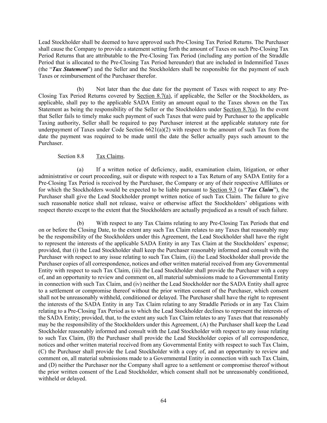 64 Lead Stockholder shall be deemed to have approved such Pre-Closing Tax Period Returns. The Purchaser shall cause the Company to provide a statement setting forth the amount of Taxes on such Pre-Closing Tax Period Returns that are attributable to the Pre-Closing Tax Period (including any portion of the Straddle Period that is allocated to the Pre-Closing Tax Period hereunder) that are included in Indemnified Taxes (the “Tax Statement”) and the Seller and the Stockholders shall be responsible for the payment of such Taxes or reimbursement of the Purchaser therefor. (b) Not later than the due date for the payment of Taxes with respect to any Pre- Closing Tax Period Returns covered by Section 8.7(a), if applicable, the Seller or the Stockholders, as applicable, shall pay to the applicable SADA Entity an amount equal to the Taxes shown on the Tax Statement as being the responsibility of the Seller or the Stockholders under Section 8.7(a). In the event that Seller fails to timely make such payment of such Taxes that were paid by Purchaser to the applicable Taxing authority, Seller shall be required to pay Purchaser interest at the applicable statutory rate for underpayment of Taxes under Code Section 6621(a)(2) with respect to the amount of such Tax from the date the payment was required to be made until the date the Seller actually pays such amount to the Purchaser. Section 8.8 Tax Claims. (a) If a written notice of deficiency, audit, examination claim, litigation, or other administrative or court proceeding, suit or dispute with respect to a Tax Return of any SADA Entity for a Pre-Closing Tax Period is received by the Purchaser, the Company or any of their respective Affiliates or for which the Stockholders would be expected to be liable pursuant to Section 9.3 (a “Tax Claim”), the Purchaser shall give the Lead Stockholder prompt written notice of such Tax Claim. The failure to give such reasonable notice shall not release, waive or otherwise affect the Stockholders’ obligations with respect thereto except to the extent that the Stockholders are actually prejudiced as a result of such failure. (b) With respect to any Tax Claims relating to any Pre-Closing Tax Periods that end on or before the Closing Date, to the extent any such Tax Claim relates to any Taxes that reasonably may be the responsibility of the Stockholders under this Agreement, the Lead Stockholder shall have the right to represent the interests of the applicable SADA Entity in any Tax Claim at the Stockholders’ expense; provided, that (i) the Lead Stockholder shall keep the Purchaser reasonably informed and consult with the Purchaser with respect to any issue relating to such Tax Claim, (ii) the Lead Stockholder shall provide the Purchaser copies of all correspondence, notices and other written material received from any Governmental Entity with respect to such Tax Claim, (iii) the Lead Stockholder shall provide the Purchaser with a copy of, and an opportunity to review and comment on, all material submissions made to a Governmental Entity in connection with such Tax Claim, and (iv) neither the Lead Stockholder nor the SADA Entity shall agree to a settlement or compromise thereof without the prior written consent of the Purchaser, which consent shall not be unreasonably withheld, conditioned or delayed. The Purchaser shall have the right to represent the interests of the SADA Entity in any Tax Claim relating to any Straddle Periods or in any Tax Claim relating to a Pre-Closing Tax Period as to which the Lead Stockholder declines to represent the interests of the SADA Entity; provided, that, to the extent any such Tax Claim relates to any Taxes that that reasonably may be the responsibility of the Stockholders under this Agreement, (A) the Purchaser shall keep the Lead Stockholder reasonably informed and consult with the Lead Stockholder with respect to any issue relating to such Tax Claim, (B) the Purchaser shall provide the Lead Stockholder copies of all correspondence, notices and other written material received from any Governmental Entity with respect to such Tax Claim, (C) the Purchaser shall provide the Lead Stockholder with a copy of, and an opportunity to review and comment on, all material submissions made to a Governmental Entity in connection with such Tax Claim, and (D) neither the Purchaser nor the Company shall agree to a settlement or compromise thereof without the prior written consent of the Lead Stockholder, which consent shall not be unreasonably conditioned, withheld or delayed.