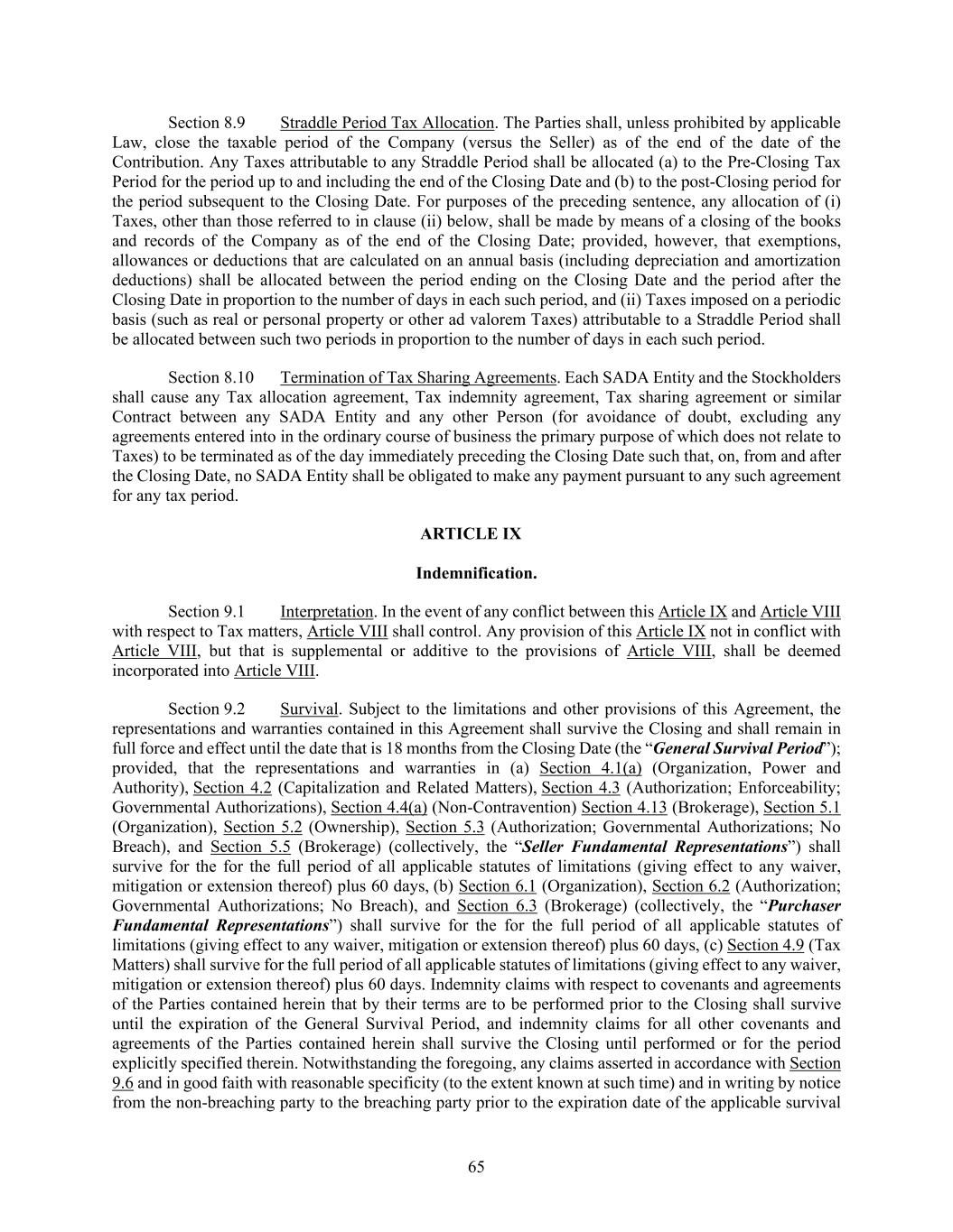 65 Section 8.9 Straddle Period Tax Allocation. The Parties shall, unless prohibited by applicable Law, close the taxable period of the Company (versus the Seller) as of the end of the date of the Contribution. Any Taxes attributable to any Straddle Period shall be allocated (a) to the Pre-Closing Tax Period for the period up to and including the end of the Closing Date and (b) to the post-Closing period for the period subsequent to the Closing Date. For purposes of the preceding sentence, any allocation of (i) Taxes, other than those referred to in clause (ii) below, shall be made by means of a closing of the books and records of the Company as of the end of the Closing Date; provided, however, that exemptions, allowances or deductions that are calculated on an annual basis (including depreciation and amortization deductions) shall be allocated between the period ending on the Closing Date and the period after the Closing Date in proportion to the number of days in each such period, and (ii) Taxes imposed on a periodic basis (such as real or personal property or other ad valorem Taxes) attributable to a Straddle Period shall be allocated between such two periods in proportion to the number of days in each such period. Section 8.10 Termination of Tax Sharing Agreements. Each SADA Entity and the Stockholders shall cause any Tax allocation agreement, Tax indemnity agreement, Tax sharing agreement or similar Contract between any SADA Entity and any other Person (for avoidance of doubt, excluding any agreements entered into in the ordinary course of business the primary purpose of which does not relate to Taxes) to be terminated as of the day immediately preceding the Closing Date such that, on, from and after the Closing Date, no SADA Entity shall be obligated to make any payment pursuant to any such agreement for any tax period. ARTICLE IX Indemnification. Section 9.1 Interpretation. In the event of any conflict between this Article IX and Article VIII with respect to Tax matters, Article VIII shall control. Any provision of this Article IX not in conflict with Article VIII, but that is supplemental or additive to the provisions of Article VIII, shall be deemed incorporated into Article VIII. Section 9.2 Survival. Subject to the limitations and other provisions of this Agreement, the representations and warranties contained in this Agreement shall survive the Closing and shall remain in full force and effect until the date that is 18 months from the Closing Date (the “General Survival Period”); provided, that the representations and warranties in (a) Section 4.1(a) (Organization, Power and Authority), Section 4.2 (Capitalization and Related Matters), Section 4.3 (Authorization; Enforceability; Governmental Authorizations), Section 4.4(a) (Non-Contravention) Section 4.13 (Brokerage), Section 5.1 (Organization), Section 5.2 (Ownership), Section 5.3 (Authorization; Governmental Authorizations; No Breach), and Section 5.5 (Brokerage) (collectively, the “Seller Fundamental Representations”) shall survive for the for the full period of all applicable statutes of limitations (giving effect to any waiver, mitigation or extension thereof) plus 60 days, (b) Section 6.1 (Organization), Section 6.2 (Authorization; Governmental Authorizations; No Breach), and Section 6.3 (Brokerage) (collectively, the “Purchaser Fundamental Representations”) shall survive for the for the full period of all applicable statutes of limitations (giving effect to any waiver, mitigation or extension thereof) plus 60 days, (c) Section 4.9 (Tax Matters) shall survive for the full period of all applicable statutes of limitations (giving effect to any waiver, mitigation or extension thereof) plus 60 days. Indemnity claims with respect to covenants and agreements of the Parties contained herein that by their terms are to be performed prior to the Closing shall survive until the expiration of the General Survival Period, and indemnity claims for all other covenants and agreements of the Parties contained herein shall survive the Closing until performed or for the period explicitly specified therein. Notwithstanding the foregoing, any claims asserted in accordance with Section 9.6 and in good faith with reasonable specificity (to the extent known at such time) and in writing by notice from the non-breaching party to the breaching party prior to the expiration date of the applicable survival