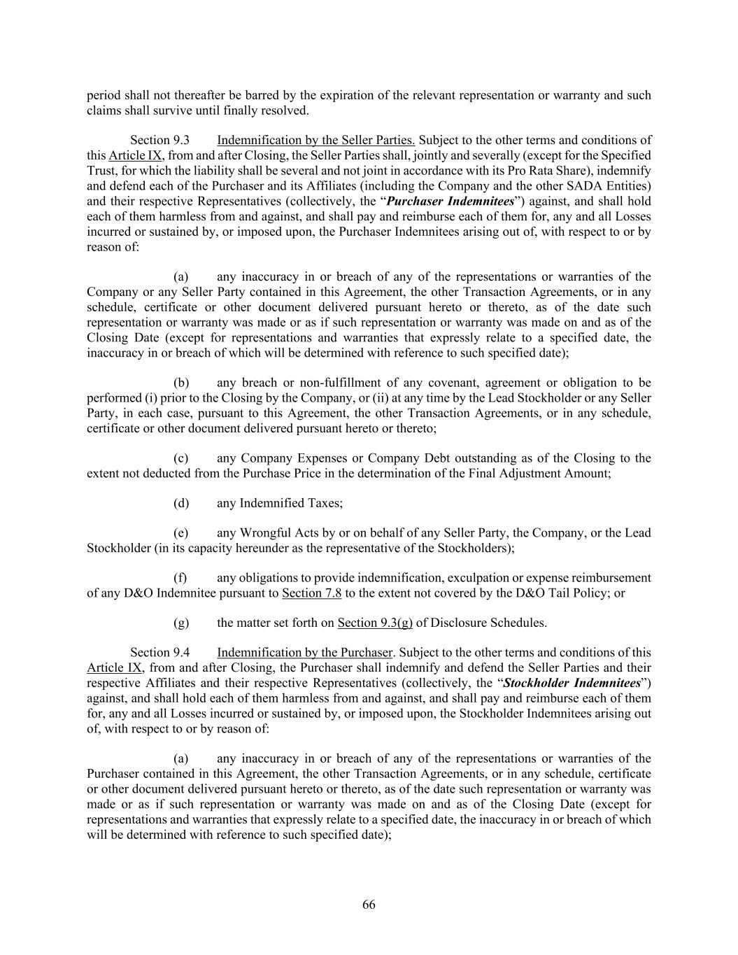 66 period shall not thereafter be barred by the expiration of the relevant representation or warranty and such claims shall survive until finally resolved. Section 9.3 Indemnification by the Seller Parties. Subject to the other terms and conditions of this Article IX, from and after Closing, the Seller Parties shall, jointly and severally (except for the Specified Trust, for which the liability shall be several and not joint in accordance with its Pro Rata Share), indemnify and defend each of the Purchaser and its Affiliates (including the Company and the other SADA Entities) and their respective Representatives (collectively, the “Purchaser Indemnitees”) against, and shall hold each of them harmless from and against, and shall pay and reimburse each of them for, any and all Losses incurred or sustained by, or imposed upon, the Purchaser Indemnitees arising out of, with respect to or by reason of: (a) any inaccuracy in or breach of any of the representations or warranties of the Company or any Seller Party contained in this Agreement, the other Transaction Agreements, or in any schedule, certificate or other document delivered pursuant hereto or thereto, as of the date such representation or warranty was made or as if such representation or warranty was made on and as of the Closing Date (except for representations and warranties that expressly relate to a specified date, the inaccuracy in or breach of which will be determined with reference to such specified date); (b) any breach or non-fulfillment of any covenant, agreement or obligation to be performed (i) prior to the Closing by the Company, or (ii) at any time by the Lead Stockholder or any Seller Party, in each case, pursuant to this Agreement, the other Transaction Agreements, or in any schedule, certificate or other document delivered pursuant hereto or thereto; (c) any Company Expenses or Company Debt outstanding as of the Closing to the extent not deducted from the Purchase Price in the determination of the Final Adjustment Amount; (d) any Indemnified Taxes; (e) any Wrongful Acts by or on behalf of any Seller Party, the Company, or the Lead Stockholder (in its capacity hereunder as the representative of the Stockholders); (f) any obligations to provide indemnification, exculpation or expense reimbursement of any D&O Indemnitee pursuant to Section 7.8 to the extent not covered by the D&O Tail Policy; or (g) the matter set forth on Section 9.3(g) of Disclosure Schedules. Section 9.4 Indemnification by the Purchaser. Subject to the other terms and conditions of this Article IX, from and after Closing, the Purchaser shall indemnify and defend the Seller Parties and their respective Affiliates and their respective Representatives (collectively, the “Stockholder Indemnitees”) against, and shall hold each of them harmless from and against, and shall pay and reimburse each of them for, any and all Losses incurred or sustained by, or imposed upon, the Stockholder Indemnitees arising out of, with respect to or by reason of: (a) any inaccuracy in or breach of any of the representations or warranties of the Purchaser contained in this Agreement, the other Transaction Agreements, or in any schedule, certificate or other document delivered pursuant hereto or thereto, as of the date such representation or warranty was made or as if such representation or warranty was made on and as of the Closing Date (except for representations and warranties that expressly relate to a specified date, the inaccuracy in or breach of which will be determined with reference to such specified date);