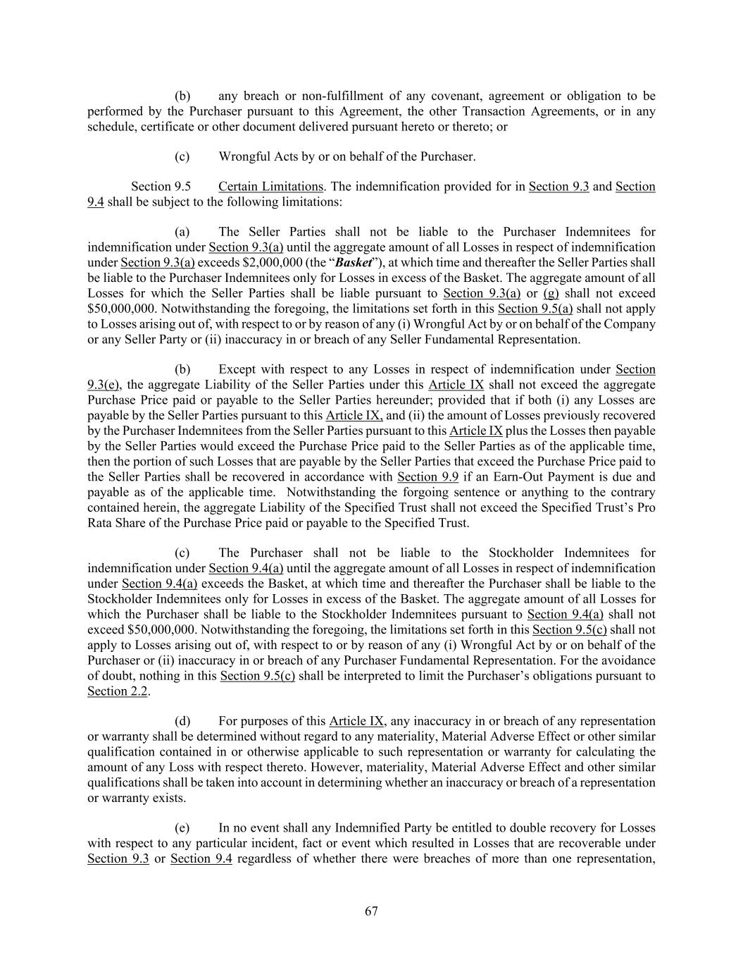 67 (b) any breach or non-fulfillment of any covenant, agreement or obligation to be performed by the Purchaser pursuant to this Agreement, the other Transaction Agreements, or in any schedule, certificate or other document delivered pursuant hereto or thereto; or (c) Wrongful Acts by or on behalf of the Purchaser. Section 9.5 Certain Limitations. The indemnification provided for in Section 9.3 and Section 9.4 shall be subject to the following limitations: (a) The Seller Parties shall not be liable to the Purchaser Indemnitees for indemnification under Section 9.3(a) until the aggregate amount of all Losses in respect of indemnification under Section 9.3(a) exceeds $2,000,000 (the “Basket”), at which time and thereafter the Seller Parties shall be liable to the Purchaser Indemnitees only for Losses in excess of the Basket. The aggregate amount of all Losses for which the Seller Parties shall be liable pursuant to Section 9.3(a) or (g) shall not exceed $50,000,000. Notwithstanding the foregoing, the limitations set forth in this Section 9.5(a) shall not apply to Losses arising out of, with respect to or by reason of any (i) Wrongful Act by or on behalf of the Company or any Seller Party or (ii) inaccuracy in or breach of any Seller Fundamental Representation. (b) Except with respect to any Losses in respect of indemnification under Section 9.3(e), the aggregate Liability of the Seller Parties under this Article IX shall not exceed the aggregate Purchase Price paid or payable to the Seller Parties hereunder; provided that if both (i) any Losses are payable by the Seller Parties pursuant to this Article IX, and (ii) the amount of Losses previously recovered by the Purchaser Indemnitees from the Seller Parties pursuant to this Article IX plus the Losses then payable by the Seller Parties would exceed the Purchase Price paid to the Seller Parties as of the applicable time, then the portion of such Losses that are payable by the Seller Parties that exceed the Purchase Price paid to the Seller Parties shall be recovered in accordance with Section 9.9 if an Earn-Out Payment is due and payable as of the applicable time. Notwithstanding the forgoing sentence or anything to the contrary contained herein, the aggregate Liability of the Specified Trust shall not exceed the Specified Trust’s Pro Rata Share of the Purchase Price paid or payable to the Specified Trust. (c) The Purchaser shall not be liable to the Stockholder Indemnitees for indemnification under Section 9.4(a) until the aggregate amount of all Losses in respect of indemnification under Section 9.4(a) exceeds the Basket, at which time and thereafter the Purchaser shall be liable to the Stockholder Indemnitees only for Losses in excess of the Basket. The aggregate amount of all Losses for which the Purchaser shall be liable to the Stockholder Indemnitees pursuant to Section 9.4(a) shall not exceed $50,000,000. Notwithstanding the foregoing, the limitations set forth in this Section 9.5(c) shall not apply to Losses arising out of, with respect to or by reason of any (i) Wrongful Act by or on behalf of the Purchaser or (ii) inaccuracy in or breach of any Purchaser Fundamental Representation. For the avoidance of doubt, nothing in this Section 9.5(c) shall be interpreted to limit the Purchaser’s obligations pursuant to Section 2.2. (d) For purposes of this Article IX, any inaccuracy in or breach of any representation or warranty shall be determined without regard to any materiality, Material Adverse Effect or other similar qualification contained in or otherwise applicable to such representation or warranty for calculating the amount of any Loss with respect thereto. However, materiality, Material Adverse Effect and other similar qualifications shall be taken into account in determining whether an inaccuracy or breach of a representation or warranty exists. (e) In no event shall any Indemnified Party be entitled to double recovery for Losses with respect to any particular incident, fact or event which resulted in Losses that are recoverable under Section 9.3 or Section 9.4 regardless of whether there were breaches of more than one representation,