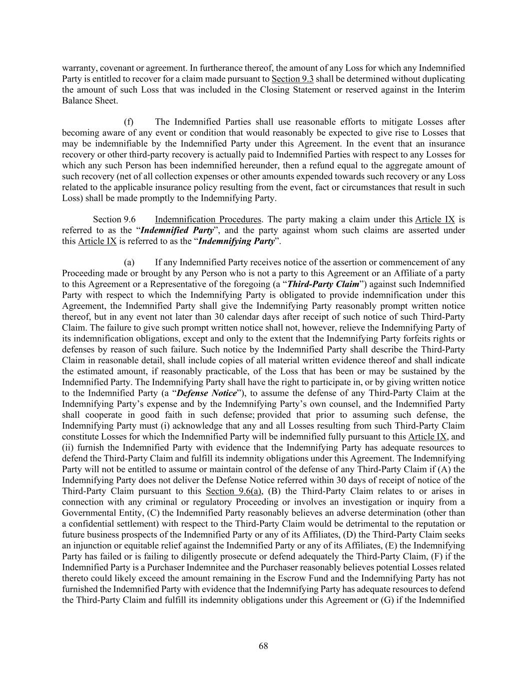 68 warranty, covenant or agreement. In furtherance thereof, the amount of any Loss for which any Indemnified Party is entitled to recover for a claim made pursuant to Section 9.3 shall be determined without duplicating the amount of such Loss that was included in the Closing Statement or reserved against in the Interim Balance Sheet. (f) The Indemnified Parties shall use reasonable efforts to mitigate Losses after becoming aware of any event or condition that would reasonably be expected to give rise to Losses that may be indemnifiable by the Indemnified Party under this Agreement. In the event that an insurance recovery or other third-party recovery is actually paid to Indemnified Parties with respect to any Losses for which any such Person has been indemnified hereunder, then a refund equal to the aggregate amount of such recovery (net of all collection expenses or other amounts expended towards such recovery or any Loss related to the applicable insurance policy resulting from the event, fact or circumstances that result in such Loss) shall be made promptly to the Indemnifying Party. Section 9.6 Indemnification Procedures. The party making a claim under this Article IX is referred to as the “Indemnified Party”, and the party against whom such claims are asserted under this Article IX is referred to as the “Indemnifying Party”. (a) If any Indemnified Party receives notice of the assertion or commencement of any Proceeding made or brought by any Person who is not a party to this Agreement or an Affiliate of a party to this Agreement or a Representative of the foregoing (a “Third-Party Claim”) against such Indemnified Party with respect to which the Indemnifying Party is obligated to provide indemnification under this Agreement, the Indemnified Party shall give the Indemnifying Party reasonably prompt written notice thereof, but in any event not later than 30 calendar days after receipt of such notice of such Third-Party Claim. The failure to give such prompt written notice shall not, however, relieve the Indemnifying Party of its indemnification obligations, except and only to the extent that the Indemnifying Party forfeits rights or defenses by reason of such failure. Such notice by the Indemnified Party shall describe the Third-Party Claim in reasonable detail, shall include copies of all material written evidence thereof and shall indicate the estimated amount, if reasonably practicable, of the Loss that has been or may be sustained by the Indemnified Party. The Indemnifying Party shall have the right to participate in, or by giving written notice to the Indemnified Party (a “Defense Notice”), to assume the defense of any Third-Party Claim at the Indemnifying Party’s expense and by the Indemnifying Party’s own counsel, and the Indemnified Party shall cooperate in good faith in such defense; provided that prior to assuming such defense, the Indemnifying Party must (i) acknowledge that any and all Losses resulting from such Third-Party Claim constitute Losses for which the Indemnified Party will be indemnified fully pursuant to this Article IX, and (ii) furnish the Indemnified Party with evidence that the Indemnifying Party has adequate resources to defend the Third-Party Claim and fulfill its indemnity obligations under this Agreement. The Indemnifying Party will not be entitled to assume or maintain control of the defense of any Third-Party Claim if (A) the Indemnifying Party does not deliver the Defense Notice referred within 30 days of receipt of notice of the Third-Party Claim pursuant to this Section 9.6(a), (B) the Third-Party Claim relates to or arises in connection with any criminal or regulatory Proceeding or involves an investigation or inquiry from a Governmental Entity, (C) the Indemnified Party reasonably believes an adverse determination (other than a confidential settlement) with respect to the Third-Party Claim would be detrimental to the reputation or future business prospects of the Indemnified Party or any of its Affiliates, (D) the Third-Party Claim seeks an injunction or equitable relief against the Indemnified Party or any of its Affiliates, (E) the Indemnifying Party has failed or is failing to diligently prosecute or defend adequately the Third-Party Claim, (F) if the Indemnified Party is a Purchaser Indemnitee and the Purchaser reasonably believes potential Losses related thereto could likely exceed the amount remaining in the Escrow Fund and the Indemnifying Party has not furnished the Indemnified Party with evidence that the Indemnifying Party has adequate resources to defend the Third-Party Claim and fulfill its indemnity obligations under this Agreement or (G) if the Indemnified