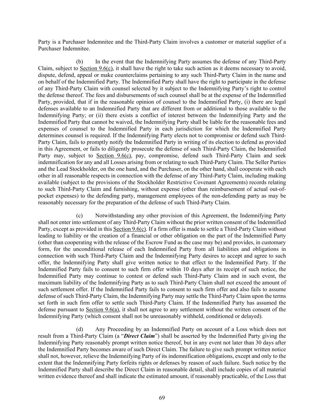 69 Party is a Purchaser Indemnitee and the Third-Party Claim involves a customer or material supplier of a Purchaser Indemnitee. (b) In the event that the Indemnifying Party assumes the defense of any Third-Party Claim, subject to Section 9.6(c), it shall have the right to take such action as it deems necessary to avoid, dispute, defend, appeal or make counterclaims pertaining to any such Third-Party Claim in the name and on behalf of the Indemnified Party. The Indemnified Party shall have the right to participate in the defense of any Third-Party Claim with counsel selected by it subject to the Indemnifying Party’s right to control the defense thereof. The fees and disbursements of such counsel shall be at the expense of the Indemnified Party, provided, that if in the reasonable opinion of counsel to the Indemnified Party, (i) there are legal defenses available to an Indemnified Party that are different from or additional to those available to the Indemnifying Party; or (ii) there exists a conflict of interest between the Indemnifying Party and the Indemnified Party that cannot be waived, the Indemnifying Party shall be liable for the reasonable fees and expenses of counsel to the Indemnified Party in each jurisdiction for which the Indemnified Party determines counsel is required. If the Indemnifying Party elects not to compromise or defend such Third- Party Claim, fails to promptly notify the Indemnified Party in writing of its election to defend as provided in this Agreement, or fails to diligently prosecute the defense of such Third-Party Claim, the Indemnified Party may, subject to Section 9.6(c), pay, compromise, defend such Third-Party Claim and seek indemnification for any and all Losses arising from or relating to such Third-Party Claim. The Seller Parties and the Lead Stockholder, on the one hand, and the Purchaser, on the other hand, shall cooperate with each other in all reasonable respects in connection with the defense of any Third-Party Claim, including making available (subject to the provisions of the Stockholder Restrictive Covenant Agreements) records relating to such Third-Party Claim and furnishing, without expense (other than reimbursement of actual out-of- pocket expenses) to the defending party, management employees of the non-defending party as may be reasonably necessary for the preparation of the defense of such Third-Party Claim. (c) Notwithstanding any other provision of this Agreement, the Indemnifying Party shall not enter into settlement of any Third-Party Claim without the prior written consent of the Indemnified Party, except as provided in this Section 9.6(c). If a firm offer is made to settle a Third-Party Claim without leading to liability or the creation of a financial or other obligation on the part of the Indemnified Party (other than cooperating with the release of the Escrow Fund as the case may be) and provides, in customary form, for the unconditional release of each Indemnified Party from all liabilities and obligations in connection with such Third-Party Claim and the Indemnifying Party desires to accept and agree to such offer, the Indemnifying Party shall give written notice to that effect to the Indemnified Party. If the Indemnified Party fails to consent to such firm offer within 10 days after its receipt of such notice, the Indemnified Party may continue to contest or defend such Third-Party Claim and in such event, the maximum liability of the Indemnifying Party as to such Third-Party Claim shall not exceed the amount of such settlement offer. If the Indemnified Party fails to consent to such firm offer and also fails to assume defense of such Third-Party Claim, the Indemnifying Party may settle the Third-Party Claim upon the terms set forth in such firm offer to settle such Third-Party Claim. If the Indemnified Party has assumed the defense pursuant to Section 9.6(a), it shall not agree to any settlement without the written consent of the Indemnifying Party (which consent shall not be unreasonably withheld, conditioned or delayed). (d) Any Proceeding by an Indemnified Party on account of a Loss which does not result from a Third-Party Claim (a “Direct Claim”) shall be asserted by the Indemnified Party giving the Indemnifying Party reasonably prompt written notice thereof, but in any event not later than 30 days after the Indemnified Party becomes aware of such Direct Claim. The failure to give such prompt written notice shall not, however, relieve the Indemnifying Party of its indemnification obligations, except and only to the extent that the Indemnifying Party forfeits rights or defenses by reason of such failure. Such notice by the Indemnified Party shall describe the Direct Claim in reasonable detail, shall include copies of all material written evidence thereof and shall indicate the estimated amount, if reasonably practicable, of the Loss that