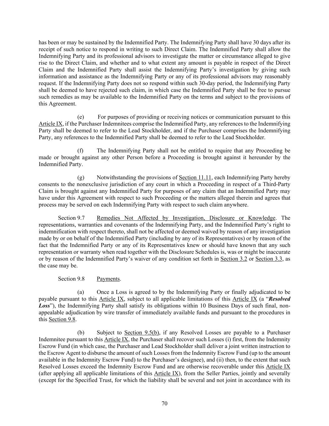 70 has been or may be sustained by the Indemnified Party. The Indemnifying Party shall have 30 days after its receipt of such notice to respond in writing to such Direct Claim. The Indemnified Party shall allow the Indemnifying Party and its professional advisors to investigate the matter or circumstance alleged to give rise to the Direct Claim, and whether and to what extent any amount is payable in respect of the Direct Claim and the Indemnified Party shall assist the Indemnifying Party’s investigation by giving such information and assistance as the Indemnifying Party or any of its professional advisors may reasonably request. If the Indemnifying Party does not so respond within such 30-day period, the Indemnifying Party shall be deemed to have rejected such claim, in which case the Indemnified Party shall be free to pursue such remedies as may be available to the Indemnified Party on the terms and subject to the provisions of this Agreement. (e) For purposes of providing or receiving notices or communication pursuant to this Article IX, if the Purchaser Indemnitees comprise the Indemnified Party, any references to the Indemnifying Party shall be deemed to refer to the Lead Stockholder, and if the Purchaser comprises the Indemnifying Party, any references to the Indemnified Party shall be deemed to refer to the Lead Stockholder. (f) The Indemnifying Party shall not be entitled to require that any Proceeding be made or brought against any other Person before a Proceeding is brought against it hereunder by the Indemnified Party. (g) Notwithstanding the provisions of Section 11.11, each Indemnifying Party hereby consents to the nonexclusive jurisdiction of any court in which a Proceeding in respect of a Third-Party Claim is brought against any Indemnified Party for purposes of any claim that an Indemnified Party may have under this Agreement with respect to such Proceeding or the matters alleged therein and agrees that process may be served on each Indemnifying Party with respect to such claim anywhere. Section 9.7 Remedies Not Affected by Investigation, Disclosure or Knowledge. The representations, warranties and covenants of the Indemnifying Party, and the Indemnified Party’s right to indemnification with respect thereto, shall not be affected or deemed waived by reason of any investigation made by or on behalf of the Indemnified Party (including by any of its Representatives) or by reason of the fact that the Indemnified Party or any of its Representatives knew or should have known that any such representation or warranty when read together with the Disclosure Schedules is, was or might be inaccurate or by reason of the Indemnified Party’s waiver of any condition set forth in Section 3.2 or Section 3.3, as the case may be. Section 9.8 Payments. (a) Once a Loss is agreed to by the Indemnifying Party or finally adjudicated to be payable pursuant to this Article IX, subject to all applicable limitations of this Article IX (a “Resolved Loss”), the Indemnifying Party shall satisfy its obligations within 10 Business Days of such final, non- appealable adjudication by wire transfer of immediately available funds and pursuant to the procedures in this Section 9.8. (b) Subject to Section 9.5(b), if any Resolved Losses are payable to a Purchaser Indemnitee pursuant to this Article IX, the Purchaser shall recover such Losses (i) first, from the Indemnity Escrow Fund (in which case, the Purchaser and Lead Stockholder shall deliver a joint written instruction to the Escrow Agent to disburse the amount of such Losses from the Indemnity Escrow Fund (up to the amount available in the Indemnity Escrow Fund) to the Purchaser’s designee), and (ii) then, to the extent that such Resolved Losses exceed the Indemnity Escrow Fund and are otherwise recoverable under this Article IX (after applying all applicable limitations of this Article IX), from the Seller Parties, jointly and severally (except for the Specified Trust, for which the liability shall be several and not joint in accordance with its