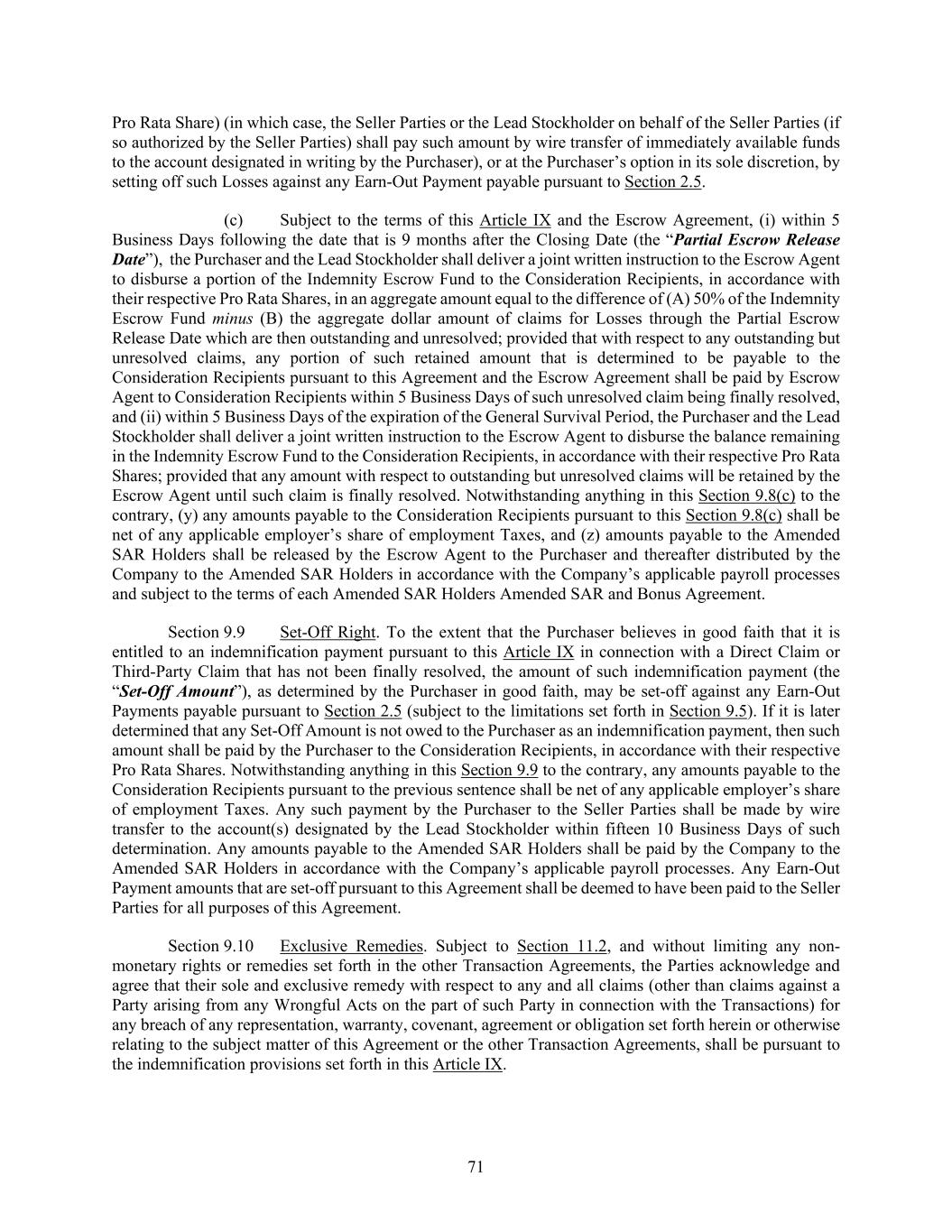 71 Pro Rata Share) (in which case, the Seller Parties or the Lead Stockholder on behalf of the Seller Parties (if so authorized by the Seller Parties) shall pay such amount by wire transfer of immediately available funds to the account designated in writing by the Purchaser), or at the Purchaser’s option in its sole discretion, by setting off such Losses against any Earn-Out Payment payable pursuant to Section 2.5. (c) Subject to the terms of this Article IX and the Escrow Agreement, (i) within 5 Business Days following the date that is 9 months after the Closing Date (the “Partial Escrow Release Date”), the Purchaser and the Lead Stockholder shall deliver a joint written instruction to the Escrow Agent to disburse a portion of the Indemnity Escrow Fund to the Consideration Recipients, in accordance with their respective Pro Rata Shares, in an aggregate amount equal to the difference of (A) 50% of the Indemnity Escrow Fund minus (B) the aggregate dollar amount of claims for Losses through the Partial Escrow Release Date which are then outstanding and unresolved; provided that with respect to any outstanding but unresolved claims, any portion of such retained amount that is determined to be payable to the Consideration Recipients pursuant to this Agreement and the Escrow Agreement shall be paid by Escrow Agent to Consideration Recipients within 5 Business Days of such unresolved claim being finally resolved, and (ii) within 5 Business Days of the expiration of the General Survival Period, the Purchaser and the Lead Stockholder shall deliver a joint written instruction to the Escrow Agent to disburse the balance remaining in the Indemnity Escrow Fund to the Consideration Recipients, in accordance with their respective Pro Rata Shares; provided that any amount with respect to outstanding but unresolved claims will be retained by the Escrow Agent until such claim is finally resolved. Notwithstanding anything in this Section 9.8(c) to the contrary, (y) any amounts payable to the Consideration Recipients pursuant to this Section 9.8(c) shall be net of any applicable employer’s share of employment Taxes, and (z) amounts payable to the Amended SAR Holders shall be released by the Escrow Agent to the Purchaser and thereafter distributed by the Company to the Amended SAR Holders in accordance with the Company’s applicable payroll processes and subject to the terms of each Amended SAR Holders Amended SAR and Bonus Agreement. Section 9.9 Set-Off Right. To the extent that the Purchaser believes in good faith that it is entitled to an indemnification payment pursuant to this Article IX in connection with a Direct Claim or Third-Party Claim that has not been finally resolved, the amount of such indemnification payment (the “Set-Off Amount”), as determined by the Purchaser in good faith, may be set-off against any Earn-Out Payments payable pursuant to Section 2.5 (subject to the limitations set forth in Section 9.5). If it is later determined that any Set-Off Amount is not owed to the Purchaser as an indemnification payment, then such amount shall be paid by the Purchaser to the Consideration Recipients, in accordance with their respective Pro Rata Shares. Notwithstanding anything in this Section 9.9 to the contrary, any amounts payable to the Consideration Recipients pursuant to the previous sentence shall be net of any applicable employer’s share of employment Taxes. Any such payment by the Purchaser to the Seller Parties shall be made by wire transfer to the account(s) designated by the Lead Stockholder within fifteen 10 Business Days of such determination. Any amounts payable to the Amended SAR Holders shall be paid by the Company to the Amended SAR Holders in accordance with the Company’s applicable payroll processes. Any Earn-Out Payment amounts that are set-off pursuant to this Agreement shall be deemed to have been paid to the Seller Parties for all purposes of this Agreement. Section 9.10 Exclusive Remedies. Subject to Section 11.2, and without limiting any non- monetary rights or remedies set forth in the other Transaction Agreements, the Parties acknowledge and agree that their sole and exclusive remedy with respect to any and all claims (other than claims against a Party arising from any Wrongful Acts on the part of such Party in connection with the Transactions) for any breach of any representation, warranty, covenant, agreement or obligation set forth herein or otherwise relating to the subject matter of this Agreement or the other Transaction Agreements, shall be pursuant to the indemnification provisions set forth in this Article IX.