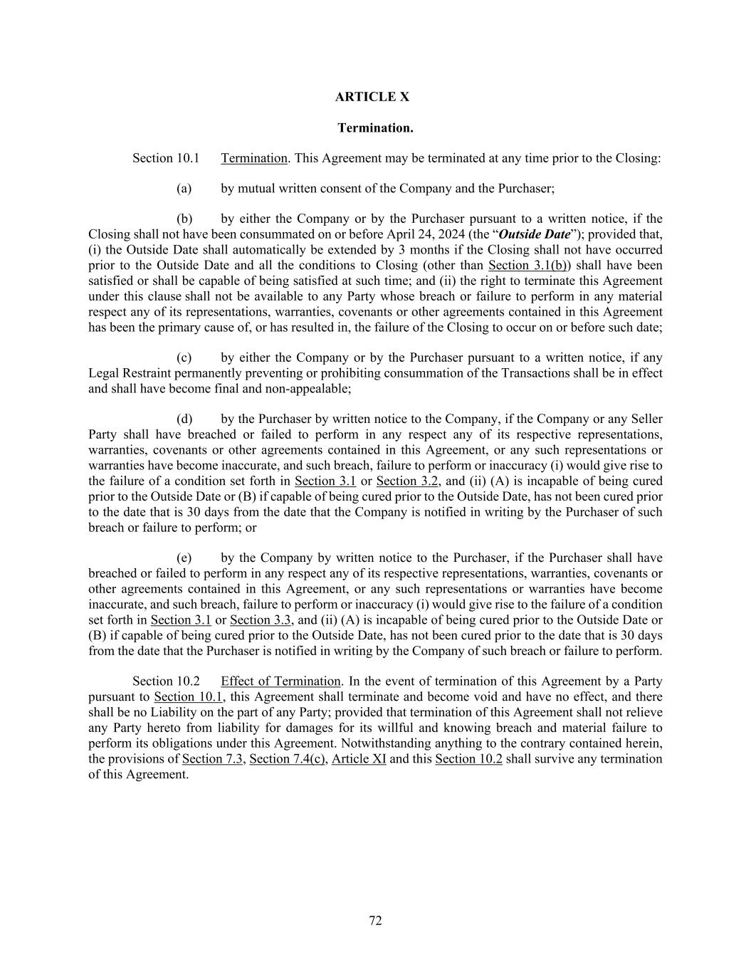 72 ARTICLE X Termination. Section 10.1 Termination. This Agreement may be terminated at any time prior to the Closing: (a) by mutual written consent of the Company and the Purchaser; (b) by either the Company or by the Purchaser pursuant to a written notice, if the Closing shall not have been consummated on or before April 24, 2024 (the “Outside Date”); provided that, (i) the Outside Date shall automatically be extended by 3 months if the Closing shall not have occurred prior to the Outside Date and all the conditions to Closing (other than Section 3.1(b)) shall have been satisfied or shall be capable of being satisfied at such time; and (ii) the right to terminate this Agreement under this clause shall not be available to any Party whose breach or failure to perform in any material respect any of its representations, warranties, covenants or other agreements contained in this Agreement has been the primary cause of, or has resulted in, the failure of the Closing to occur on or before such date; (c) by either the Company or by the Purchaser pursuant to a written notice, if any Legal Restraint permanently preventing or prohibiting consummation of the Transactions shall be in effect and shall have become final and non-appealable; (d) by the Purchaser by written notice to the Company, if the Company or any Seller Party shall have breached or failed to perform in any respect any of its respective representations, warranties, covenants or other agreements contained in this Agreement, or any such representations or warranties have become inaccurate, and such breach, failure to perform or inaccuracy (i) would give rise to the failure of a condition set forth in Section 3.1 or Section 3.2, and (ii) (A) is incapable of being cured prior to the Outside Date or (B) if capable of being cured prior to the Outside Date, has not been cured prior to the date that is 30 days from the date that the Company is notified in writing by the Purchaser of such breach or failure to perform; or (e) by the Company by written notice to the Purchaser, if the Purchaser shall have breached or failed to perform in any respect any of its respective representations, warranties, covenants or other agreements contained in this Agreement, or any such representations or warranties have become inaccurate, and such breach, failure to perform or inaccuracy (i) would give rise to the failure of a condition set forth in Section 3.1 or Section 3.3, and (ii) (A) is incapable of being cured prior to the Outside Date or (B) if capable of being cured prior to the Outside Date, has not been cured prior to the date that is 30 days from the date that the Purchaser is notified in writing by the Company of such breach or failure to perform. Section 10.2 Effect of Termination. In the event of termination of this Agreement by a Party pursuant to Section 10.1, this Agreement shall terminate and become void and have no effect, and there shall be no Liability on the part of any Party; provided that termination of this Agreement shall not relieve any Party hereto from liability for damages for its willful and knowing breach and material failure to perform its obligations under this Agreement. Notwithstanding anything to the contrary contained herein, the provisions of Section 7.3, Section 7.4(c), Article XI and this Section 10.2 shall survive any termination of this Agreement.