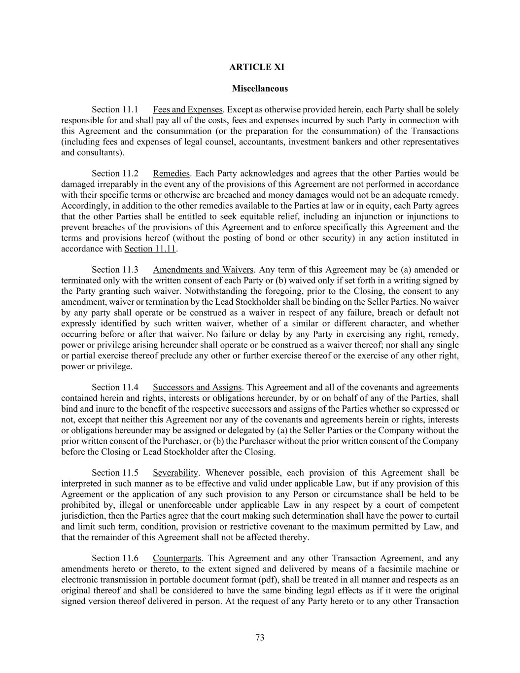 73 ARTICLE XI Miscellaneous Section 11.1 Fees and Expenses. Except as otherwise provided herein, each Party shall be solely responsible for and shall pay all of the costs, fees and expenses incurred by such Party in connection with this Agreement and the consummation (or the preparation for the consummation) of the Transactions (including fees and expenses of legal counsel, accountants, investment bankers and other representatives and consultants). Section 11.2 Remedies. Each Party acknowledges and agrees that the other Parties would be damaged irreparably in the event any of the provisions of this Agreement are not performed in accordance with their specific terms or otherwise are breached and money damages would not be an adequate remedy. Accordingly, in addition to the other remedies available to the Parties at law or in equity, each Party agrees that the other Parties shall be entitled to seek equitable relief, including an injunction or injunctions to prevent breaches of the provisions of this Agreement and to enforce specifically this Agreement and the terms and provisions hereof (without the posting of bond or other security) in any action instituted in accordance with Section 11.11. Section 11.3 Amendments and Waivers. Any term of this Agreement may be (a) amended or terminated only with the written consent of each Party or (b) waived only if set forth in a writing signed by the Party granting such waiver. Notwithstanding the foregoing, prior to the Closing, the consent to any amendment, waiver or termination by the Lead Stockholder shall be binding on the Seller Parties. No waiver by any party shall operate or be construed as a waiver in respect of any failure, breach or default not expressly identified by such written waiver, whether of a similar or different character, and whether occurring before or after that waiver. No failure or delay by any Party in exercising any right, remedy, power or privilege arising hereunder shall operate or be construed as a waiver thereof; nor shall any single or partial exercise thereof preclude any other or further exercise thereof or the exercise of any other right, power or privilege. Section 11.4 Successors and Assigns. This Agreement and all of the covenants and agreements contained herein and rights, interests or obligations hereunder, by or on behalf of any of the Parties, shall bind and inure to the benefit of the respective successors and assigns of the Parties whether so expressed or not, except that neither this Agreement nor any of the covenants and agreements herein or rights, interests or obligations hereunder may be assigned or delegated by (a) the Seller Parties or the Company without the prior written consent of the Purchaser, or (b) the Purchaser without the prior written consent of the Company before the Closing or Lead Stockholder after the Closing. Section 11.5 Severability. Whenever possible, each provision of this Agreement shall be interpreted in such manner as to be effective and valid under applicable Law, but if any provision of this Agreement or the application of any such provision to any Person or circumstance shall be held to be prohibited by, illegal or unenforceable under applicable Law in any respect by a court of competent jurisdiction, then the Parties agree that the court making such determination shall have the power to curtail and limit such term, condition, provision or restrictive covenant to the maximum permitted by Law, and that the remainder of this Agreement shall not be affected thereby. Section 11.6 Counterparts. This Agreement and any other Transaction Agreement, and any amendments hereto or thereto, to the extent signed and delivered by means of a facsimile machine or electronic transmission in portable document format (pdf), shall be treated in all manner and respects as an original thereof and shall be considered to have the same binding legal effects as if it were the original signed version thereof delivered in person. At the request of any Party hereto or to any other Transaction