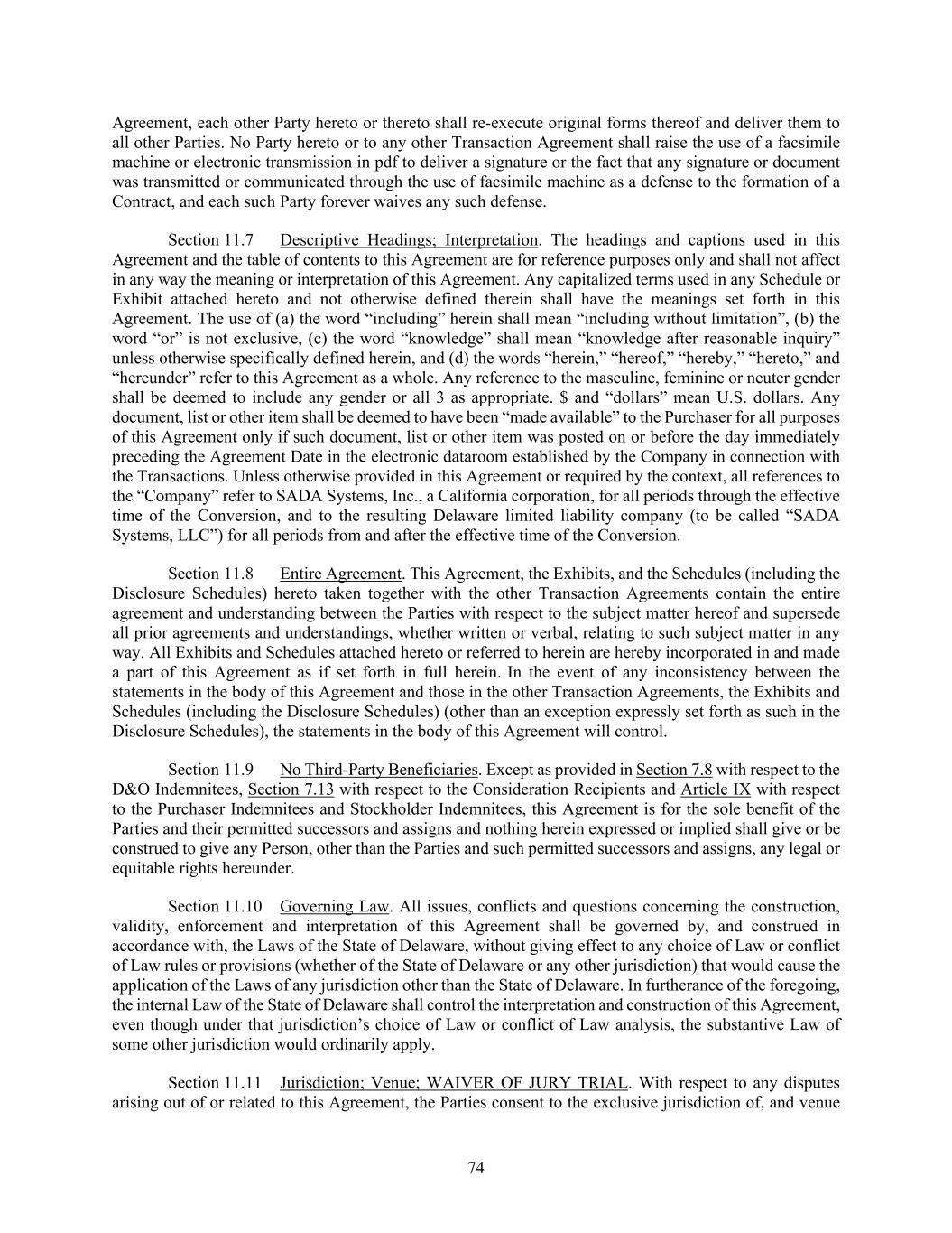 74 Agreement, each other Party hereto or thereto shall re-execute original forms thereof and deliver them to all other Parties. No Party hereto or to any other Transaction Agreement shall raise the use of a facsimile machine or electronic transmission in pdf to deliver a signature or the fact that any signature or document was transmitted or communicated through the use of facsimile machine as a defense to the formation of a Contract, and each such Party forever waives any such defense. Section 11.7 Descriptive Headings; Interpretation. The headings and captions used in this Agreement and the table of contents to this Agreement are for reference purposes only and shall not affect in any way the meaning or interpretation of this Agreement. Any capitalized terms used in any Schedule or Exhibit attached hereto and not otherwise defined therein shall have the meanings set forth in this Agreement. The use of (a) the word “including” herein shall mean “including without limitation”, (b) the word “or” is not exclusive, (c) the word “knowledge” shall mean “knowledge after reasonable inquiry” unless otherwise specifically defined herein, and (d) the words “herein,” “hereof,” “hereby,” “hereto,” and “hereunder” refer to this Agreement as a whole. Any reference to the masculine, feminine or neuter gender shall be deemed to include any gender or all 3 as appropriate. $ and “dollars” mean U.S. dollars. Any document, list or other item shall be deemed to have been “made available” to the Purchaser for all purposes of this Agreement only if such document, list or other item was posted on or before the day immediately preceding the Agreement Date in the electronic dataroom established by the Company in connection with the Transactions. Unless otherwise provided in this Agreement or required by the context, all references to the “Company” refer to SADA Systems, Inc., a California corporation, for all periods through the effective time of the Conversion, and to the resulting Delaware limited liability company (to be called “SADA Systems, LLC”) for all periods from and after the effective time of the Conversion. Section 11.8 Entire Agreement. This Agreement, the Exhibits, and the Schedules (including the Disclosure Schedules) hereto taken together with the other Transaction Agreements contain the entire agreement and understanding between the Parties with respect to the subject matter hereof and supersede all prior agreements and understandings, whether written or verbal, relating to such subject matter in any way. All Exhibits and Schedules attached hereto or referred to herein are hereby incorporated in and made a part of this Agreement as if set forth in full herein. In the event of any inconsistency between the statements in the body of this Agreement and those in the other Transaction Agreements, the Exhibits and Schedules (including the Disclosure Schedules) (other than an exception expressly set forth as such in the Disclosure Schedules), the statements in the body of this Agreement will control. Section 11.9 No Third-Party Beneficiaries. Except as provided in Section 7.8 with respect to the D&O Indemnitees, Section 7.13 with respect to the Consideration Recipients and Article IX with respect to the Purchaser Indemnitees and Stockholder Indemnitees, this Agreement is for the sole benefit of the Parties and their permitted successors and assigns and nothing herein expressed or implied shall give or be construed to give any Person, other than the Parties and such permitted successors and assigns, any legal or equitable rights hereunder. Section 11.10 Governing Law. All issues, conflicts and questions concerning the construction, validity, enforcement and interpretation of this Agreement shall be governed by, and construed in accordance with, the Laws of the State of Delaware, without giving effect to any choice of Law or conflict of Law rules or provisions (whether of the State of Delaware or any other jurisdiction) that would cause the application of the Laws of any jurisdiction other than the State of Delaware. In furtherance of the foregoing, the internal Law of the State of Delaware shall control the interpretation and construction of this Agreement, even though under that jurisdiction’s choice of Law or conflict of Law analysis, the substantive Law of some other jurisdiction would ordinarily apply. Section 11.11 Jurisdiction; Venue; WAIVER OF JURY TRIAL. With respect to any disputes arising out of or related to this Agreement, the Parties consent to the exclusive jurisdiction of, and venue