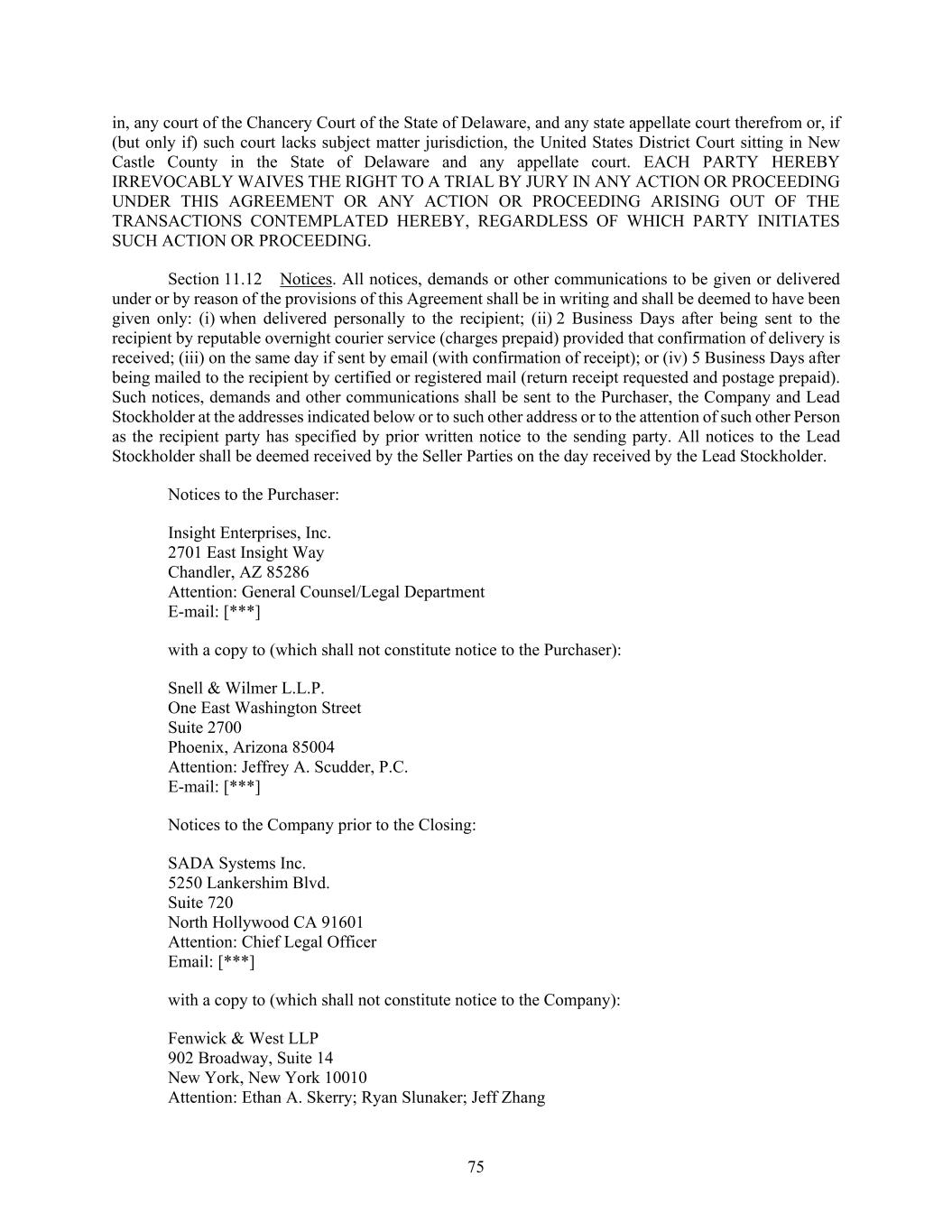 75 in, any court of the Chancery Court of the State of Delaware, and any state appellate court therefrom or, if (but only if) such court lacks subject matter jurisdiction, the United States District Court sitting in New Castle County in the State of Delaware and any appellate court. EACH PARTY HEREBY IRREVOCABLY WAIVES THE RIGHT TO A TRIAL BY JURY IN ANY ACTION OR PROCEEDING UNDER THIS AGREEMENT OR ANY ACTION OR PROCEEDING ARISING OUT OF THE TRANSACTIONS CONTEMPLATED HEREBY, REGARDLESS OF WHICH PARTY INITIATES SUCH ACTION OR PROCEEDING. Section 11.12 Notices. All notices, demands or other communications to be given or delivered under or by reason of the provisions of this Agreement shall be in writing and shall be deemed to have been given only: (i) when delivered personally to the recipient; (ii) 2 Business Days after being sent to the recipient by reputable overnight courier service (charges prepaid) provided that confirmation of delivery is received; (iii) on the same day if sent by email (with confirmation of receipt); or (iv) 5 Business Days after being mailed to the recipient by certified or registered mail (return receipt requested and postage prepaid). Such notices, demands and other communications shall be sent to the Purchaser, the Company and Lead Stockholder at the addresses indicated below or to such other address or to the attention of such other Person as the recipient party has specified by prior written notice to the sending party. All notices to the Lead Stockholder shall be deemed received by the Seller Parties on the day received by the Lead Stockholder. Notices to the Purchaser: Insight Enterprises, Inc. 2701 East Insight Way Chandler, AZ 85286 Attention: General Counsel/Legal Department E-mail: [***] with a copy to (which shall not constitute notice to the Purchaser): Snell & Wilmer L.L.P. One East Washington Street Suite 2700 Phoenix, Arizona 85004 Attention: Jeffrey A. Scudder, P.C. E-mail: [***] Notices to the Company prior to the Closing: SADA Systems Inc. 5250 Lankershim Blvd. Suite 720 North Hollywood CA 91601 Attention: Chief Legal Officer Email: [***] with a copy to (which shall not constitute notice to the Company): Fenwick & West LLP 902 Broadway, Suite 14 New York, New York 10010 Attention: Ethan A. Skerry; Ryan Slunaker; Jeff Zhang