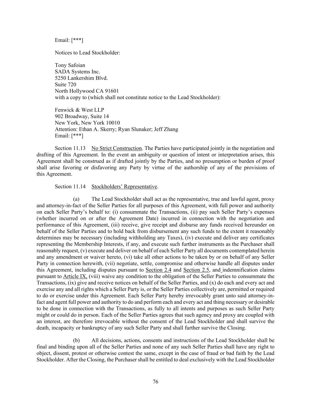 76 Email: [***] Notices to Lead Stockholder: Tony Safoian SADA Systems Inc. 5250 Lankershim Blvd. Suite 720 North Hollywood CA 91601 with a copy to (which shall not constitute notice to the Lead Stockholder): Fenwick & West LLP 902 Broadway, Suite 14 New York, New York 10010 Attention: Ethan A. Skerry; Ryan Slunaker; Jeff Zhang Email: [***] Section 11.13 No Strict Construction. The Parties have participated jointly in the negotiation and drafting of this Agreement. In the event an ambiguity or question of intent or interpretation arises, this Agreement shall be construed as if drafted jointly by the Parties, and no presumption or burden of proof shall arise favoring or disfavoring any Party by virtue of the authorship of any of the provisions of this Agreement. Section 11.14 Stockholders’ Representative. (a) The Lead Stockholder shall act as the representative, true and lawful agent, proxy and attorney-in-fact of the Seller Parties for all purposes of this Agreement, with full power and authority on each Seller Party’s behalf to: (i) consummate the Transactions, (ii) pay such Seller Party’s expenses (whether incurred on or after the Agreement Date) incurred in connection with the negotiation and performance of this Agreement, (iii) receive, give receipt and disburse any funds received hereunder on behalf of the Seller Parties and to hold back from disbursement any such funds to the extent it reasonably determines may be necessary (including withholding any Taxes), (iv) execute and deliver any certificates representing the Membership Interests, if any, and execute such further instruments as the Purchaser shall reasonably request, (v) execute and deliver on behalf of each Seller Party all documents contemplated herein and any amendment or waiver hereto, (vi) take all other actions to be taken by or on behalf of any Seller Party in connection herewith, (vii) negotiate, settle, compromise and otherwise handle all disputes under this Agreement, including disputes pursuant to Section 2.4 and Section 2.5, and indemnification claims pursuant to Article IX, (viii) waive any condition to the obligation of the Seller Parties to consummate the Transactions, (ix) give and receive notices on behalf of the Seller Parties, and (x) do each and every act and exercise any and all rights which a Seller Party is, or the Seller Parties collectively are, permitted or required to do or exercise under this Agreement. Each Seller Party hereby irrevocably grant unto said attorney-in- fact and agent full power and authority to do and perform each and every act and thing necessary or desirable to be done in connection with the Transactions, as fully to all intents and purposes as such Seller Party might or could do in person. Each of the Seller Parties agrees that such agency and proxy are coupled with an interest, are therefore irrevocable without the consent of the Lead Stockholder and shall survive the death, incapacity or bankruptcy of any such Seller Party and shall further survive the Closing. (b) All decisions, actions, consents and instructions of the Lead Stockholder shall be final and binding upon all of the Seller Parties and none of any such Seller Parties shall have any right to object, dissent, protest or otherwise contest the same, except in the case of fraud or bad faith by the Lead Stockholder. After the Closing, the Purchaser shall be entitled to deal exclusively with the Lead Stockholder