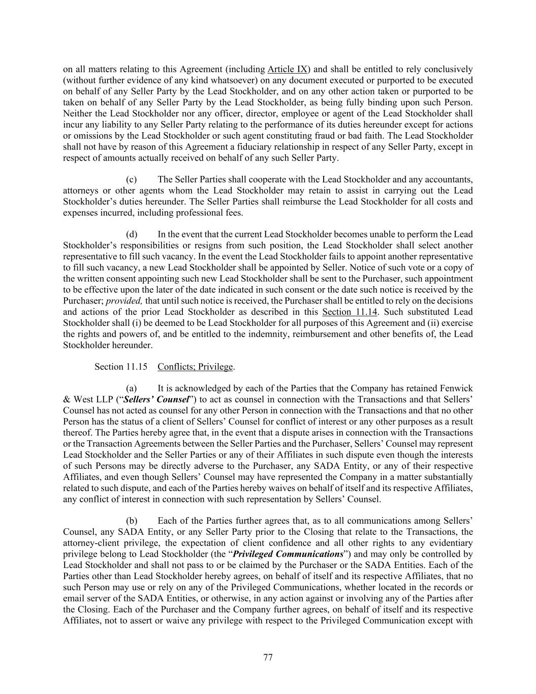 77 on all matters relating to this Agreement (including Article IX) and shall be entitled to rely conclusively (without further evidence of any kind whatsoever) on any document executed or purported to be executed on behalf of any Seller Party by the Lead Stockholder, and on any other action taken or purported to be taken on behalf of any Seller Party by the Lead Stockholder, as being fully binding upon such Person. Neither the Lead Stockholder nor any officer, director, employee or agent of the Lead Stockholder shall incur any liability to any Seller Party relating to the performance of its duties hereunder except for actions or omissions by the Lead Stockholder or such agent constituting fraud or bad faith. The Lead Stockholder shall not have by reason of this Agreement a fiduciary relationship in respect of any Seller Party, except in respect of amounts actually received on behalf of any such Seller Party. (c) The Seller Parties shall cooperate with the Lead Stockholder and any accountants, attorneys or other agents whom the Lead Stockholder may retain to assist in carrying out the Lead Stockholder’s duties hereunder. The Seller Parties shall reimburse the Lead Stockholder for all costs and expenses incurred, including professional fees. (d) In the event that the current Lead Stockholder becomes unable to perform the Lead Stockholder’s responsibilities or resigns from such position, the Lead Stockholder shall select another representative to fill such vacancy. In the event the Lead Stockholder fails to appoint another representative to fill such vacancy, a new Lead Stockholder shall be appointed by Seller. Notice of such vote or a copy of the written consent appointing such new Lead Stockholder shall be sent to the Purchaser, such appointment to be effective upon the later of the date indicated in such consent or the date such notice is received by the Purchaser; provided, that until such notice is received, the Purchaser shall be entitled to rely on the decisions and actions of the prior Lead Stockholder as described in this Section 11.14. Such substituted Lead Stockholder shall (i) be deemed to be Lead Stockholder for all purposes of this Agreement and (ii) exercise the rights and powers of, and be entitled to the indemnity, reimbursement and other benefits of, the Lead Stockholder hereunder. Section 11.15 Conflicts; Privilege. (a) It is acknowledged by each of the Parties that the Company has retained Fenwick & West LLP (“Sellers’ Counsel”) to act as counsel in connection with the Transactions and that Sellers’ Counsel has not acted as counsel for any other Person in connection with the Transactions and that no other Person has the status of a client of Sellers’ Counsel for conflict of interest or any other purposes as a result thereof. The Parties hereby agree that, in the event that a dispute arises in connection with the Transactions or the Transaction Agreements between the Seller Parties and the Purchaser, Sellers’ Counsel may represent Lead Stockholder and the Seller Parties or any of their Affiliates in such dispute even though the interests of such Persons may be directly adverse to the Purchaser, any SADA Entity, or any of their respective Affiliates, and even though Sellers’ Counsel may have represented the Company in a matter substantially related to such dispute, and each of the Parties hereby waives on behalf of itself and its respective Affiliates, any conflict of interest in connection with such representation by Sellers’ Counsel. (b) Each of the Parties further agrees that, as to all communications among Sellers’ Counsel, any SADA Entity, or any Seller Party prior to the Closing that relate to the Transactions, the attorney-client privilege, the expectation of client confidence and all other rights to any evidentiary privilege belong to Lead Stockholder (the “Privileged Communications”) and may only be controlled by Lead Stockholder and shall not pass to or be claimed by the Purchaser or the SADA Entities. Each of the Parties other than Lead Stockholder hereby agrees, on behalf of itself and its respective Affiliates, that no such Person may use or rely on any of the Privileged Communications, whether located in the records or email server of the SADA Entities, or otherwise, in any action against or involving any of the Parties after the Closing. Each of the Purchaser and the Company further agrees, on behalf of itself and its respective Affiliates, not to assert or waive any privilege with respect to the Privileged Communication except with