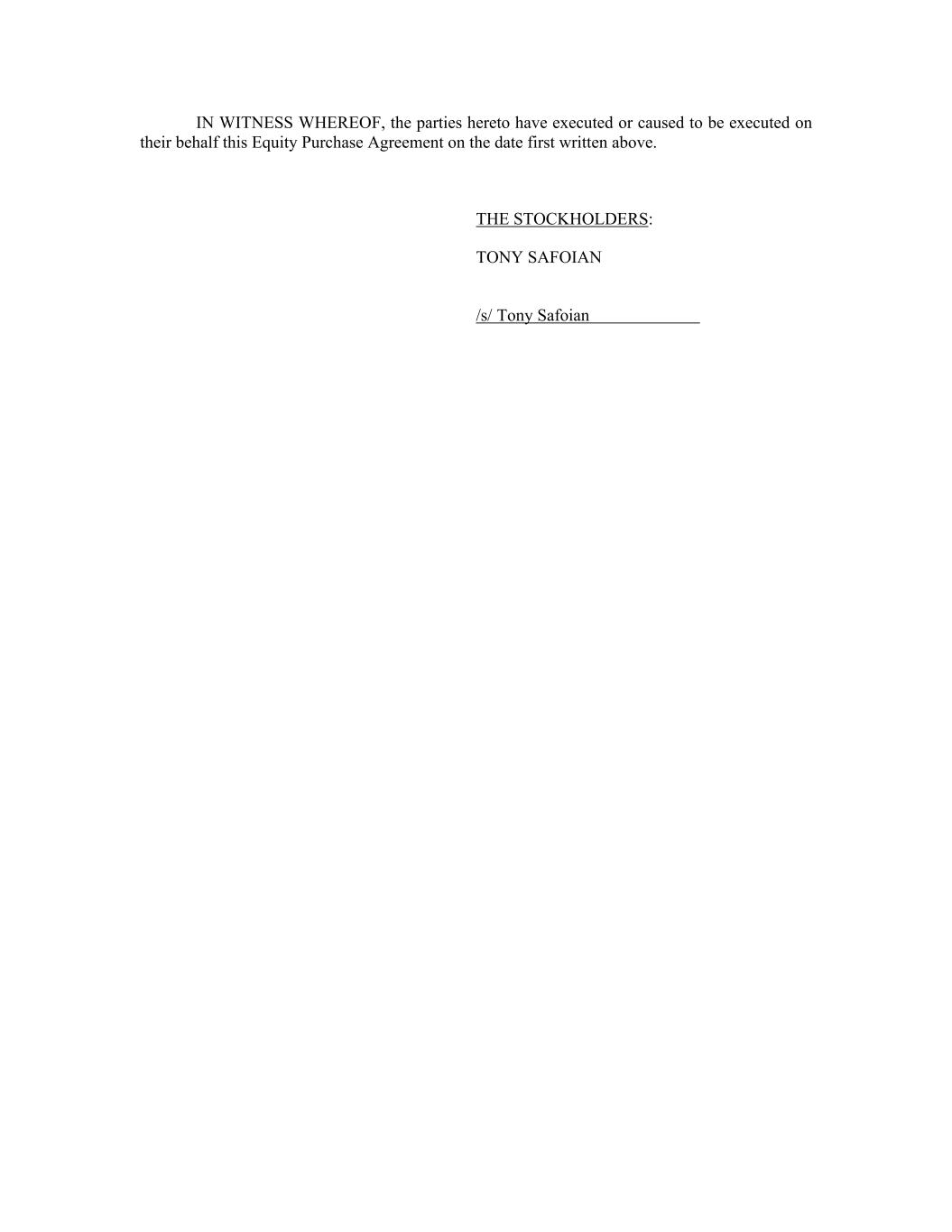 IN WITNESS WHEREOF, the parties hereto have executed or caused to be executed on their behalf this Equity Purchase Agreement on the date first written above. THE STOCKHOLDERS: TONY SAFOIAN /s/ Tony Safoian