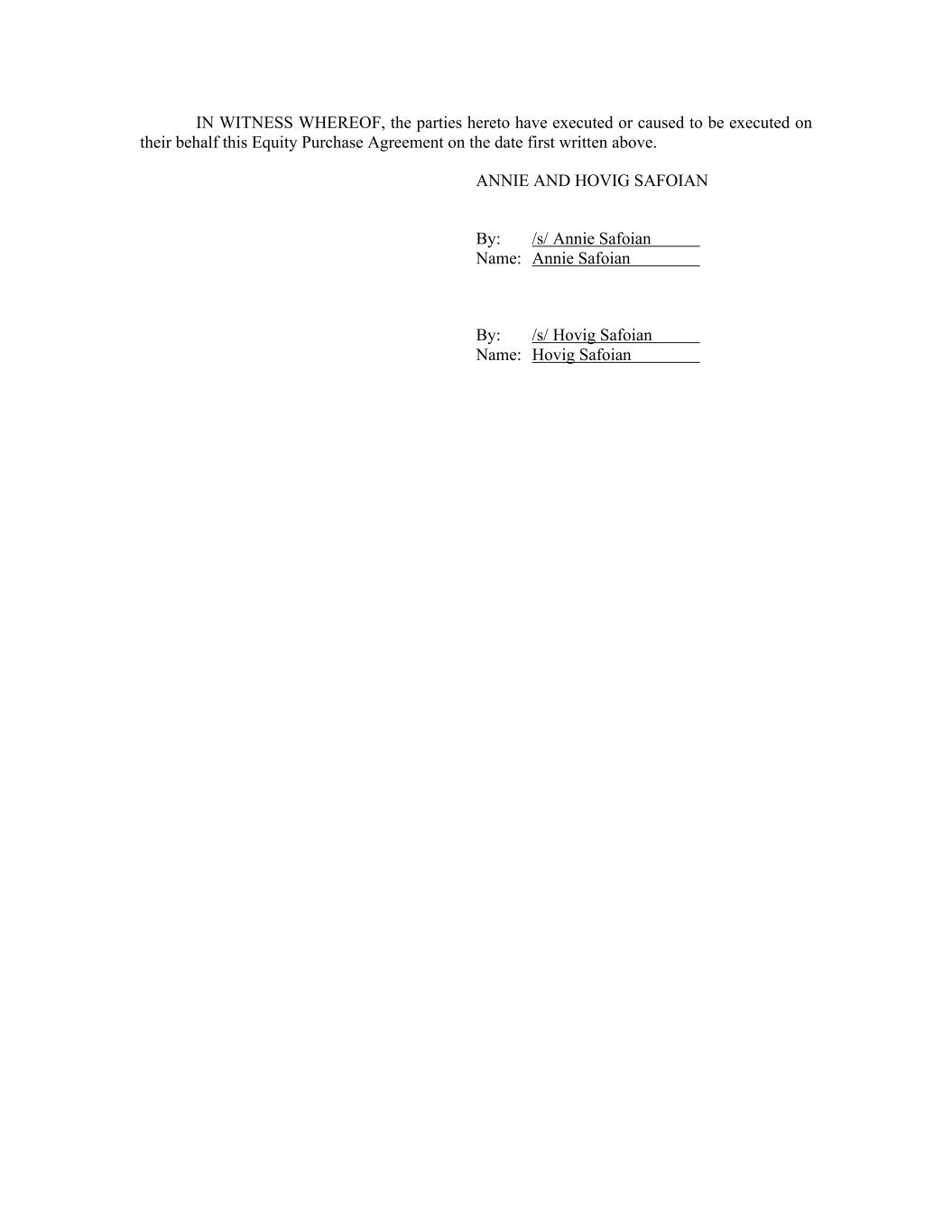 IN WITNESS WHEREOF, the parties hereto have executed or caused to be executed on their behalf this Equity Purchase Agreement on the date first written above. ANNIE AND HOVIG SAFOIAN By: /s/ Annie Safoian Name: Annie Safoian By: /s/ Hovig Safoian Name: Hovig Safoian