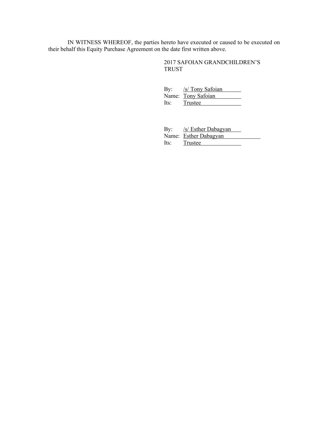 IN WITNESS WHEREOF, the parties hereto have executed or caused to be executed on their behalf this Equity Purchase Agreement on the date first written above. 2017 SAFOIAN GRANDCHILDREN’S TRUST By: /s/ Tony Safoian Name: Tony Safoian Its: Trustee By: /s/ Esther Dabagyan Name: Esther Dabagyan Its: Trustee