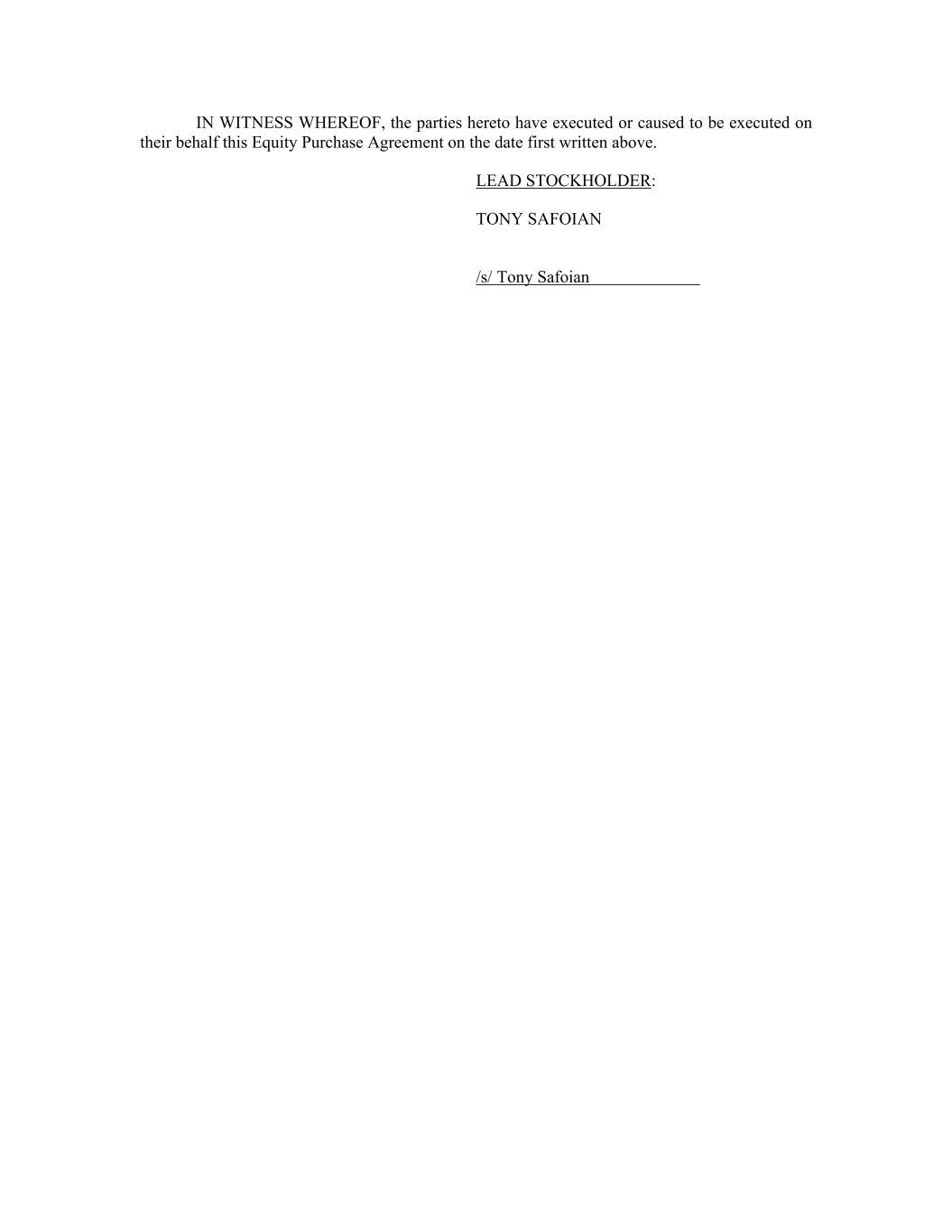 IN WITNESS WHEREOF, the parties hereto have executed or caused to be executed on their behalf this Equity Purchase Agreement on the date first written above. LEAD STOCKHOLDER: TONY SAFOIAN /s/ Tony Safoian
