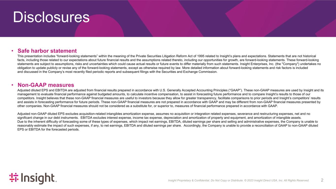 2Insight Proprietary & Confidential. Do Not Copy or Distribute. © 2023 Insight Direct USA, Inc. All Rights Reserved.Insight Proprietary & Confidential. Do Not Copy or Distribute. © 2022 Insight Direct USA, Inc. All Rights Reserved. 23 • Safe harbor statement This presentation includes “forward-looking statements” within the meaning of the Private Securities Litigation Reform Act of 1995 related to Insight’s plans and expectations. Statements that are not historical facts, including those related to our expectations about future financial results and the assumptions related thereto, including our opportunities for growth, are forward-looking statements. These forward-looking statements are subject to assumptions, risks and uncertainties which could cause actual results or future events to differ materially from such statements. Insight Enterprises, Inc. (the "Company") undertakes no obligation to update publicly or revise any of the forward-looking statements, except as otherwise required by law. More detailed information about forward-looking statements and risk factors is included and discussed in the Company’s most recently filed periodic reports and subsequent filings with the Securities and Exchange Commission. • Non-GAAP measures Adjusted diluted EPS and EBITDA are adjusted from financial results prepared in accordance with U.S. Generally Accepted Accounting Principles (“GAAP”). These non-GAAP measures are used by Insight and its management to evaluate financial performance against budgeted amounts, to calculate incentive compensation, to assist in forecasting future performance and to compare Insight’s results to those of our competitors. Insight believes that these non-GAAP financial measures are useful to investors because they allow for greater transparency, facilitate comparisons to prior periods and Insight’s competitors’ results and assists in forecasting performance for future periods. These non-GAAP financial measures are not prepared in accordance with GAAP and may be different from non-GAAP financial measures presented by other companies. Non-GAAP financial measures should not be considered as a substitute for, or superior to, measures of financial performance prepared in accordance with GAAP. Adjusted non-GAAP diluted EPS excludes acquisition-related intangibles amortization expense, assumes no acquisition or integration related expenses, severance and restructuring expenses, net and no significant change in our debt instruments. EBITDA excludes interest expense, income tax expense, depreciation and amortization of property and equipment, and amortization of intangible assets. Due to the inherent difficulty of forecasting some of these types of expenses, which impact net earnings, EBITDA, diluted earnings per share and selling and administrative expenses, the Company is unable to reasonably estimate the impact of such expenses, if any, to net earnings, EBITDA and diluted earnings per share. Accordingly, the Company is unable to provide a reconciliation of GAAP to non-GAAP diluted EPS or EBITDA for the forecasted periods. Disclosures