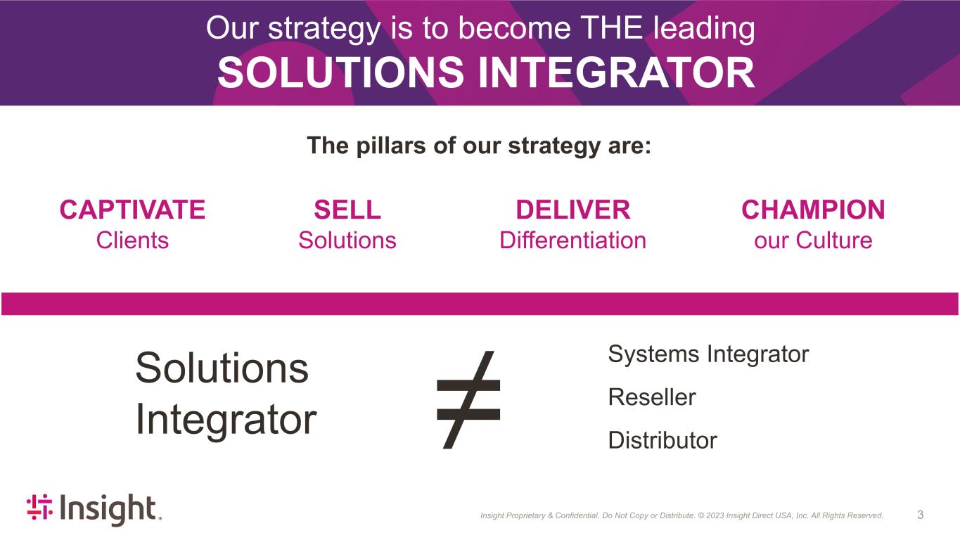 3Insight Proprietary & Confidential. Do Not Copy or Distribute. © 2023 Insight Direct USA, Inc. All Rights Reserved.Insight Proprietary & Confidential. Do Not Copy or Distribute. © 2022 Insight Direct USA, Inc. All Rights Reserved. 33 Our strategy is to become THE leading SOLUTIONS INTEGRATOR Solutions Integrator Systems Integrator Reseller Distributor≠ CAPTIVATE Clients SELL Solutions DELIVER Differentiation CHAMPION our Culture The pillars of our strategy are: