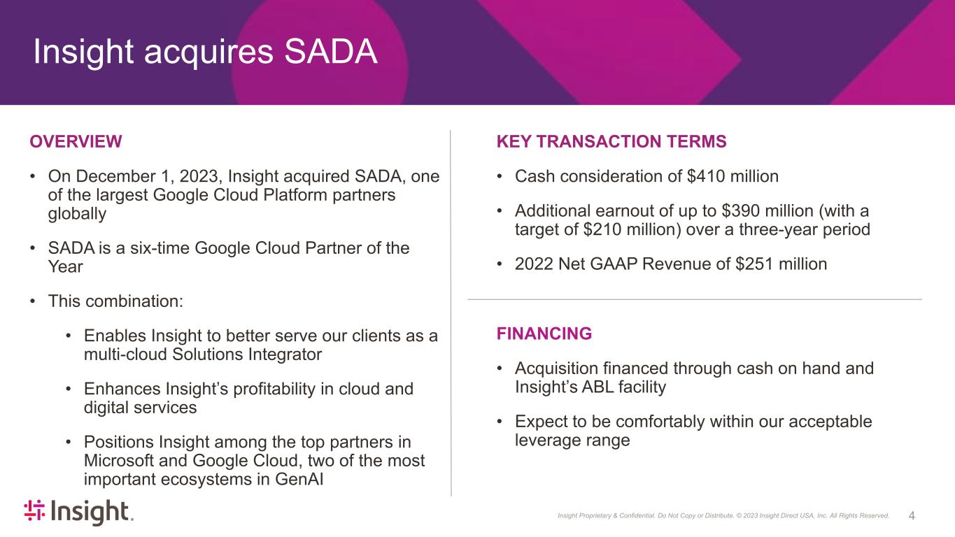 1Insight Proprietary & Confidential. Do Not Copy or Distribute. © 2023 Insight Direct USA, Inc. All Rights Reserved. Insight Enterprises Acquires SADA Conference Call and Webcast