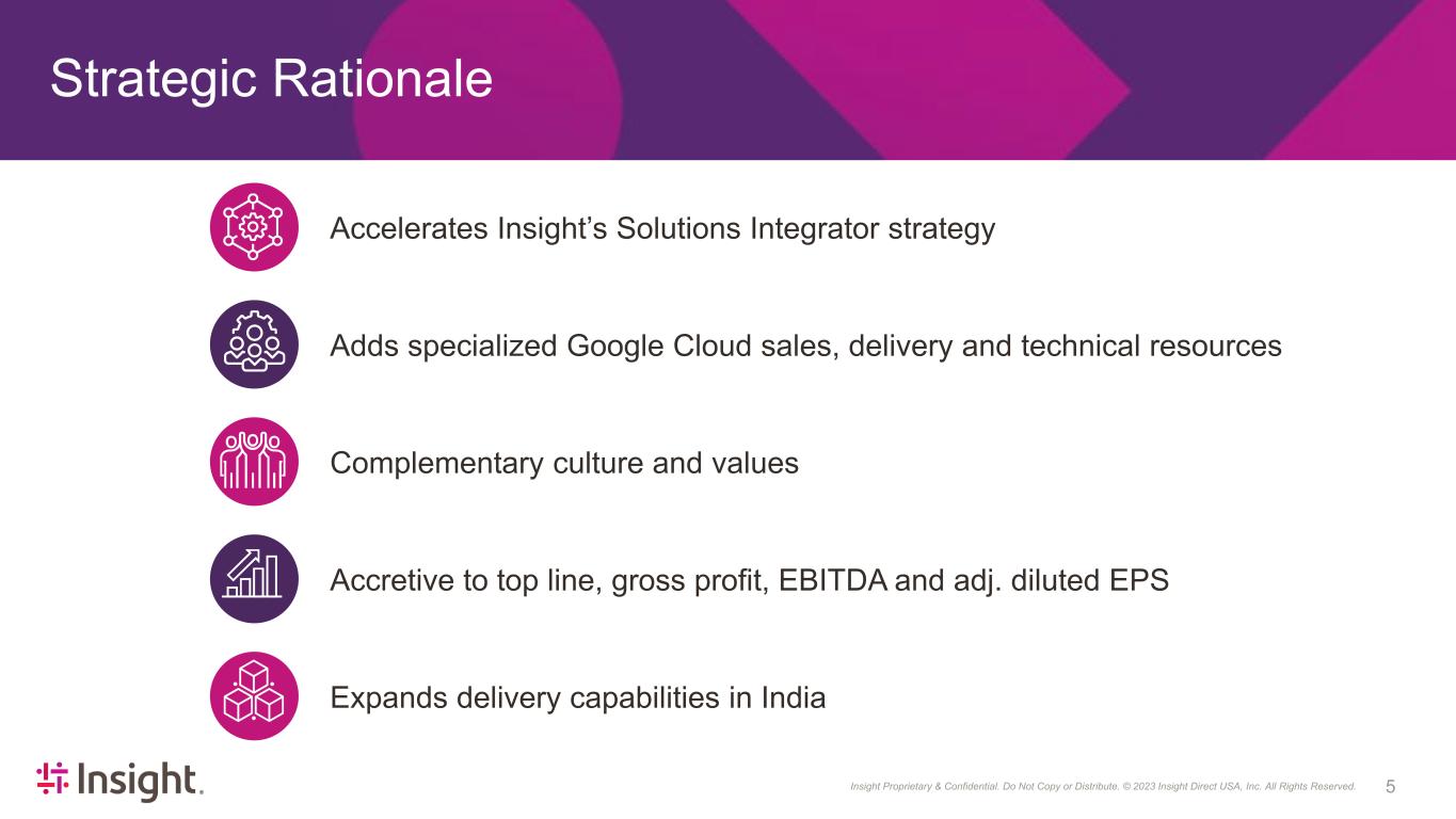 4Insight Proprietary & Confidential. Do Not Copy or Distribute. © 2023 Insight Direct USA, Inc. All Rights Reserved. Insight acquires SADA OVERVIEW • On December 1, 2023, Insight acquired SADA, one of the largest Google Cloud Platform partners globally • SADA is a six-time Google Cloud Partner of the Year • This combination: • Enables Insight to better serve our clients as a multi-cloud Solutions Integrator • Enhances Insight’s profitability in cloud and digital services • Positions Insight among the top partners in Microsoft and Google Cloud, two of the most important ecosystems in GenAI KEY TRANSACTION TERMS • Cash consideration of $410 million • Additional earnout of up to $390 million (with a target of $210 million) over a three-year period • 2022 Net GAAP Revenue of $251 million FINANCING • Acquisition financed through cash on hand and Insight’s ABL facility • Expect to be comfortably within our acceptable leverage range