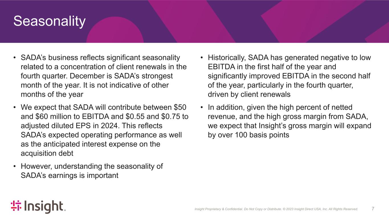 7Insight Proprietary & Confidential. Do Not Copy or Distribute. © 2023 Insight Direct USA, Inc. All Rights Reserved.Insight Proprietary & Confidential. Do Not Copy or Distribute. © 2022 Insight Direct USA, Inc. All Rights Reserved. 73 Seasonality • SADA’s business reflects significant seasonality related to a concentration of client renewals in the fourth quarter. December is SADA’s strongest month of the year. It is not indicative of other months of the year • We expect that SADA will contribute between $50 and $60 million to EBITDA and $0.55 and $0.75 to adjusted diluted EPS in 2024. This reflects SADA’s expected operating performance as well as the anticipated interest expense on the acquisition debt • However, understanding the seasonality of SADA’s earnings is important • Historically, SADA has generated negative to low EBITDA in the first half of the year and significantly improved EBITDA in the second half of the year, particularly in the fourth quarter, driven by client renewals • In addition, given the high percent of netted revenue, and the high gross margin from SADA, we expect that Insight’s gross margin will expand by over 100 basis points