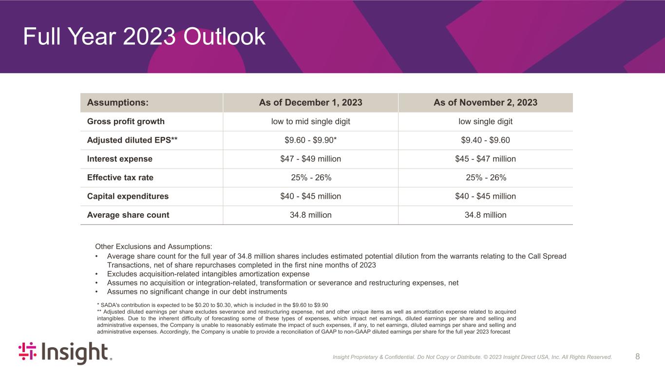 8Insight Proprietary & Confidential. Do Not Copy or Distribute. © 2023 Insight Direct USA, Inc. All Rights Reserved.Insight Proprietary & Confidential. Do Not Copy or Distribute. © 2022 Insight Direct USA, Inc. All Rights Reserved. 83 Assumptions: As of December 1, 2023 As of November 2, 2023 Gross profit growth low to mid single digit low single digit Adjusted diluted EPS** $9.60 - $9.90* $9.40 - $9.60 Interest expense $47 - $49 million $45 - $47 million Effective tax rate 25% - 26% 25% - 26% Capital expenditures $40 - $45 million $40 - $45 million Average share count 34.8 million 34.8 million Other Exclusions and Assumptions: • Average share count for the full year of 34.8 million shares includes estimated potential dilution from the warrants relating to the Call Spread Transactions, net of share repurchases completed in the first nine months of 2023 • Excludes acquisition-related intangibles amortization expense • Assumes no acquisition or integration-related, transformation or severance and restructuring expenses, net • Assumes no significant change in our debt instruments * SADA's contribution is expected to be $0.20 to $0.30, which is included in the $9.60 to $9.90 ** Adjusted diluted earnings per share excludes severance and restructuring expense, net and other unique items as well as amortization expense related to acquired intangibles. Due to the inherent difficulty of forecasting some of these types of expenses, which impact net earnings, diluted earnings per share and selling and administrative expenses, the Company is unable to reasonably estimate the impact of such expenses, if any, to net earnings, diluted earnings per share and selling and administrative expenses. Accordingly, the Company is unable to provide a reconciliation of GAAP to non-GAAP diluted earnings per share for the full year 2023 forecast Full Year 2023 Outlook