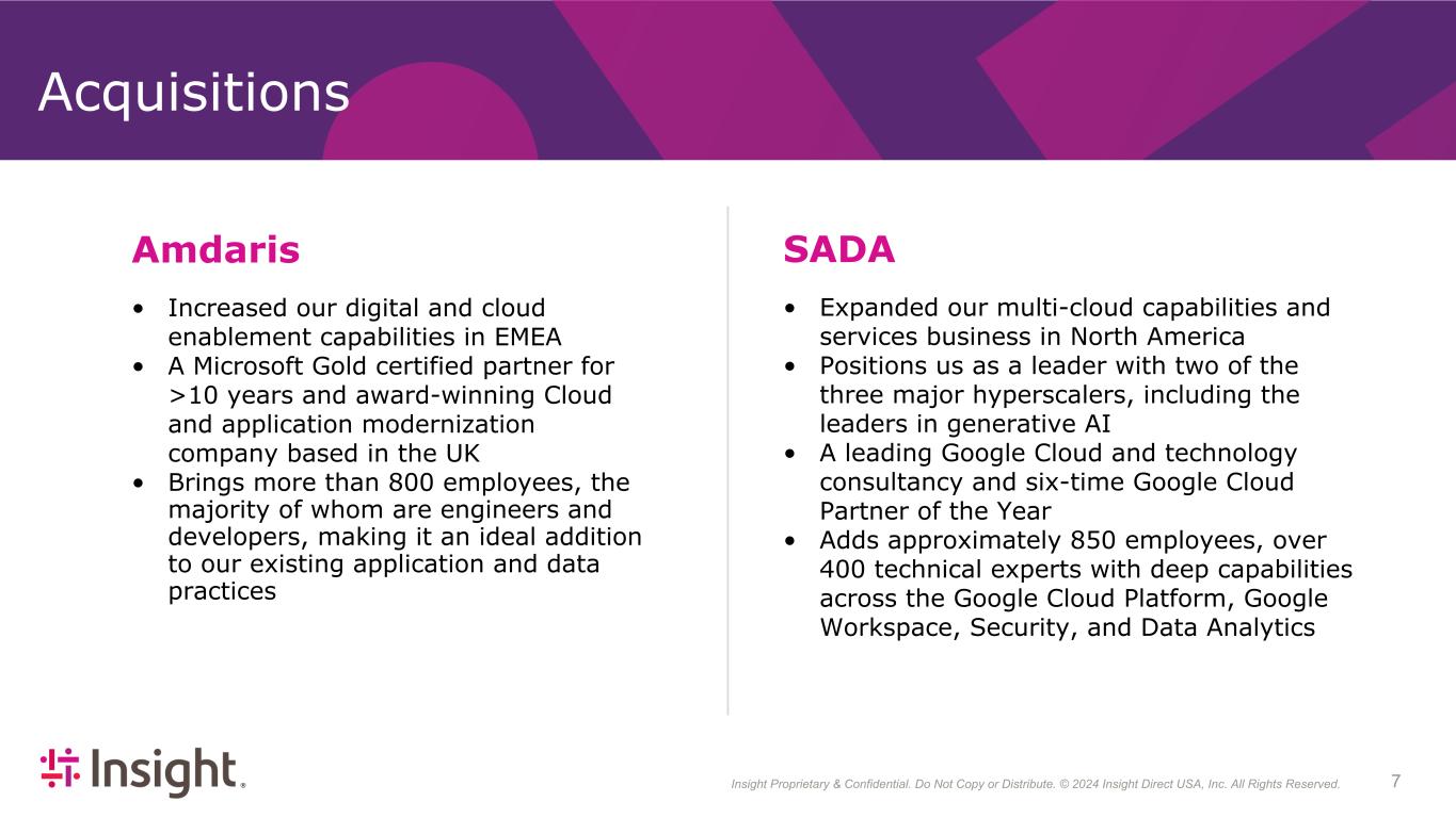Insight Proprietary & Confidential. Do Not Copy or Distribute. © 2022 Insight Direct USA, Inc. All Rights Reserved. 74 Acquisitions Amdaris • Increased our digital and cloud enablement capabilities in EMEA • A Microsoft Gold certified partner for >10 years and award-winning Cloud and application modernization company based in the UK • Brings more than 800 employees, the majority of whom are engineers and developers, making it an ideal addition to our existing application and data practices SADA • Expanded our multi-cloud capabilities and services business in North America • Positions us as a leader with two of the three major hyperscalers, including the leaders in generative AI • A leading Google Cloud and technology consultancy and six-time Google Cloud Partner of the Year • Adds approximately 850 employees, over 400 technical experts with deep capabilities across the Google Cloud Platform, Google Workspace, Security, and Data Analytics
