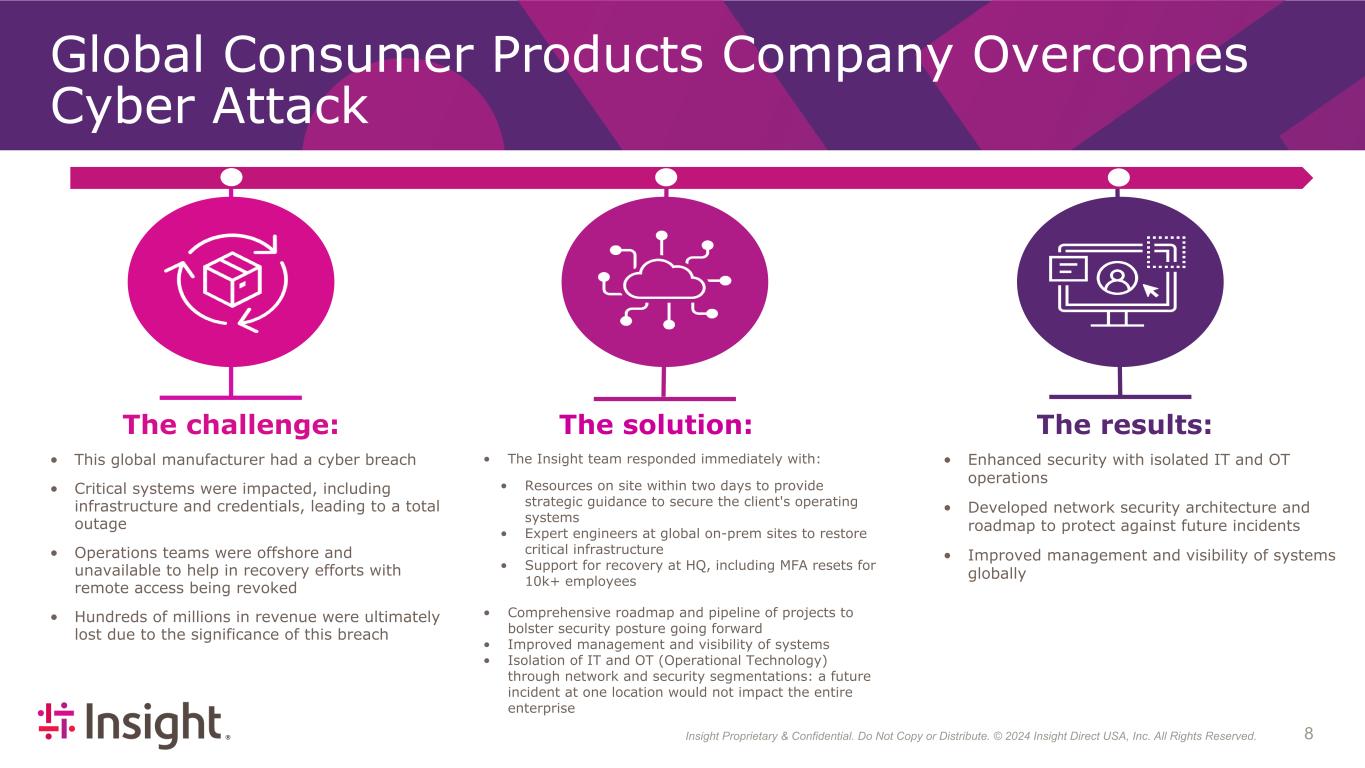 Insight Proprietary & Confidential. Do Not Copy or Distribute. © 2022 Insight Direct USA, Inc. All Rights Reserved. 84 Global Consumer Products Company Overcomes Cyber Attack The challenge: The results: • This global manufacturer had a cyber breach • Critical systems were impacted, including infrastructure and credentials, leading to a total outage • Operations teams were offshore and unavailable to help in recovery efforts with remote access being revoked • Hundreds of millions in revenue were ultimately lost due to the significance of this breach • Enhanced security with isolated IT and OT operations • Developed network security architecture and roadmap to protect against future incidents • Improved management and visibility of systems globally The solution: • The Insight team responded immediately with: • Resources on site within two days to provide strategic guidance to secure the client's operating systems • Expert engineers at global on-prem sites to restore critical infrastructure • Support for recovery at HQ, including MFA resets for 10k+ employees • Comprehensive roadmap and pipeline of projects to bolster security posture going forward • Improved management and visibility of systems • Isolation of IT and OT (Operational Technology) through network and security segmentations: a future incident at one location would not impact the entire enterprise