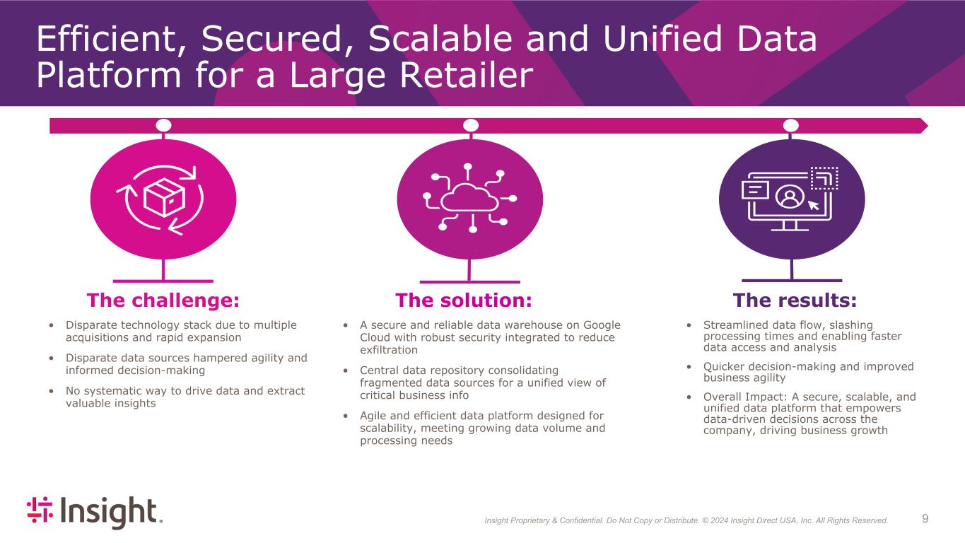 Insight Proprietary & Confidential. Do Not Copy or Distribute. © 2022 Insight Direct USA, Inc. All Rights Reserved. 94 Efficient, Secured, Scalable and Unified Data Platform for a Large Retailer The challenge: The results: • Disparate technology stack due to multiple acquisitions and rapid expansion • Disparate data sources hampered agility and informed decision-making • No systematic way to drive data and extract valuable insights • Streamlined data flow, slashing processing times and enabling faster data access and analysis • Quicker decision-making and improved business agility • Overall Impact: A secure, scalable, and unified data platform that empowers data-driven decisions across the company, driving business growth • A secure and reliable data warehouse on Google Cloud with robust security integrated to reduce exfiltration • Central data repository consolidating fragmented data sources for a unified view of critical business info • Agile and efficient data platform designed for scalability, meeting growing data volume and processing needs The solution: