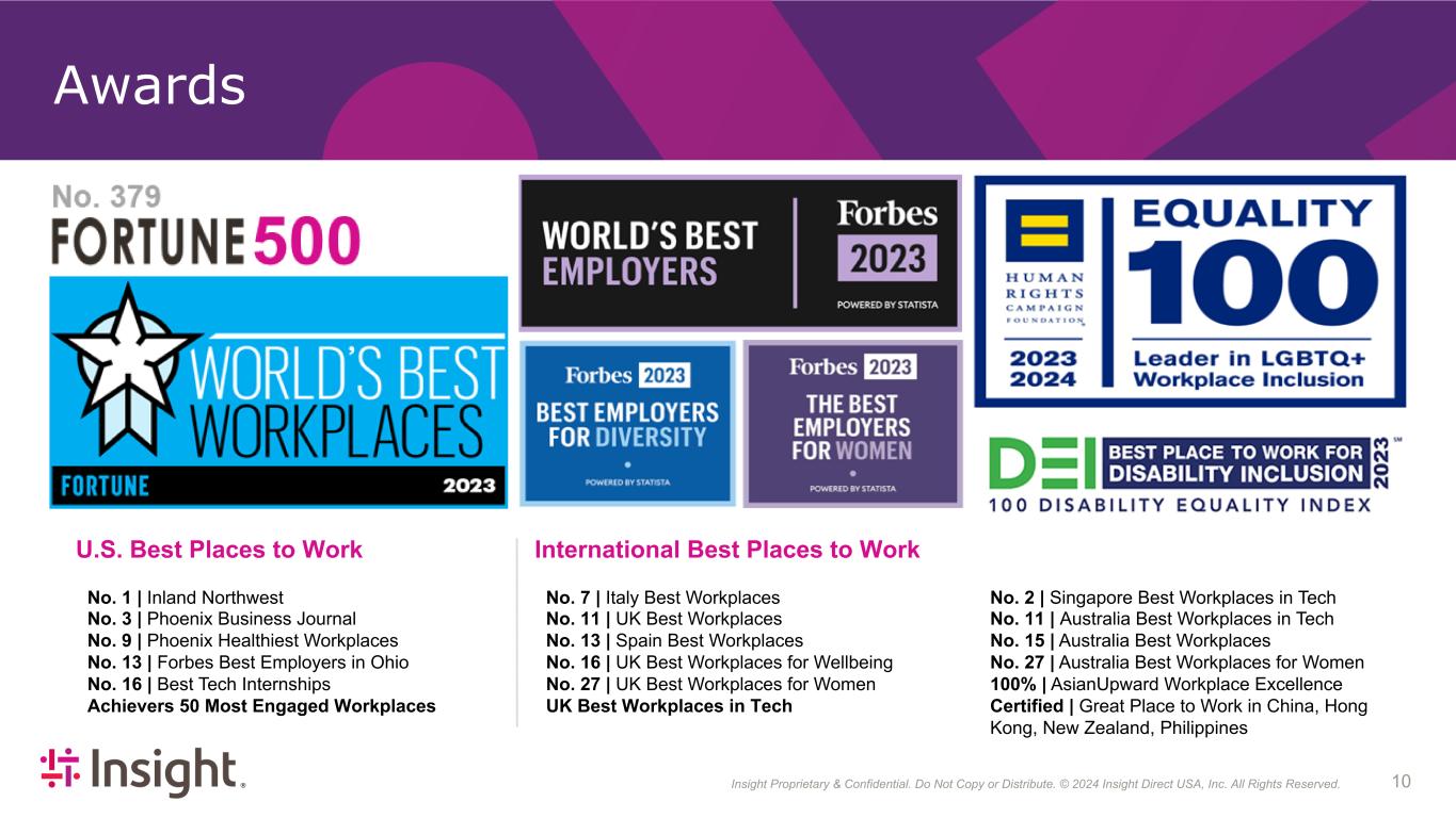 Insight Proprietary & Confidential. Do Not Copy or Distribute. © 2022 Insight Direct USA, Inc. All Rights Reserved. 104 Awards U.S. Best Places to Work International Best Places to Work No. 1 | Inland Northwest No. 3 | Phoenix Business Journal No. 9 | Phoenix Healthiest Workplaces No. 13 | Forbes Best Employers in Ohio No. 16 | Best Tech Internships Achievers 50 Most Engaged Workplaces No. 7 | Italy Best Workplaces No. 11 | UK Best Workplaces No. 13 | Spain Best Workplaces No. 16 | UK Best Workplaces for Wellbeing No. 27 | UK Best Workplaces for Women UK Best Workplaces in Tech No. 2 | Singapore Best Workplaces in Tech No. 11 | Australia Best Workplaces in Tech No. 15 | Australia Best Workplaces No. 27 | Australia Best Workplaces for Women 100% | AsianUpward Workplace Excellence Certified | Great Place to Work in China, Hong Kong, New Zealand, Philippines