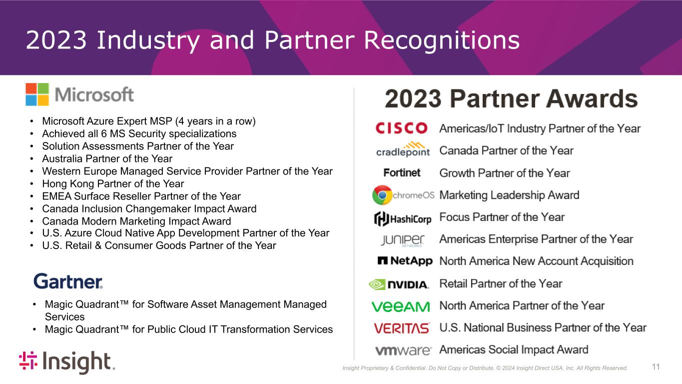 Insight Proprietary & Confidential. Do Not Copy or Distribute. © 2022 Insight Direct USA, Inc. All Rights Reserved. 114 2023 Industry and Partner Recognitions • Magic Quadrant™ for Software Asset Management Managed Services • Magic Quadrant™ for Public Cloud IT Transformation Services • Microsoft Azure Expert MSP (4 years in a row) • Achieved all 6 MS Security specializations • Solution Assessments Partner of the Year • Australia Partner of the Year • Western Europe Managed Service Provider Partner of the Year • Hong Kong Partner of the Year • EMEA Surface Reseller Partner of the Year • Canada Inclusion Changemaker Impact Award • Canada Modern Marketing Impact Award • U.S. Azure Cloud Native App Development Partner of the Year • U.S. Retail & Consumer Goods Partner of the Year